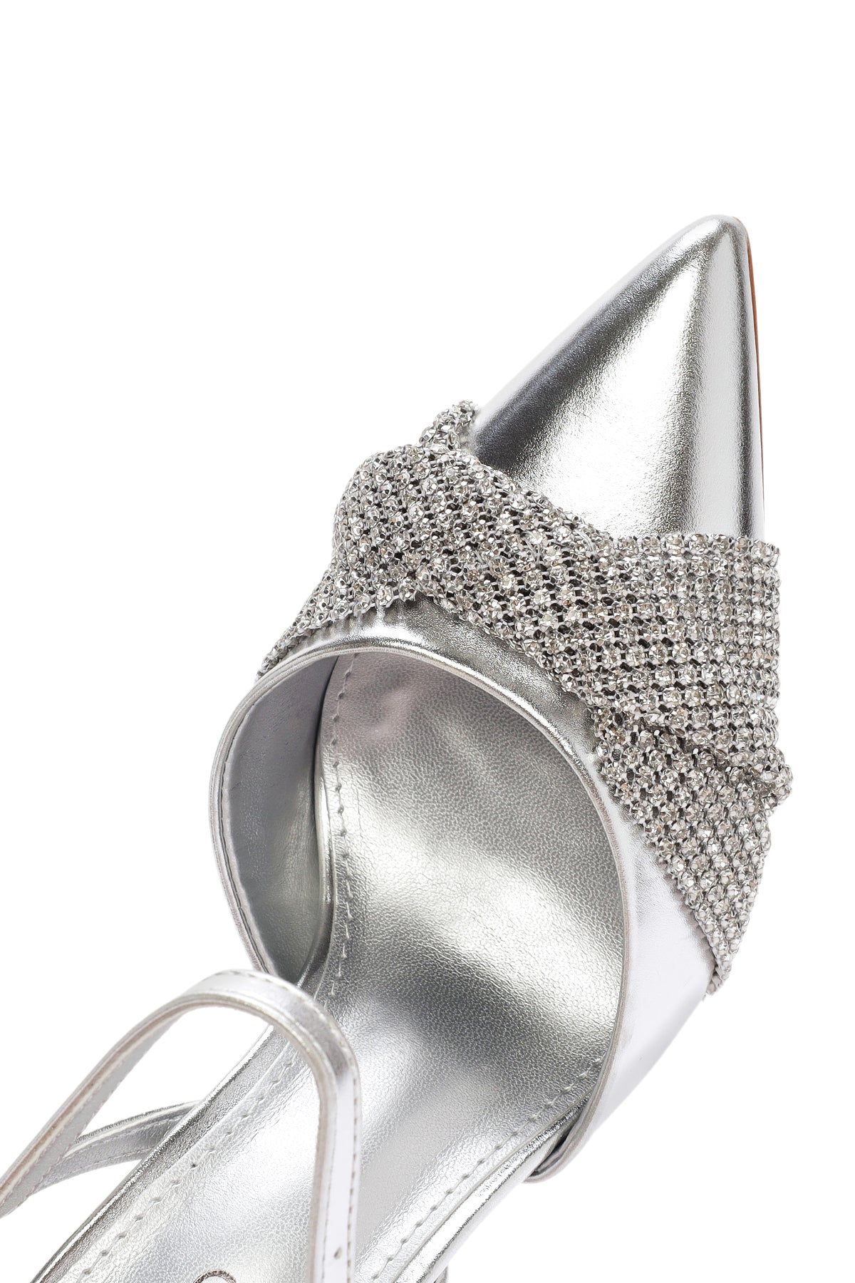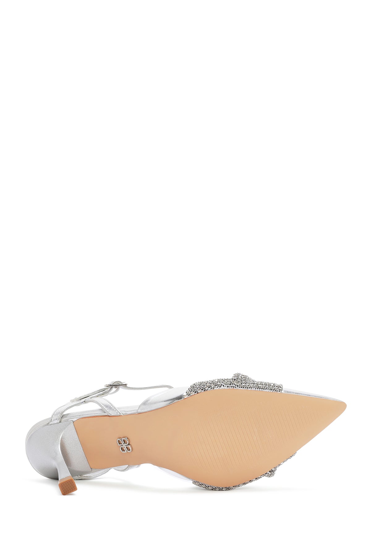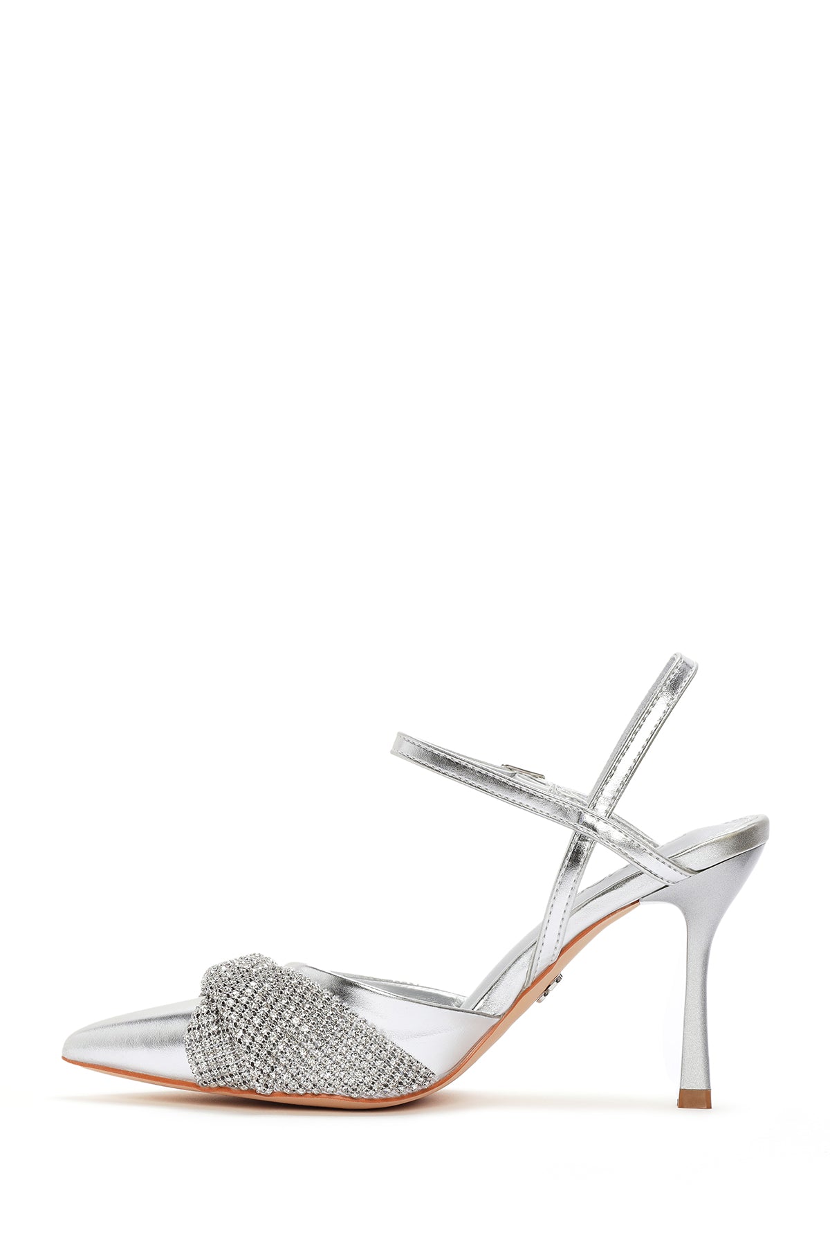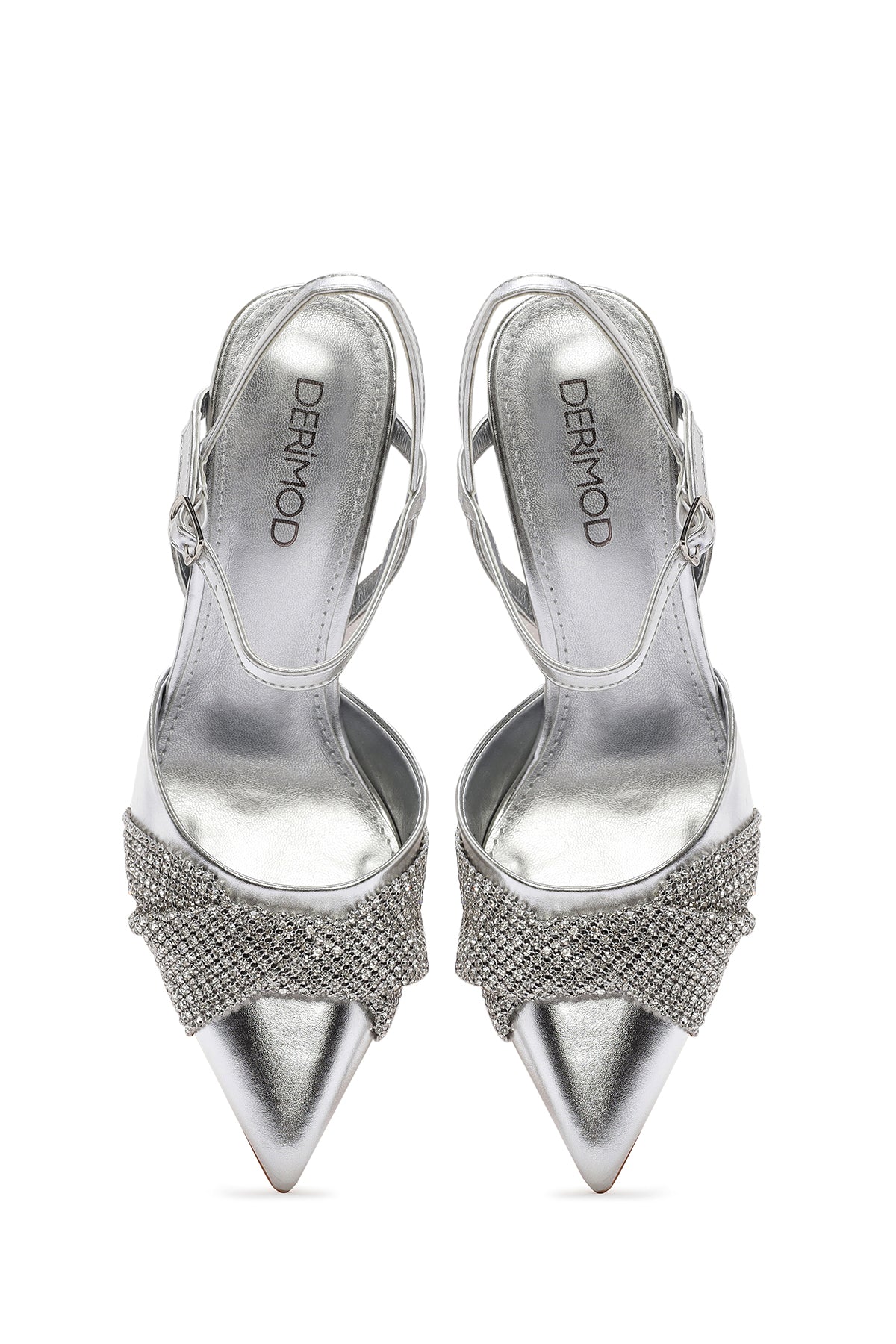 Kadın Gümüş Arkası Açık Yüksek Topuklu Taşlı Stiletto