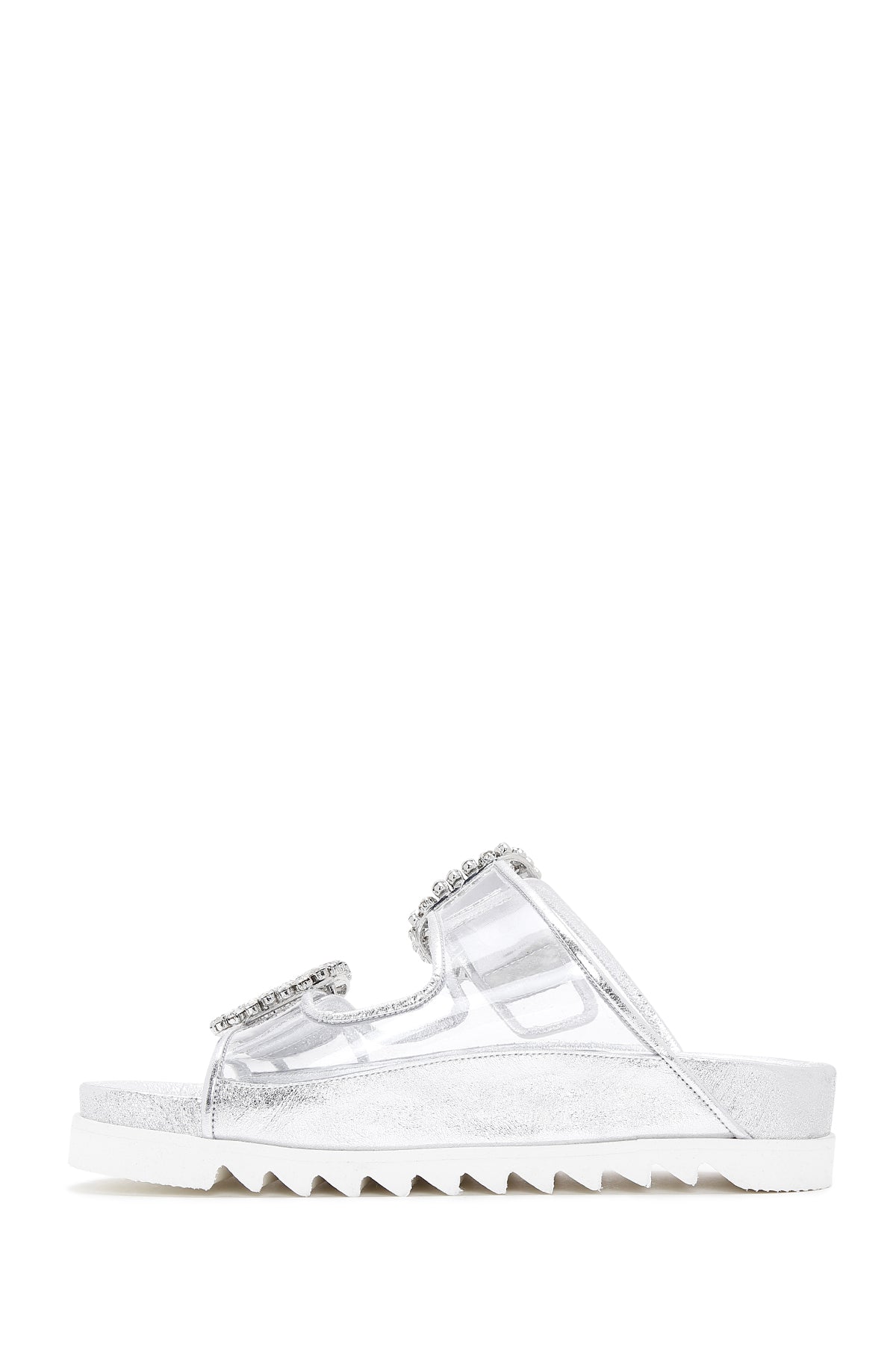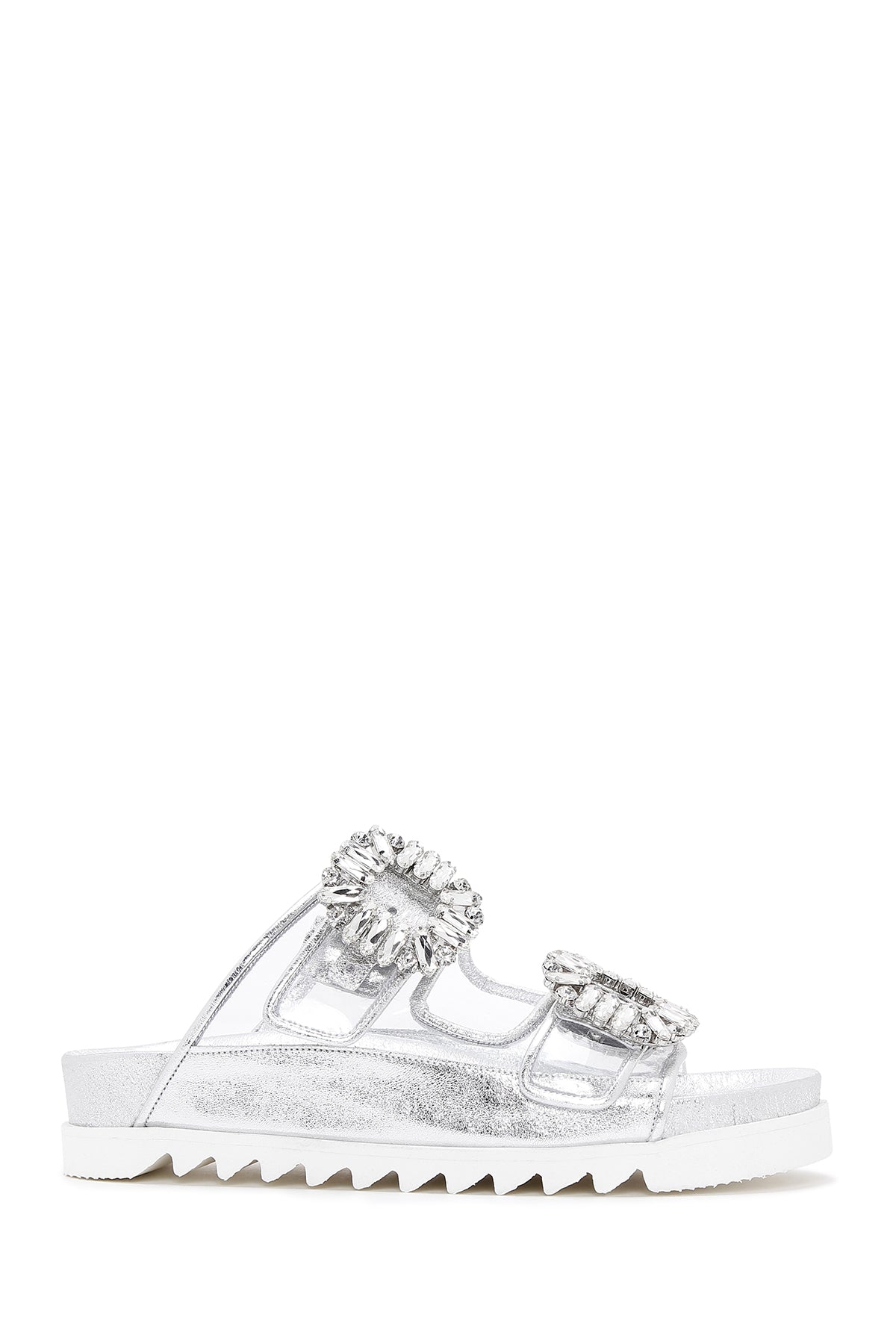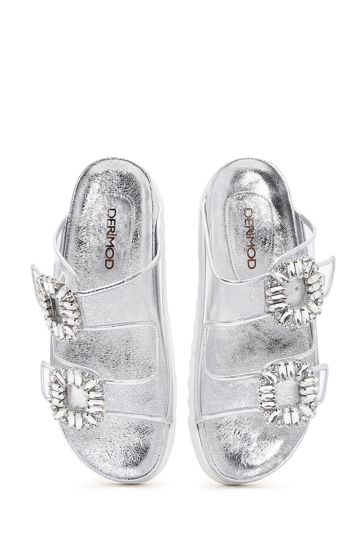 Derimod’un Zarif ve Şıklığı bir arada sunan Kadın Gümüş Deri Taşlı Şeffaf Terlik ile tarzınızı konuşturun. Ürünün kodu: 23SFD120414 GR