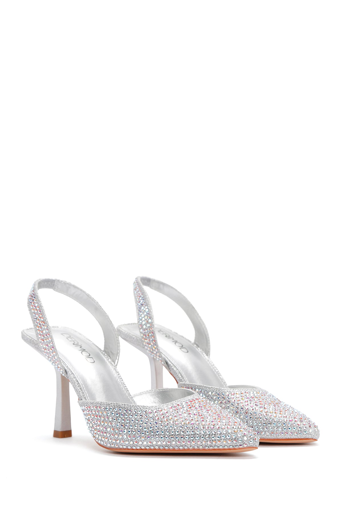 Kadın Gümüş Taşlı Arkası Açık Topuklu Ayakkabı