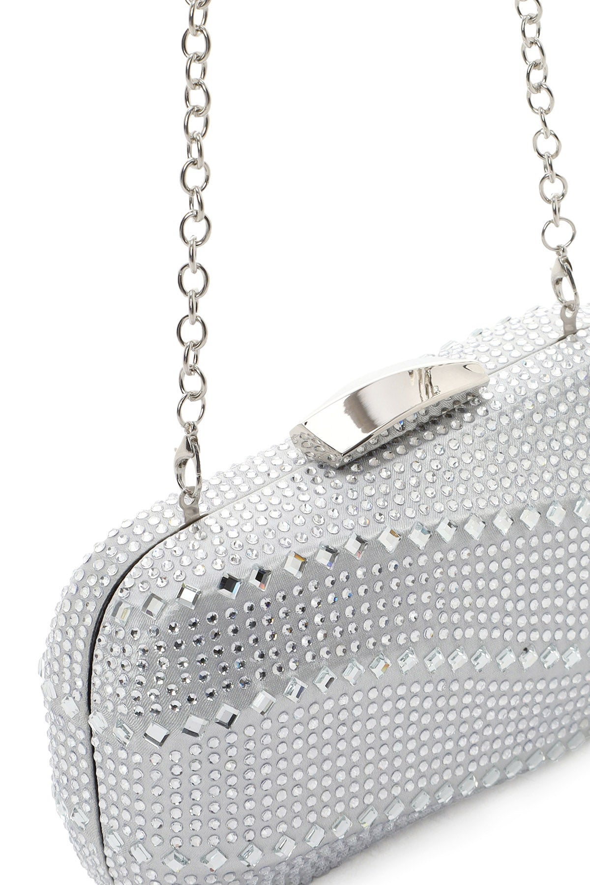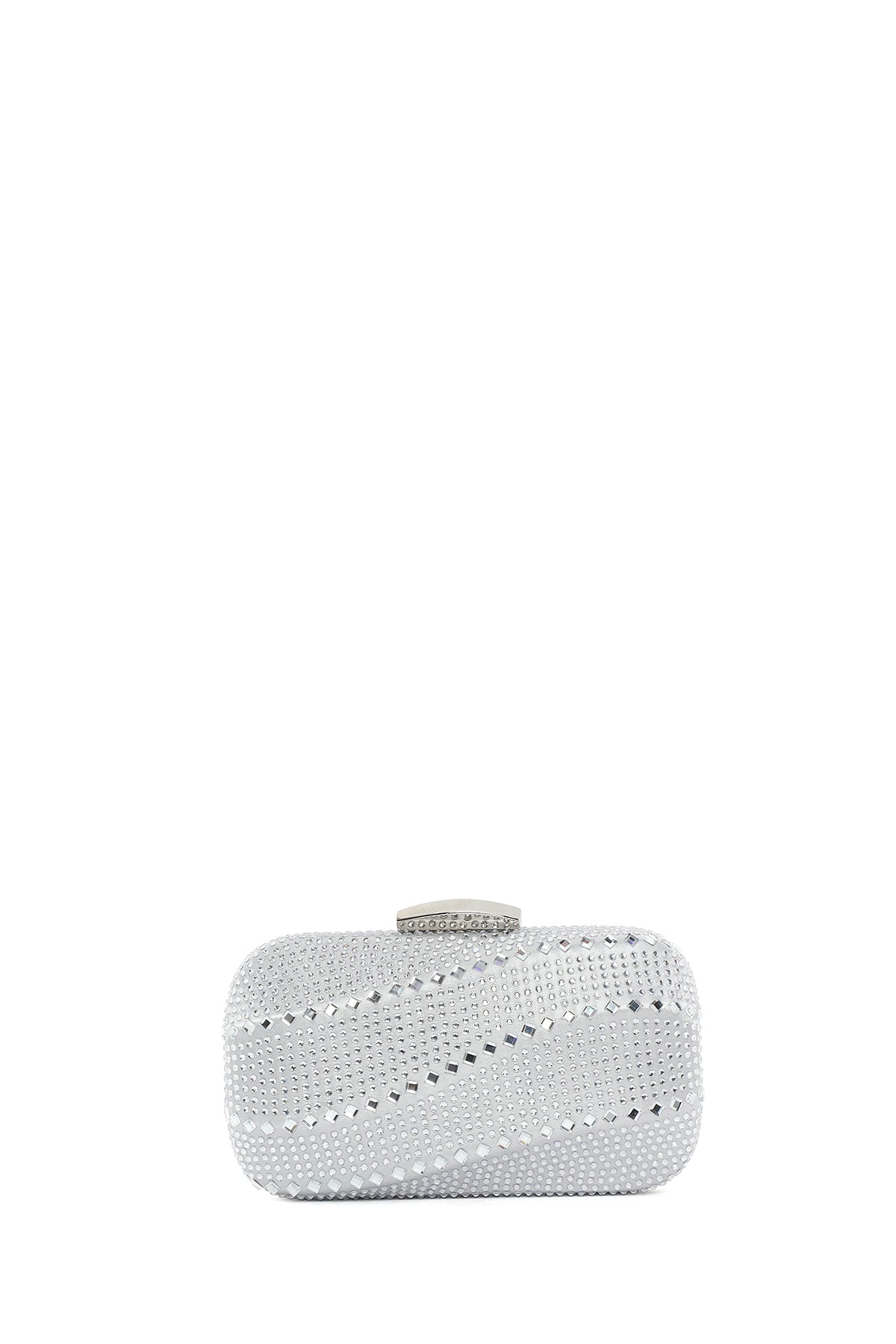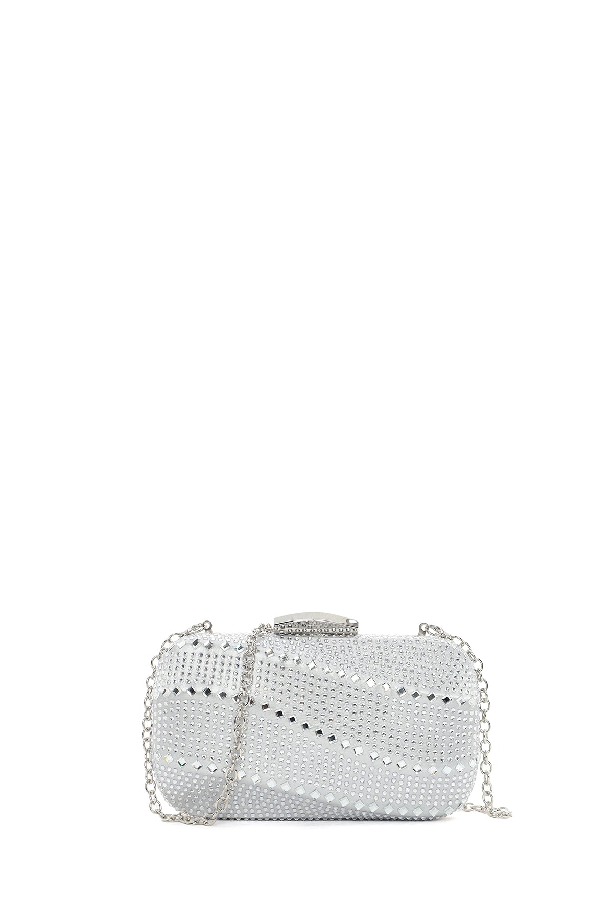 Kadın Gümüş Uzun Zincir Askılı Taşlı Mini Kutu Abiye Çanta