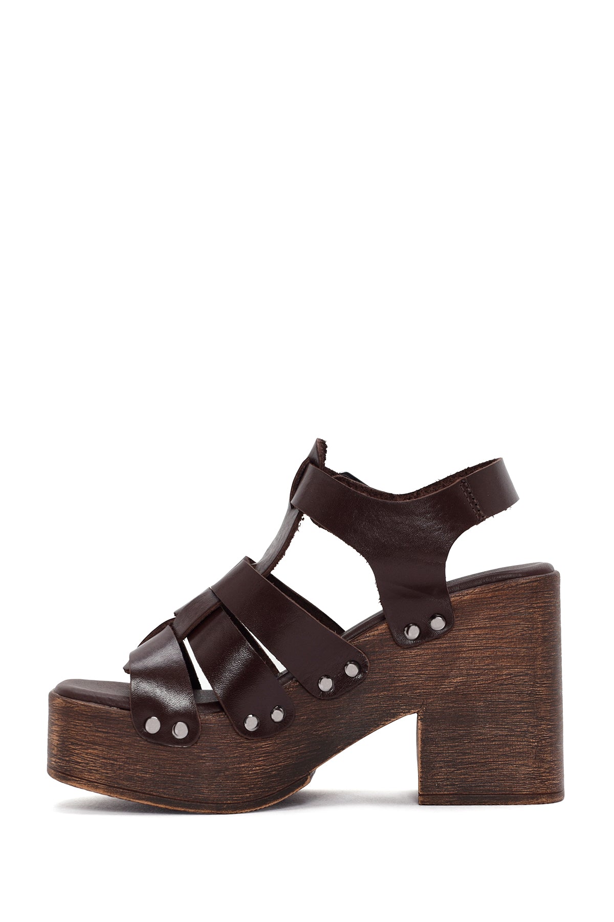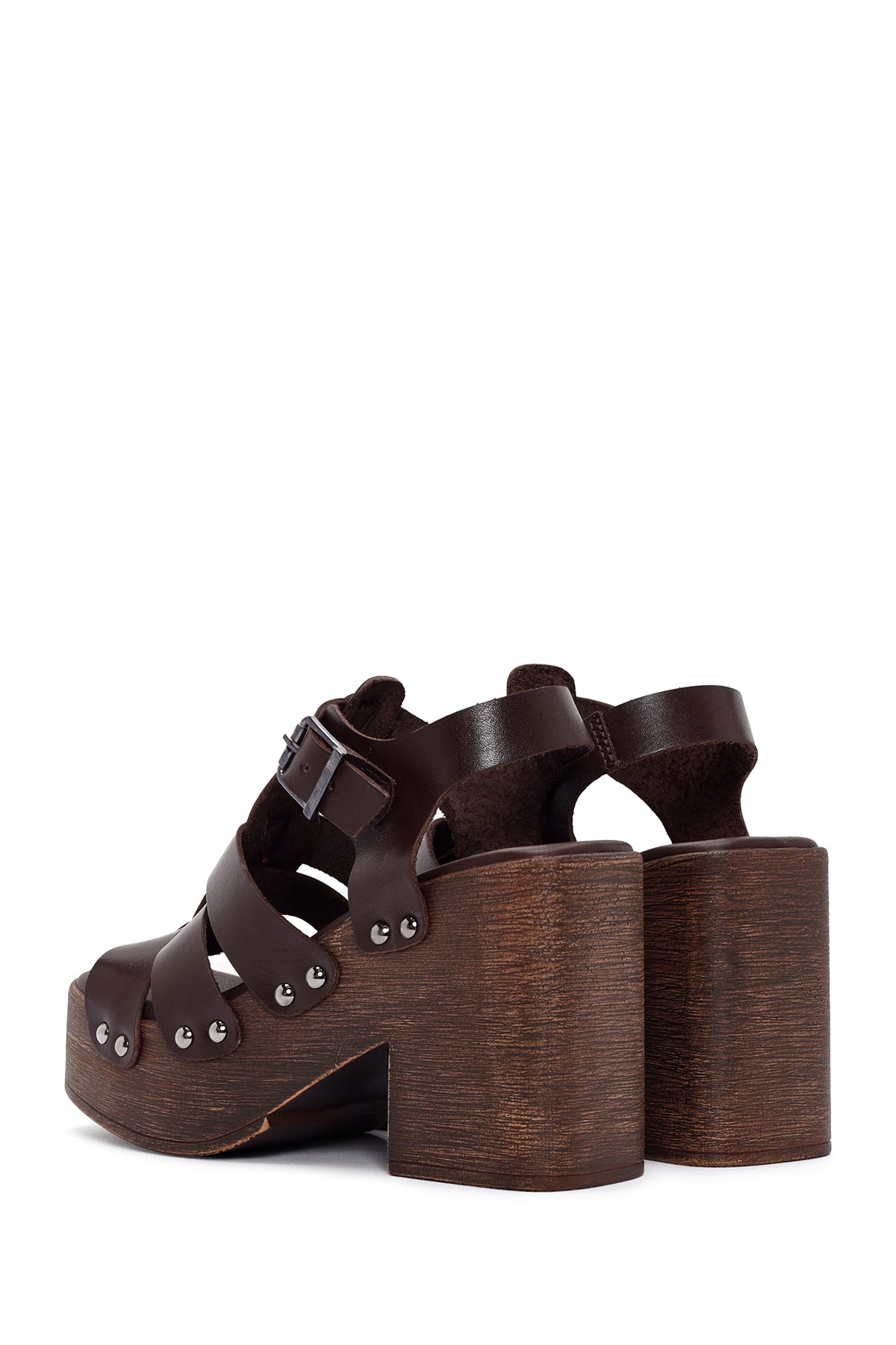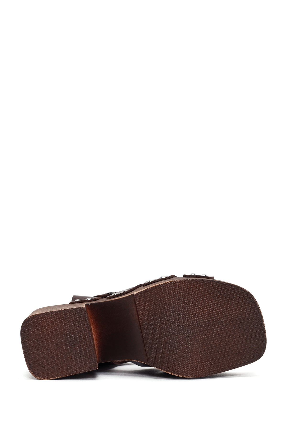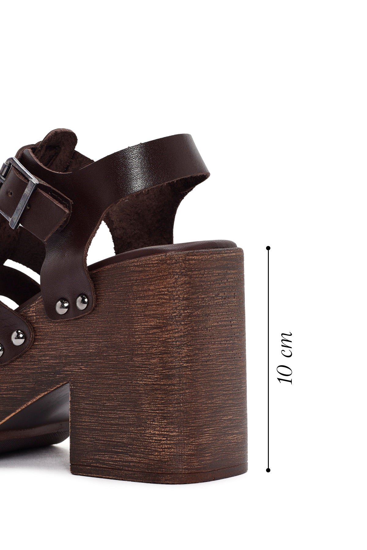 Kadın Kahverengi Kalın Topuklu Tokalı Deri Sandalet