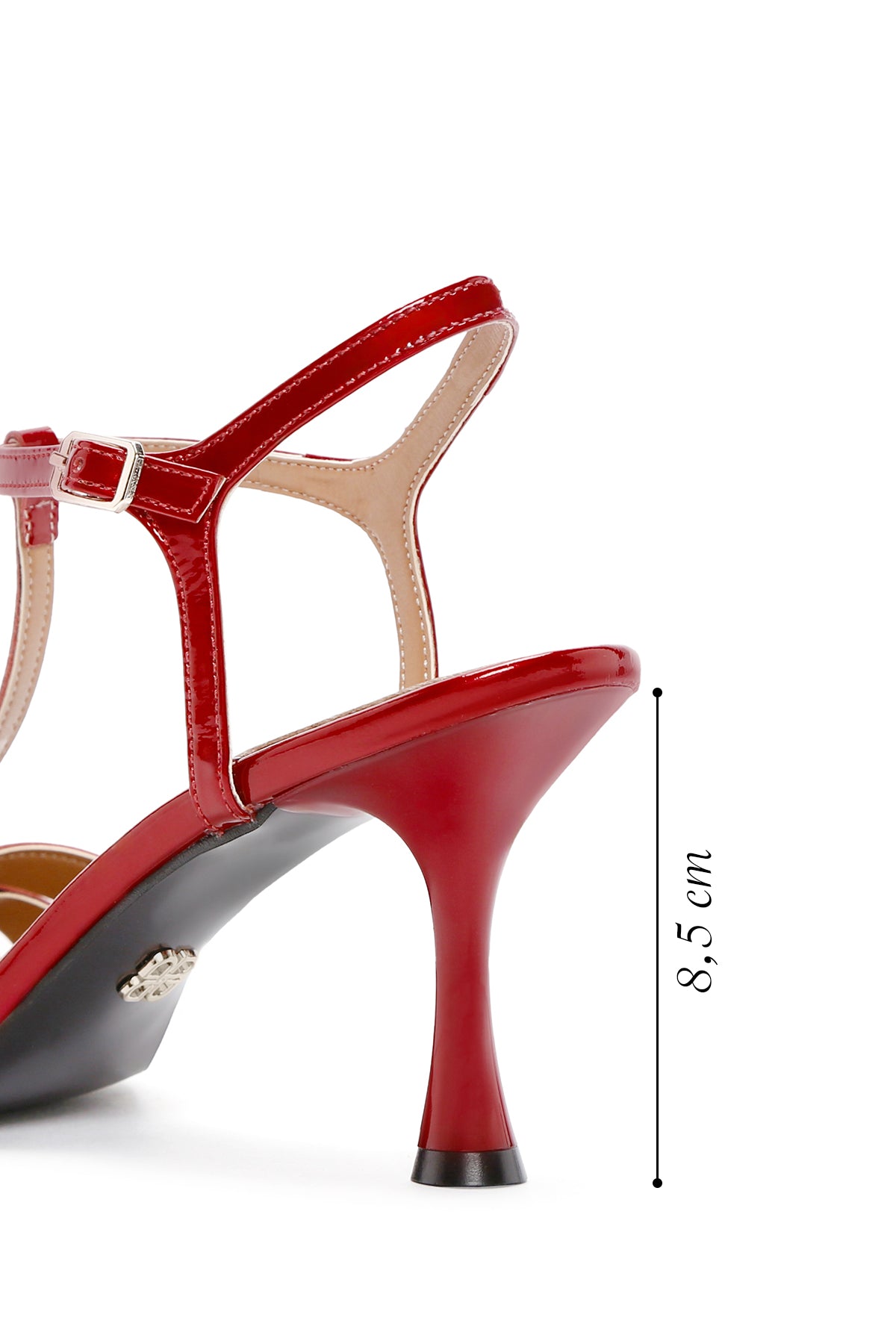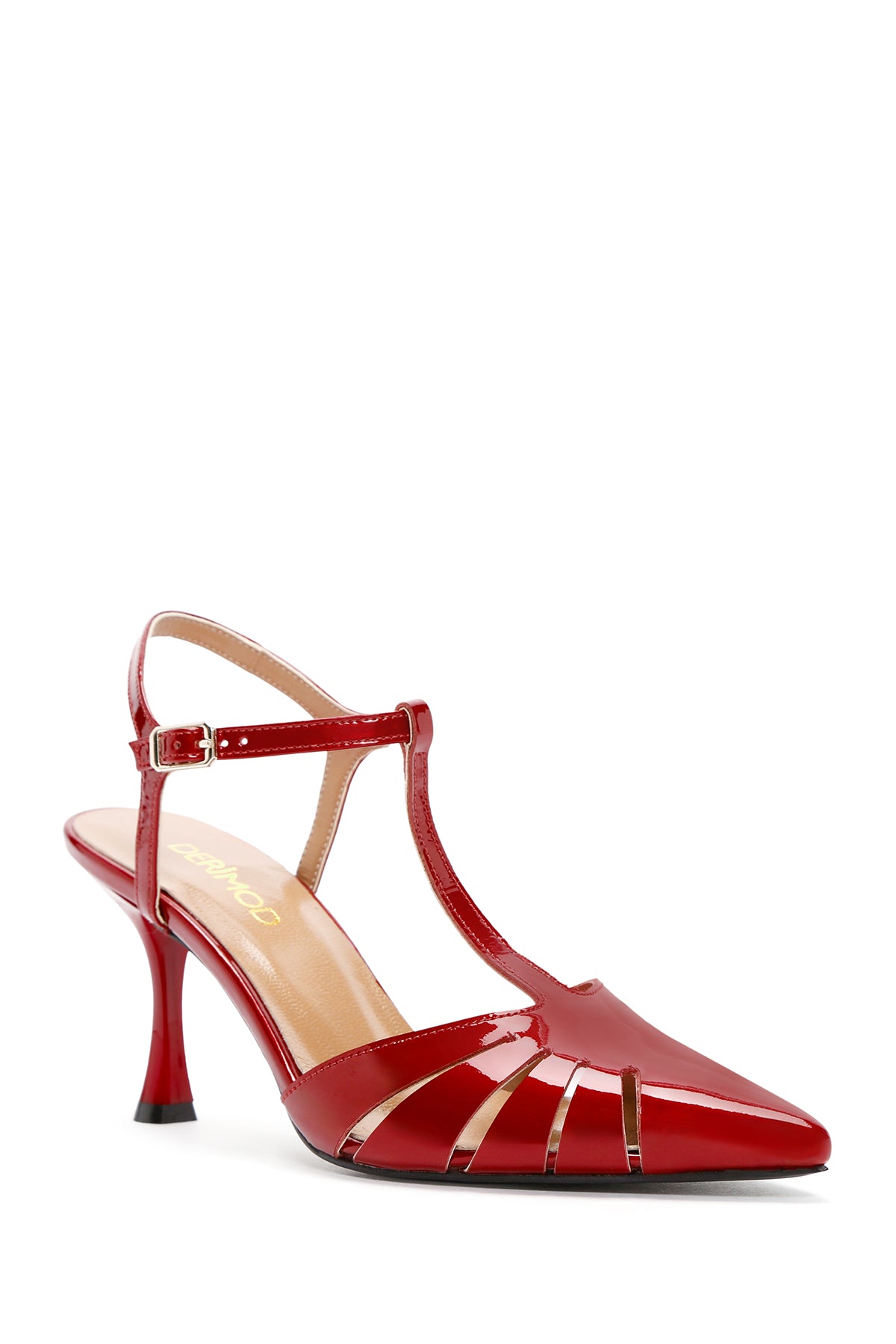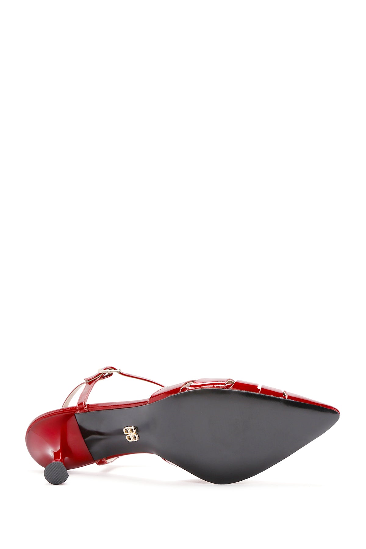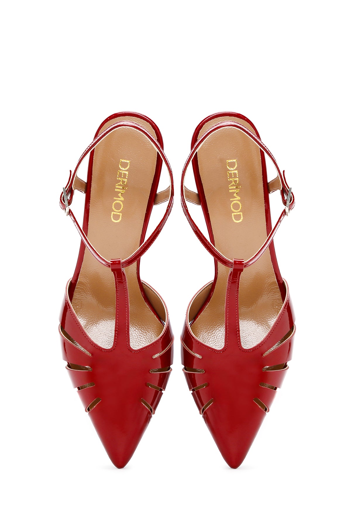 Kadın Kırmızı Bilekten Bantlı Arkası Açık İnce Topuklu Rugan Deri Ayakkabı
