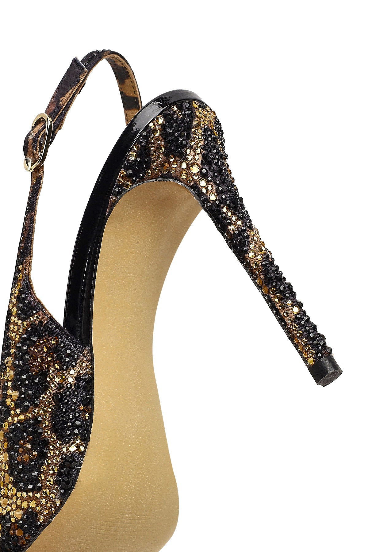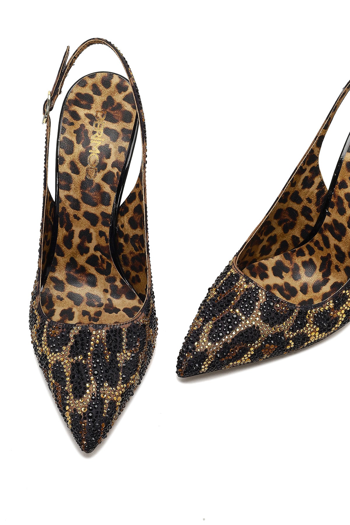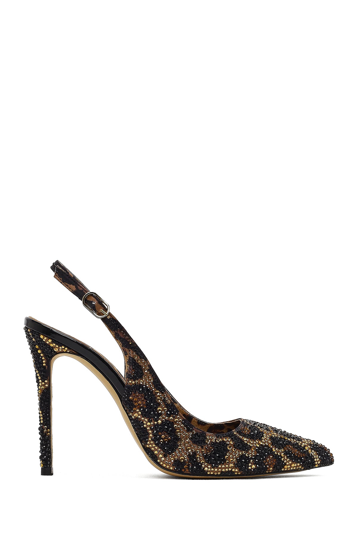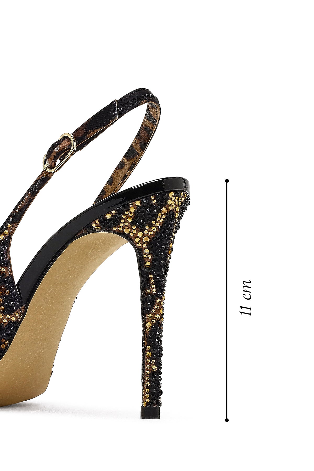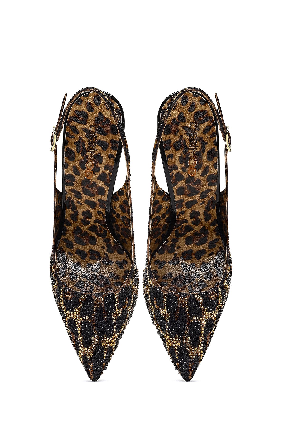 Leopar desenli deri yüzeyiyle göz alıcı görünüm sergileyen bu arkası açık ayakkabı, 11 cm yüksek ince topuk yapısıyla kadın ayağına zarif duruş kazandırır. Leopar desen özelliği doğal kahverengi tonlarında desenli doku sunarken, pointed toe burun formu ayağı uzun gösterir ve şık silüet yaratır. Altın rengi taş detayları ayakkabının ön kısmında parlak aksentler oluşturarak lüks görünüm sağlar ve ışık altında estetik yansımalar yaratır. Arkası açık slingback tasarımı ayak bileği çevresinde ince kayış detayıyla tamamlanır ve ayağı sabit tutar. Deri iç astar nefes alabilir yapısıyla günlük kullanımda ayak sağlığını destekler ve doğal malzeme özelliğiyle zamanla ayağa uyum sağlar. İnce stiletto topuk tasarımı modern çizgileriyle öne çıkar ve yan profilde zarif görünüm oluşturur. Leopar desenin klasik etkisi zamansız şıklık yaratırken, taş süslemelerin parıltısı dikkat çekici detay sunar. Pointed toe burun yapısı ayak parmaklarına uygun form verirken genel görünümde incelik hissi yaratır. Topuk arkası destek yapısı yürüyüş sırasında denge sağlar ve taban yapısı düz zemin temasında stabilite gösterir. Mevsim geçişlerine uygun yapısıyla farklı hava koşullarında kullanılabilir özellik sergiler. Akşam etkinliklerinde göz alıcı görünüm sağlarken, özel davetlerde şık tamamlayıcı rol oynar ve kombinlerde cesur stil yaratır. Ürün kodu: 25AFD1211TS
