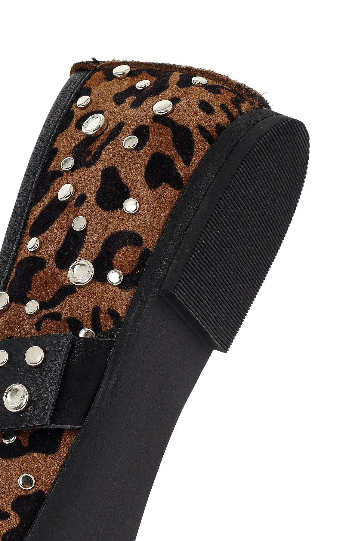 Derimod'un sonbahar koleksiyonundan, leopar desenli süet deri kullanılarak tasarlanan babet modeli, 1,5 cm yüksekliğindeki tabanı ile günlük kullanıma uygun bir tasarım sunuyor. Üst kısmındaki gümüş toka detayları ve klasik leopar deseniyle göz alıcı bir görünüm sergileyen model, deri iç astarı sayesinde ayağınızı rahat ettiriyor. Zamansız tasarımı ile ofisten günlük yaşama, iş toplantılarından casual davetlere kadar geniş bir kullanım alanı sunuyor. İlkbahar ve sonbahar mevsimlerinde günün her saatinde kullanılabilir. Ürün kodu: 25AFD270810