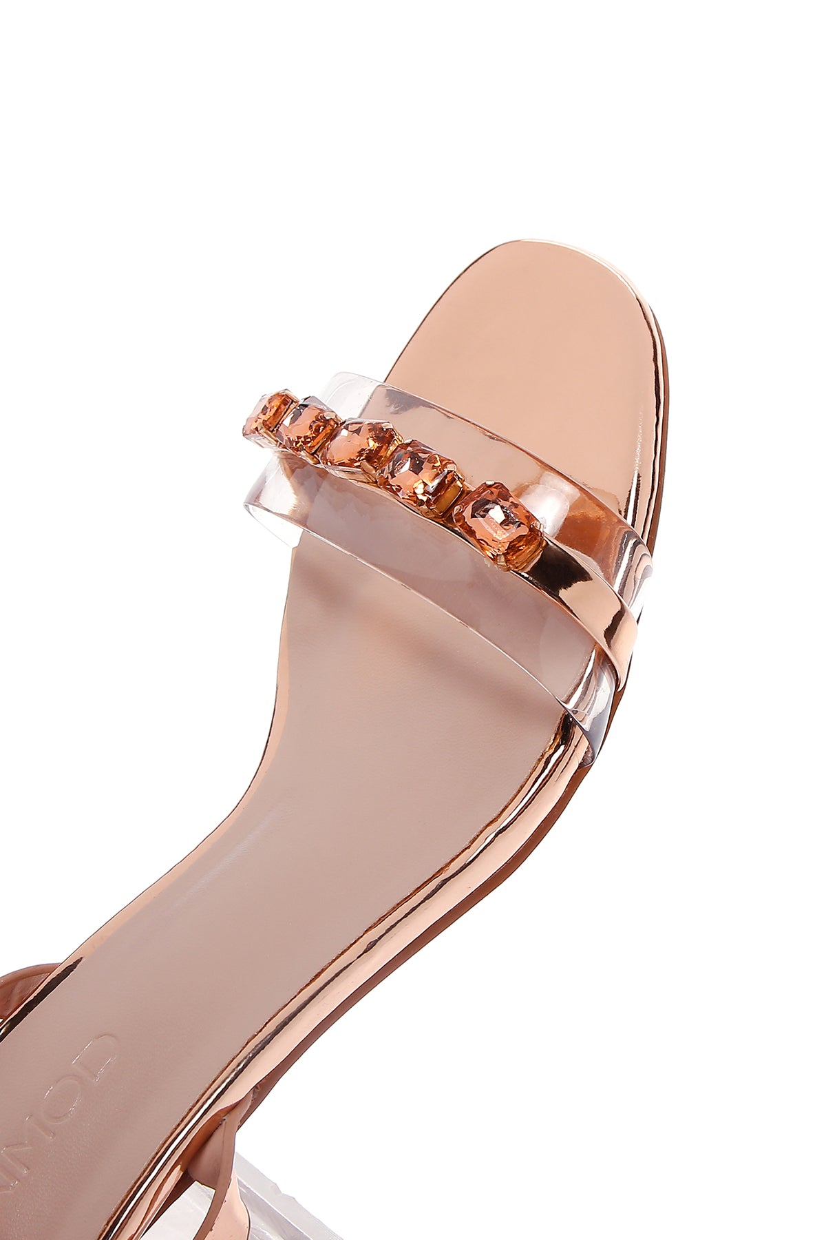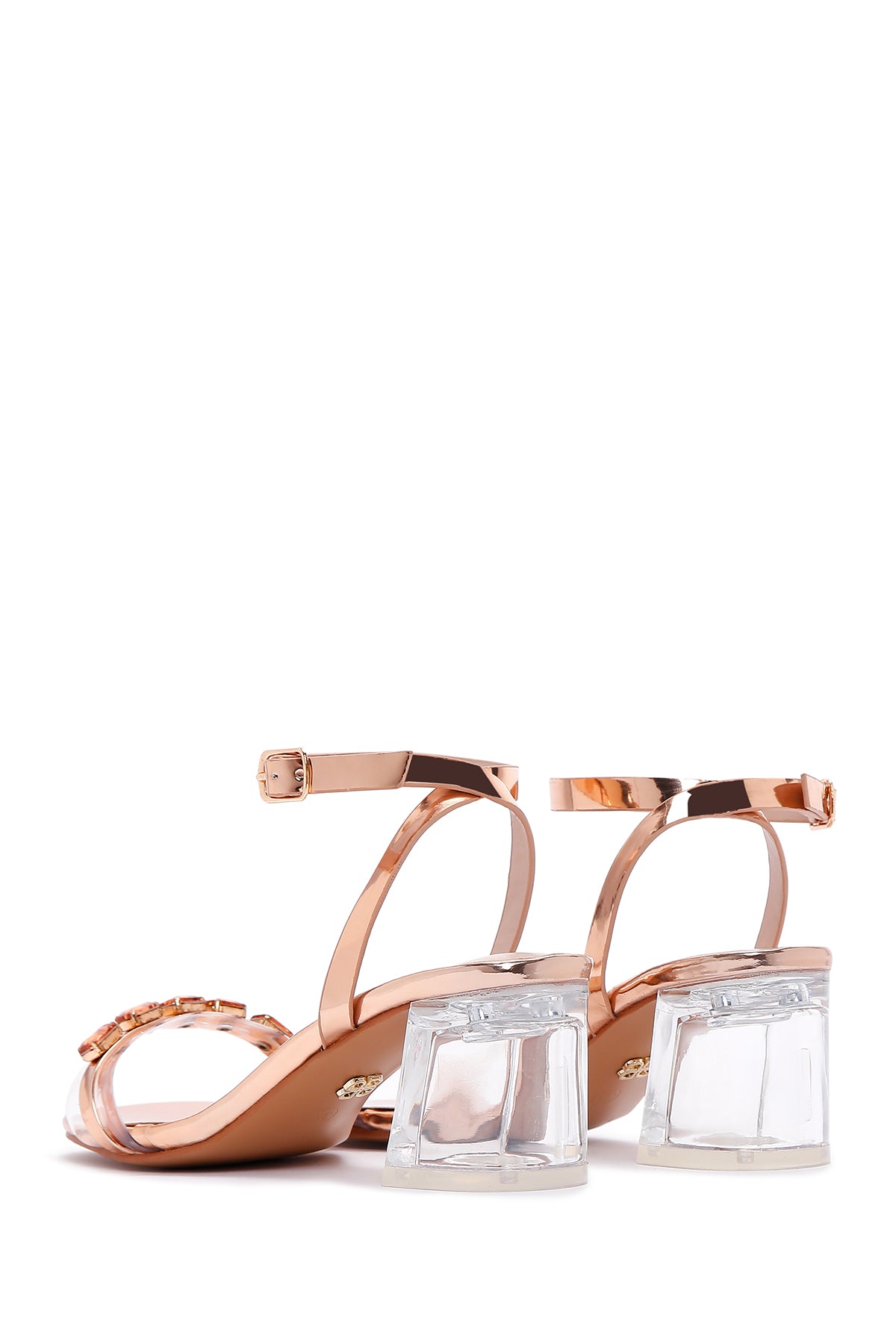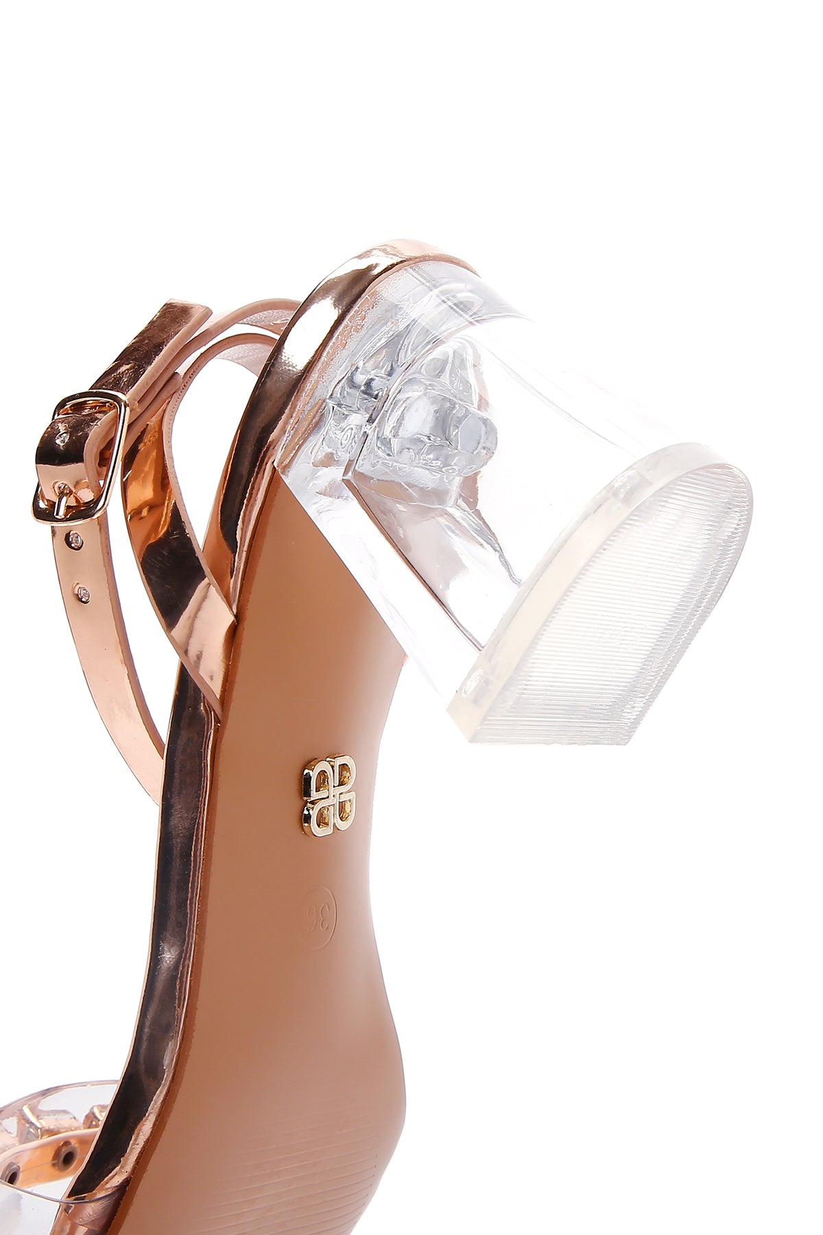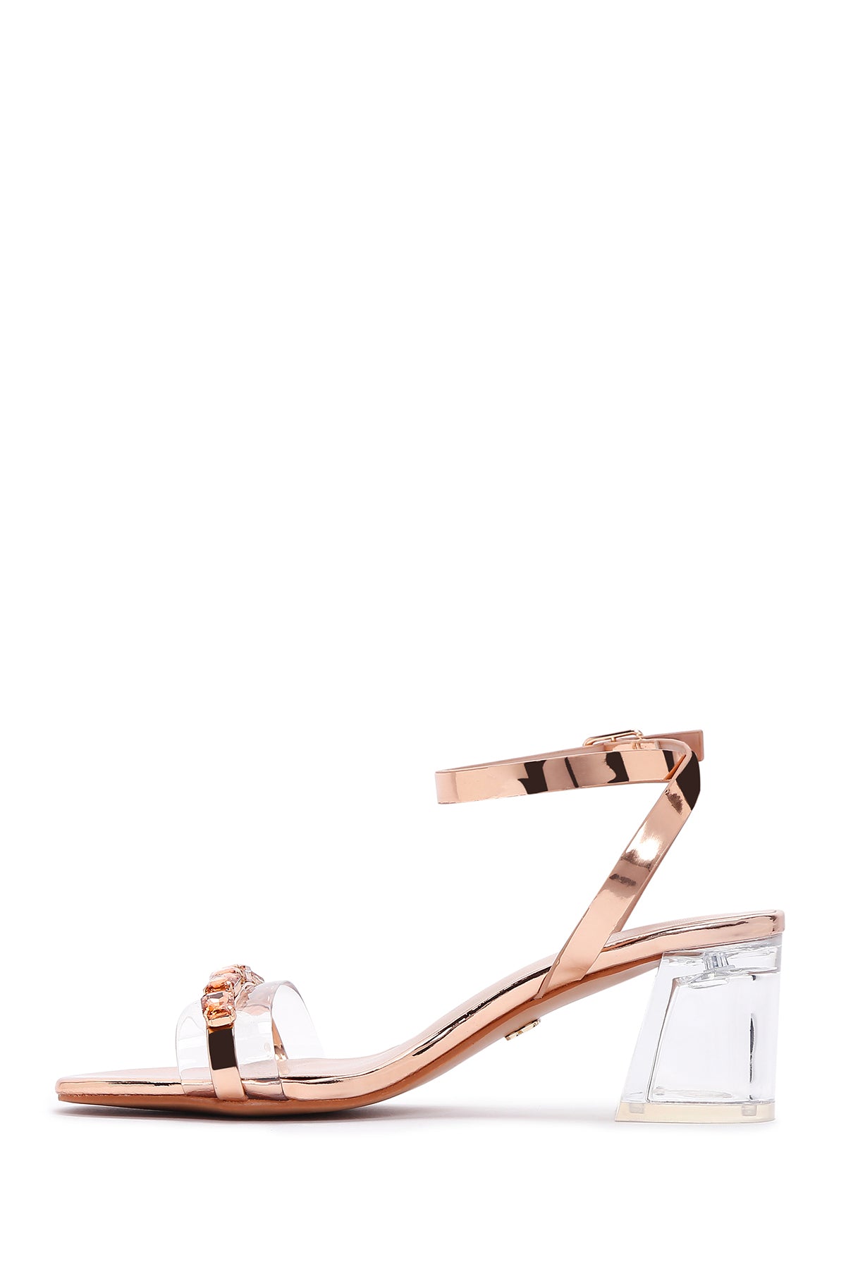 Derimod’un Zarif ve Şıklığı bir arada sunan Kadın Pembe Altın Vinil Taşlı Kalın Topuklu Sandalet ile tarzınızı konuşturun. Ürünün kodu: 23SFE469514 ZD