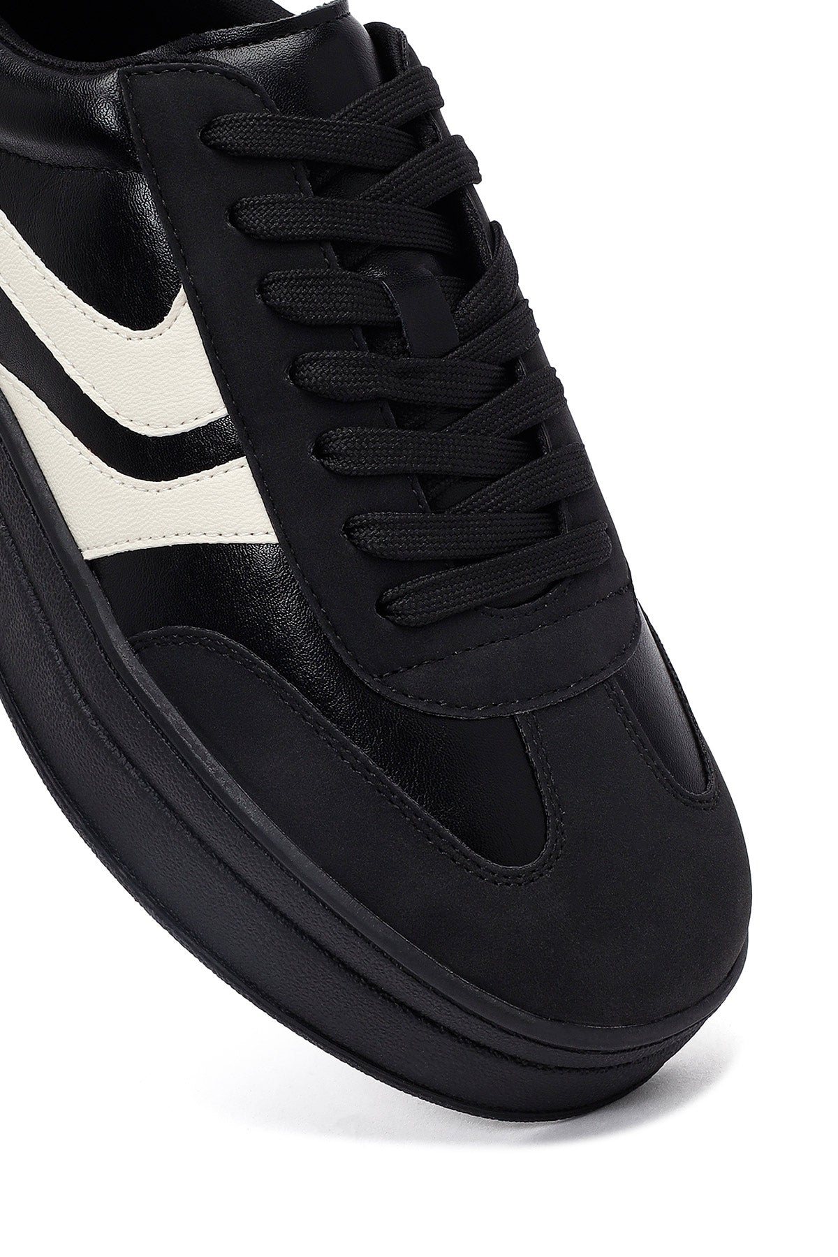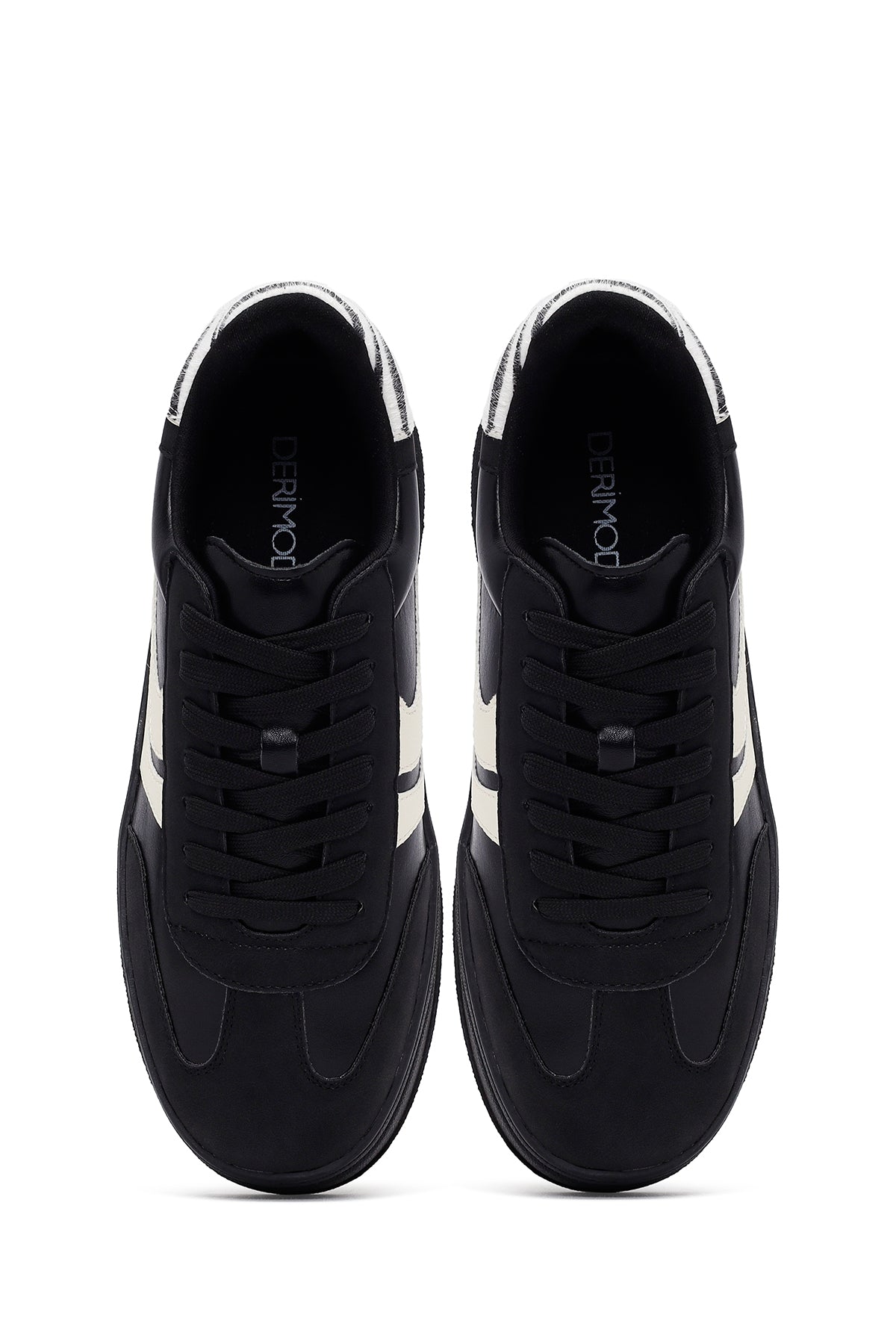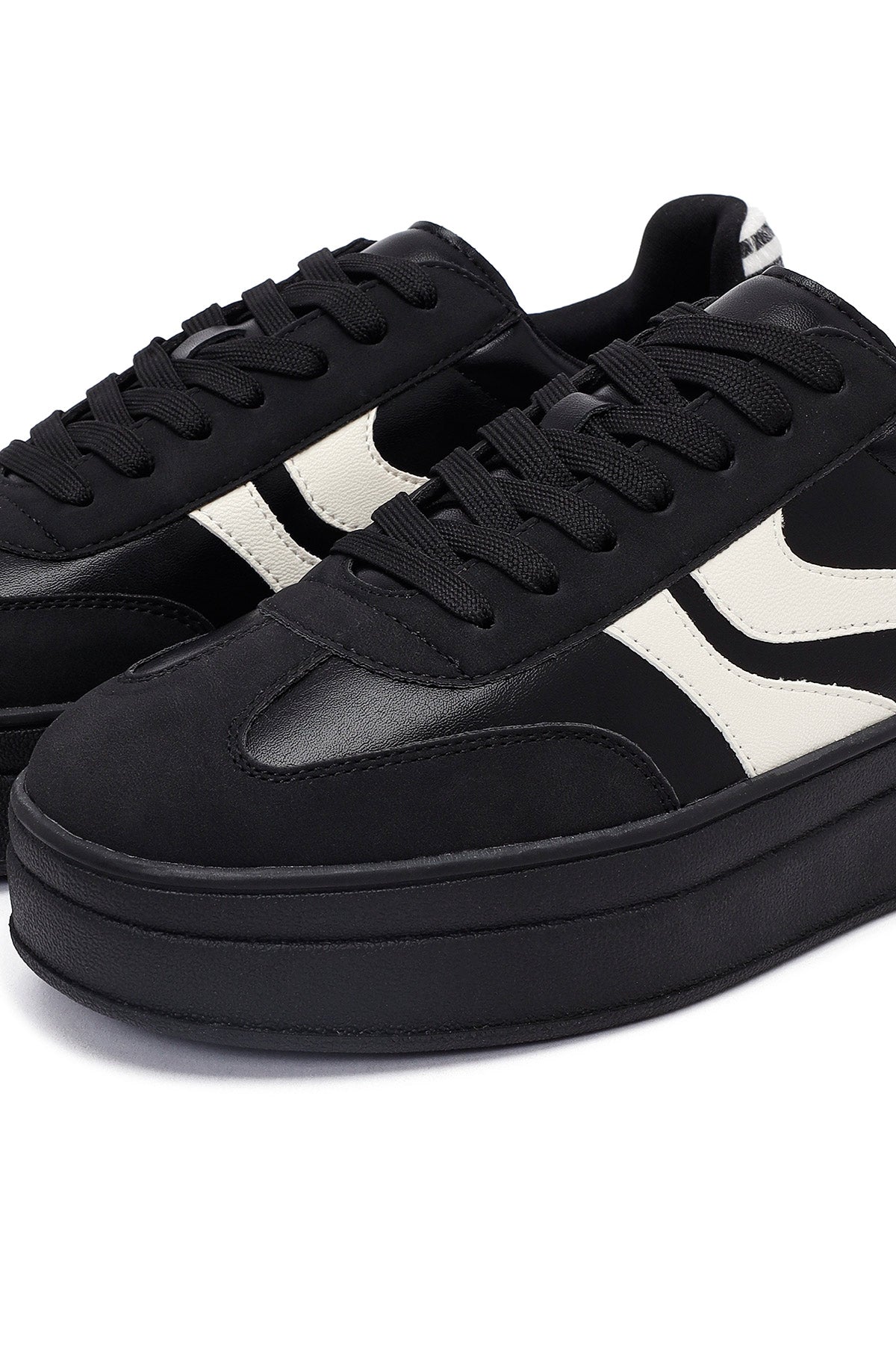 Derimod'un sonbahar koleksiyonundan, modern çizgilere sahip siyah sneaker modeli, 3,5 cm yüksekliğindeki kalın tabanı ile günlük kullanıma uygun bir tasarım sunuyor. Minimalist tasarımı ve temiz hatları ile dikkat çeken model, bağcıklı yapısı sayesinde ayağa tam oturuyor. Kalın taban detayı ile hem trend görünüm hem de boy avantajı sağlayan sneaker, jean'lerden spor takımlara, günlük elbiselerden casual kombinlere kadar geniş bir kullanım alanı sunuyor. İlkbahar ve sonbahar mevsimlerinde günün her saatinde kullanılabilir. Ürün kodu: 25AFD430814