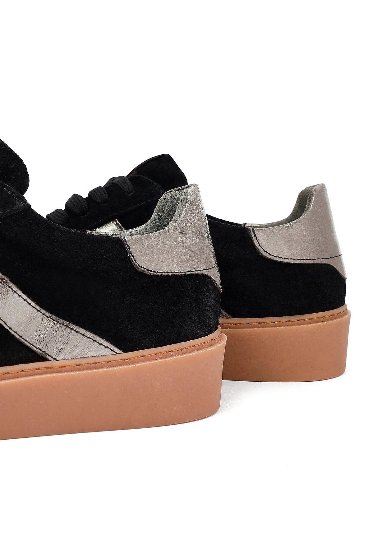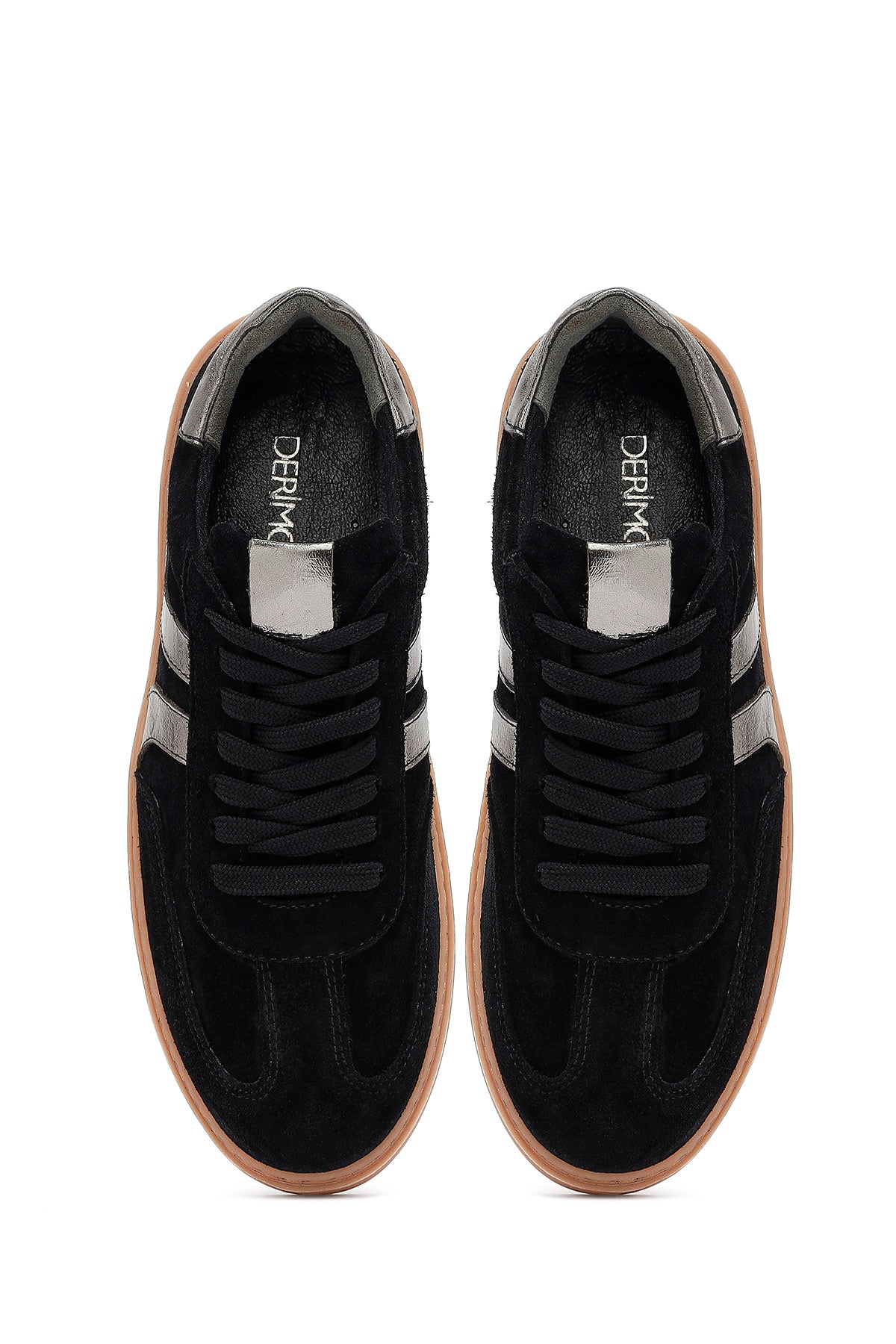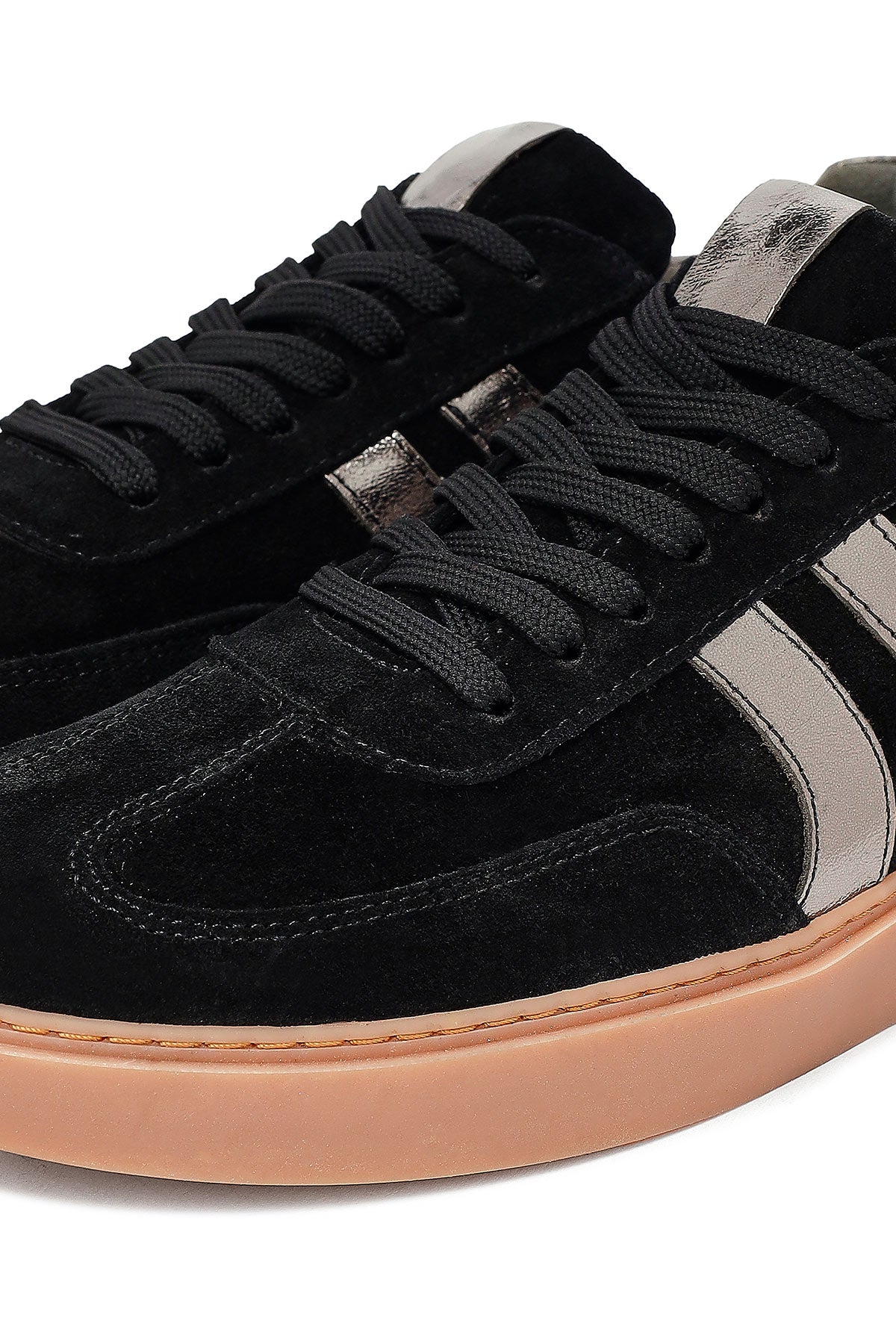 Derimod'un sonbahar koleksiyonundan, süet deri kullanılarak tasarlanan siyah sneaker modeli, 3 cm yüksekliğindeki tabanı ile günlük kullanıma uygun bir tasarım sunuyor. Yanlardaki gri şerit detayları ile sportif bir görünüm sergileyen model, deri-tekstil karışımlı iç astarı sayesinde ayağınızı rahat ettiriyor. Bağcıklı yapısı ile ayağa tam oturan sneaker, jean'lerden spor takımlara, günlük elbiselerden casual kombinlere kadar geniş bir kullanım alanı sunuyor. İlkbahar ve sonbahar mevsimlerinde günün her saatinde kullanılabilir. Ürün kodu: 25AFD370910
