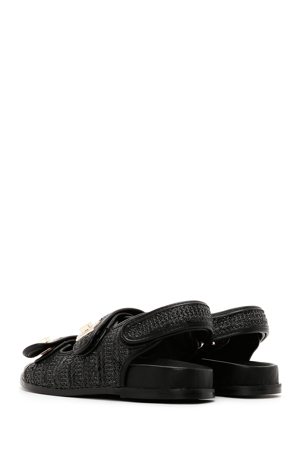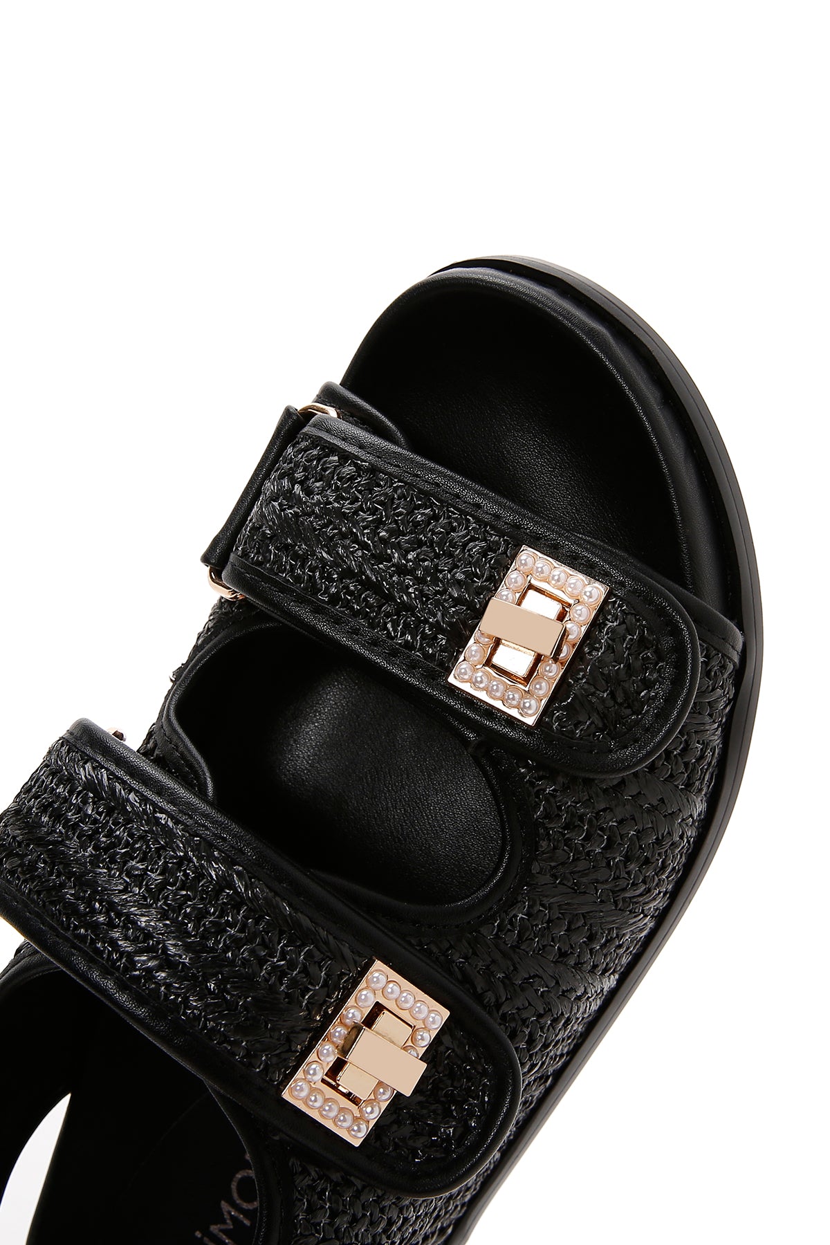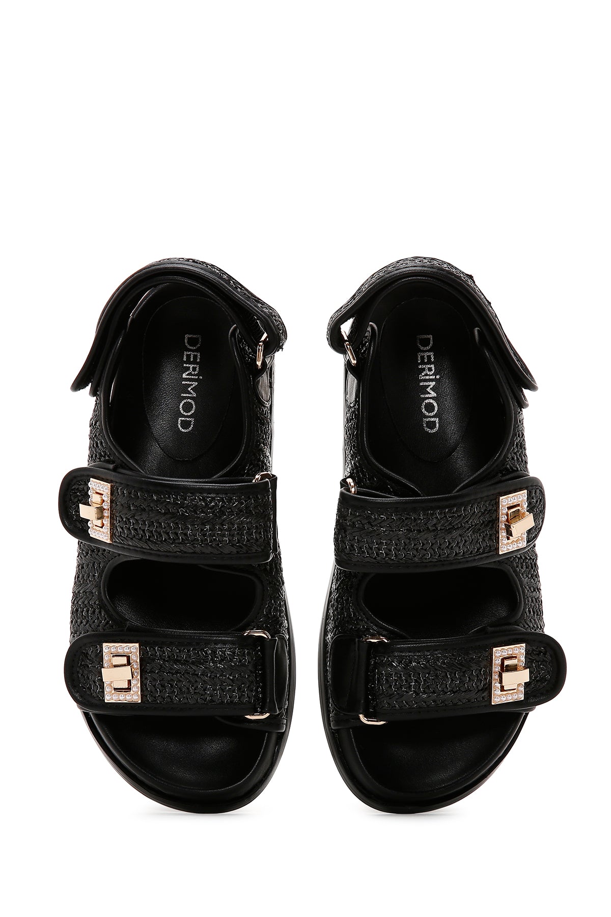 Kadın Siyah Bilekten Bantlı Çift Tokalı Hasır Sandalet