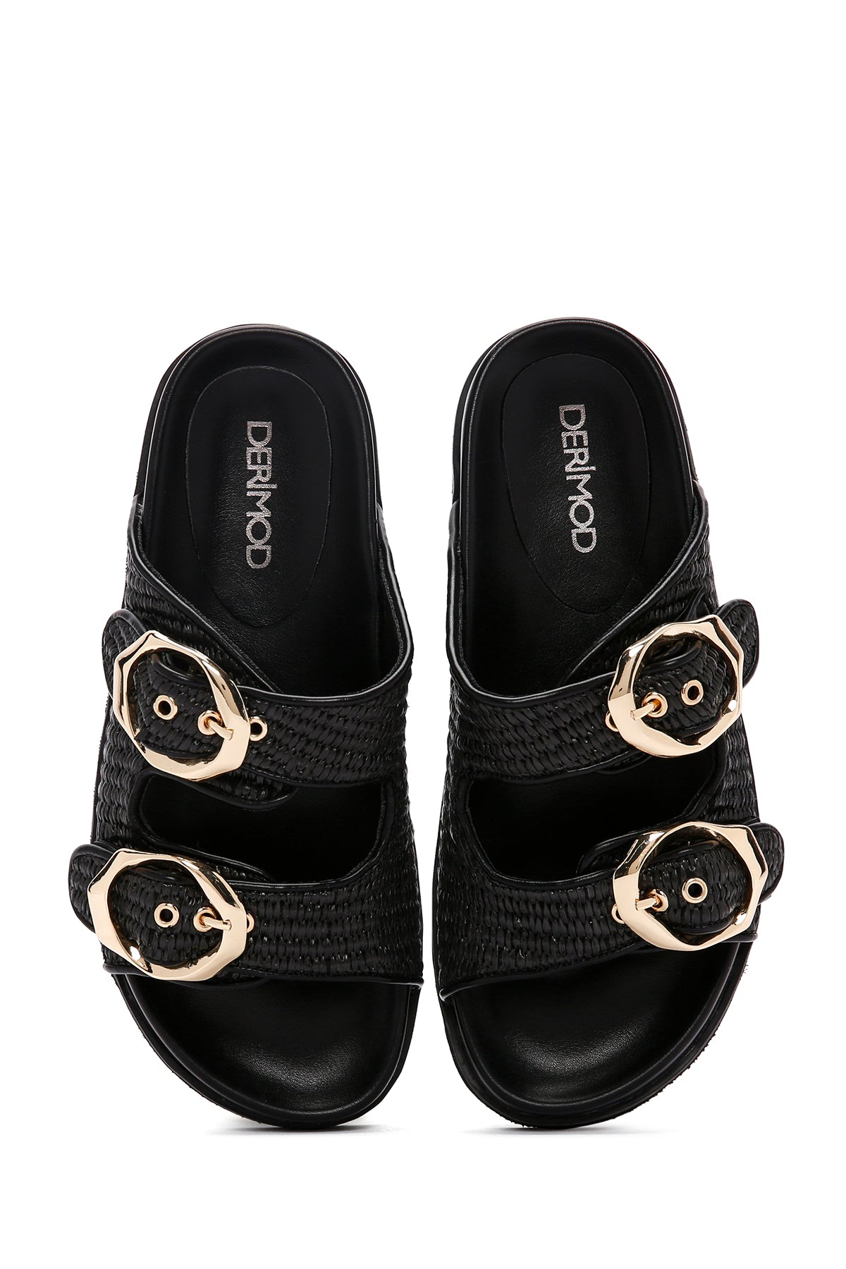 Kadın Siyah Çift Tokalı Hasır Terlik