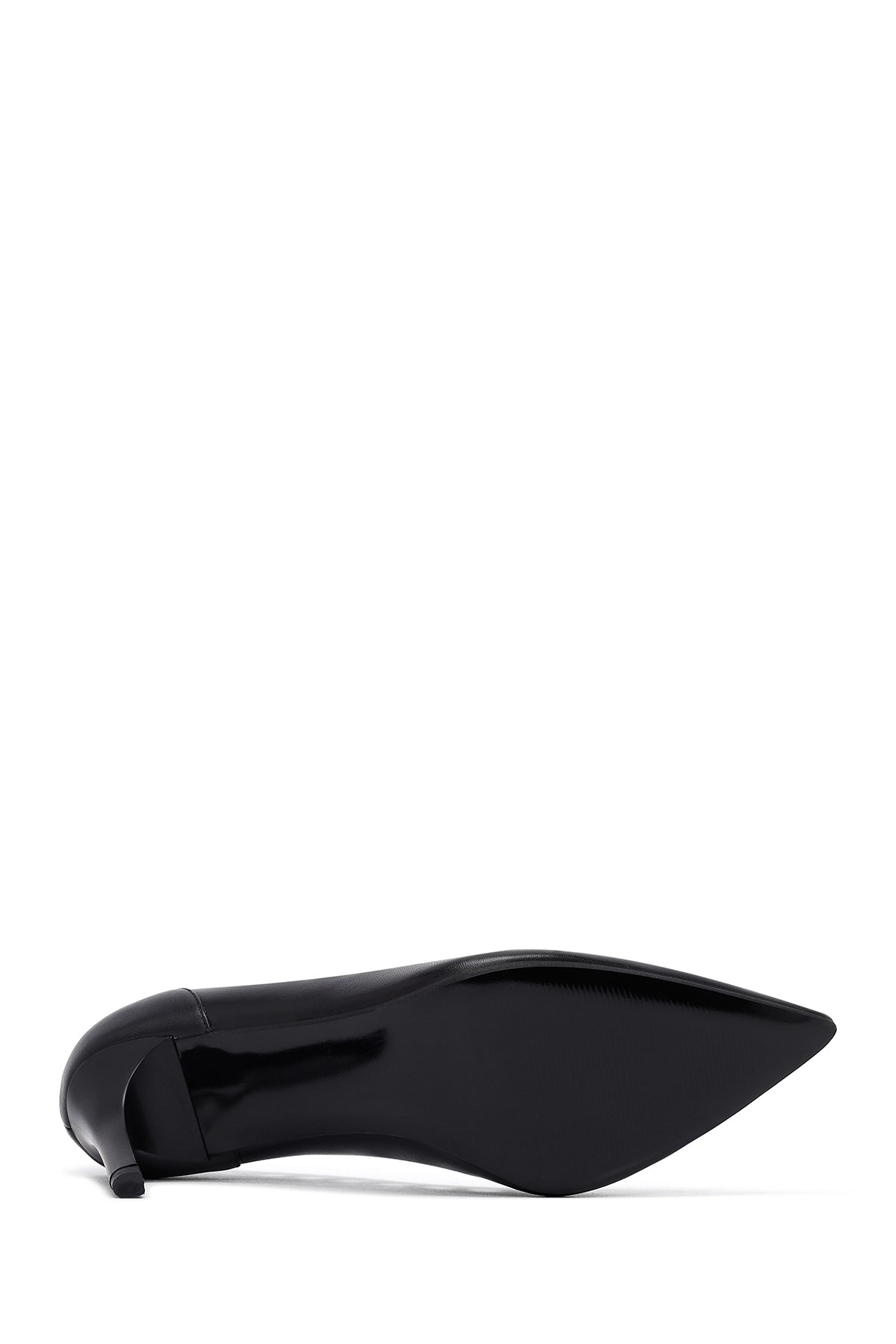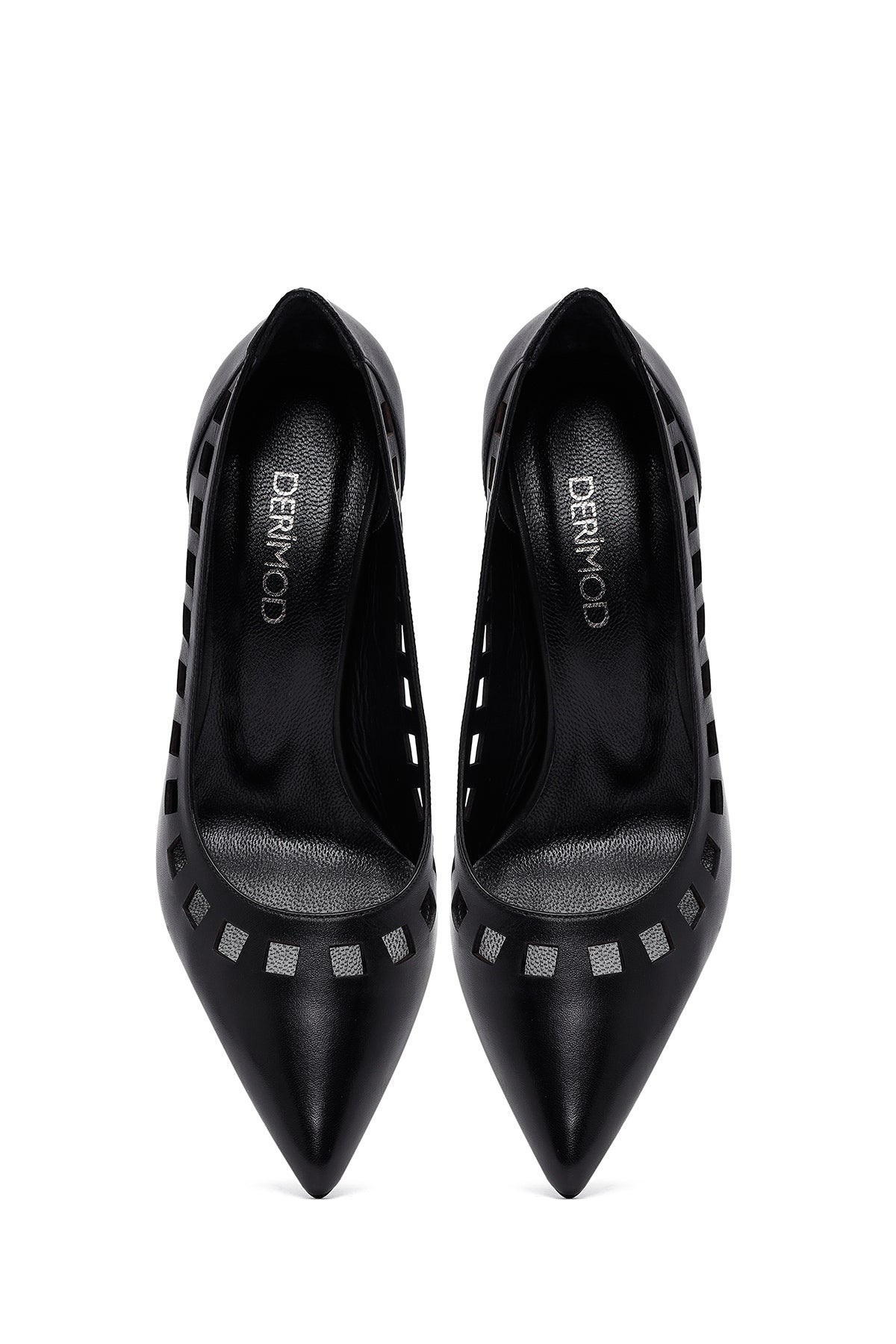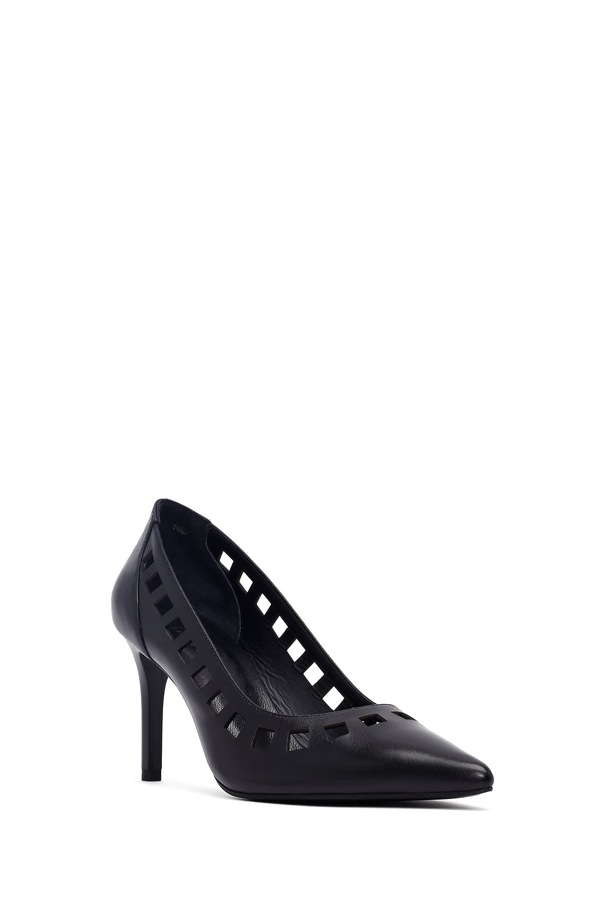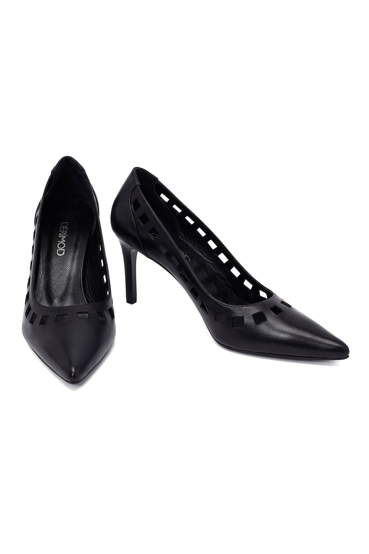 Derimod'un sonbahar koleksiyonundan, vidala deri kullanılarak tasarlanan siyah stiletto modeli, 8 cm yüksekliğindeki ince topuğu ile zarif bir duruş sergiliyor. Yanlardaki geometrik kesim detayları ile modern bir görünüm sunan model, sentetik iç astarı ile kullanım kolaylığı sağlıyor. Sivri burun formu ile ayağı zarif gösteren stiletto, ofis kombinlerinden davet kıyafetlerine, klasik takımlardan elbiselere kadar geniş bir kullanım alanı sunuyor. İlkbahar ve sonbahar mevsimlerinde özel günlerde ve iş hayatında tercih edilebilir. Ürün kodu: 25AFD162518