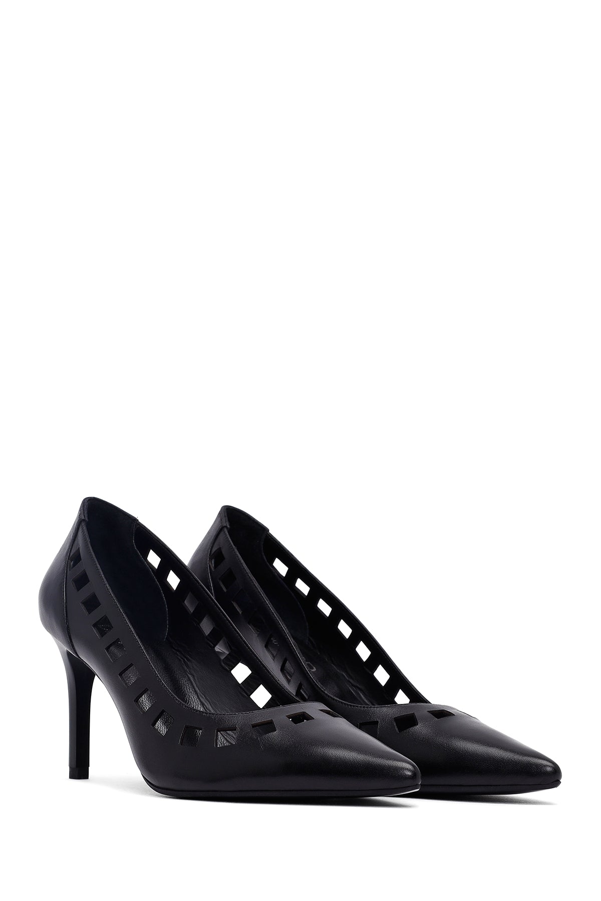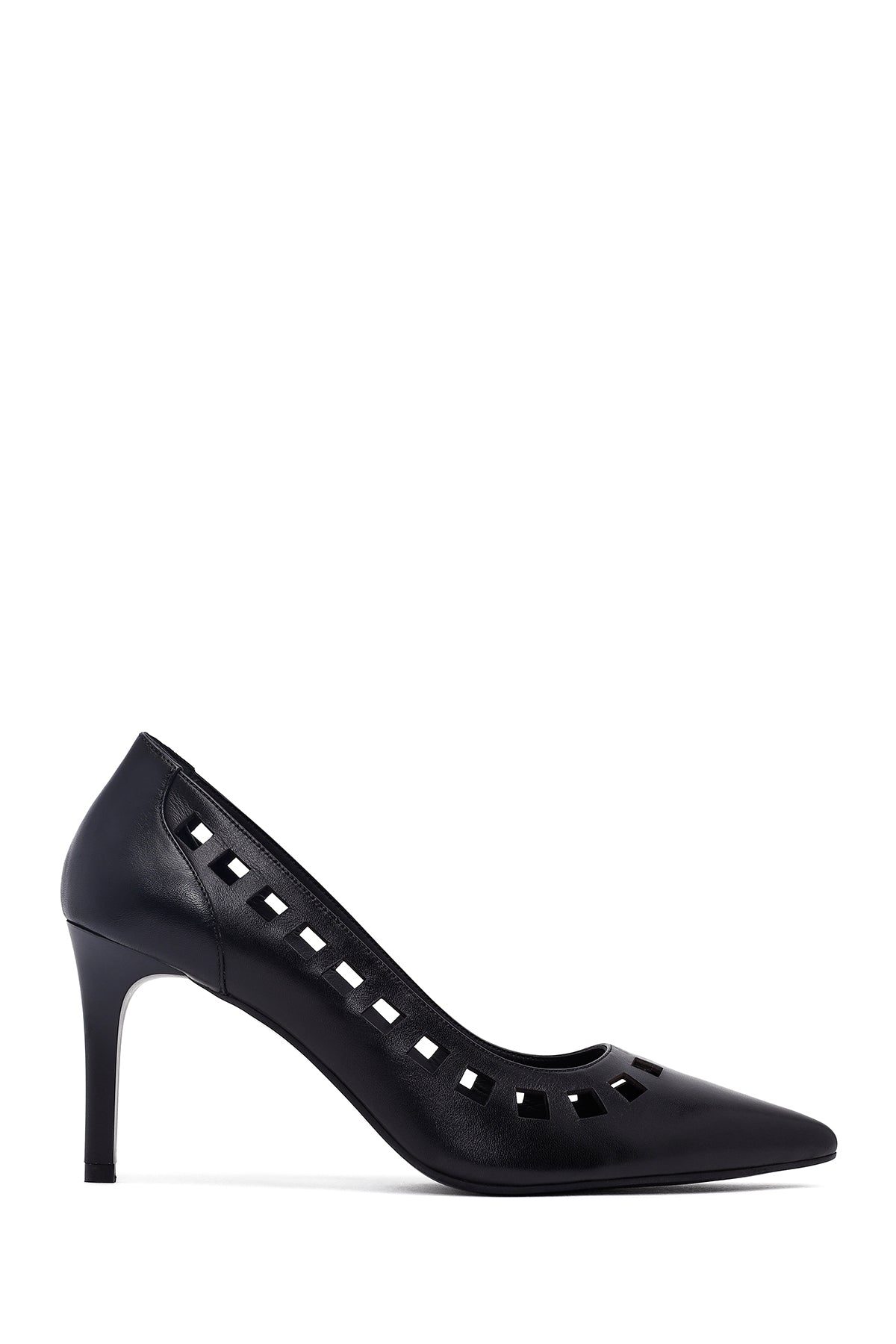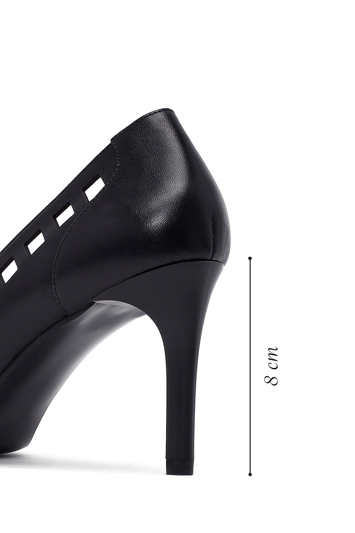 Derimod'un sonbahar koleksiyonundan, vidala deri kullanılarak tasarlanan siyah stiletto modeli, 8 cm yüksekliğindeki ince topuğu ile zarif bir duruş sergiliyor. Yanlardaki geometrik kesim detayları ile modern bir görünüm sunan model, sentetik iç astarı ile kullanım kolaylığı sağlıyor. Sivri burun formu ile ayağı zarif gösteren stiletto, ofis kombinlerinden davet kıyafetlerine, klasik takımlardan elbiselere kadar geniş bir kullanım alanı sunuyor. İlkbahar ve sonbahar mevsimlerinde özel günlerde ve iş hayatında tercih edilebilir. Ürün kodu: 25AFD162518