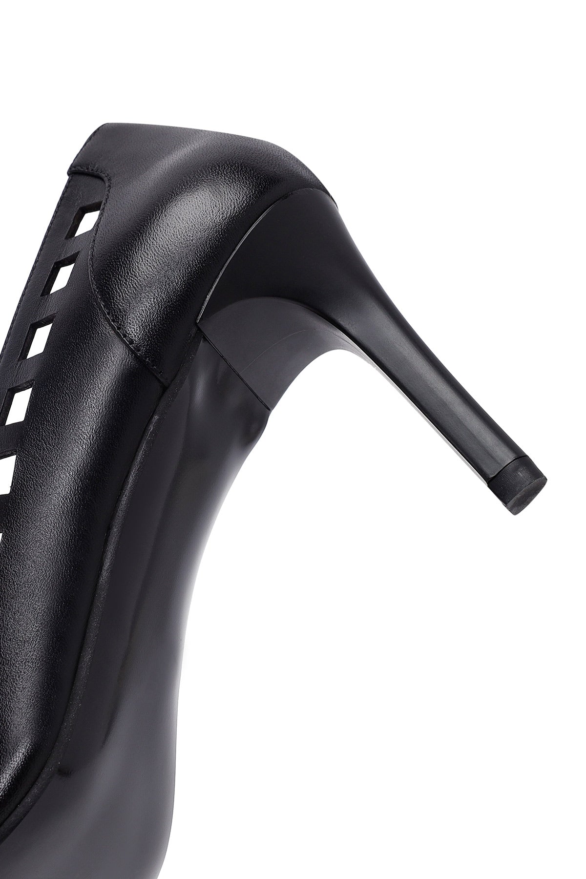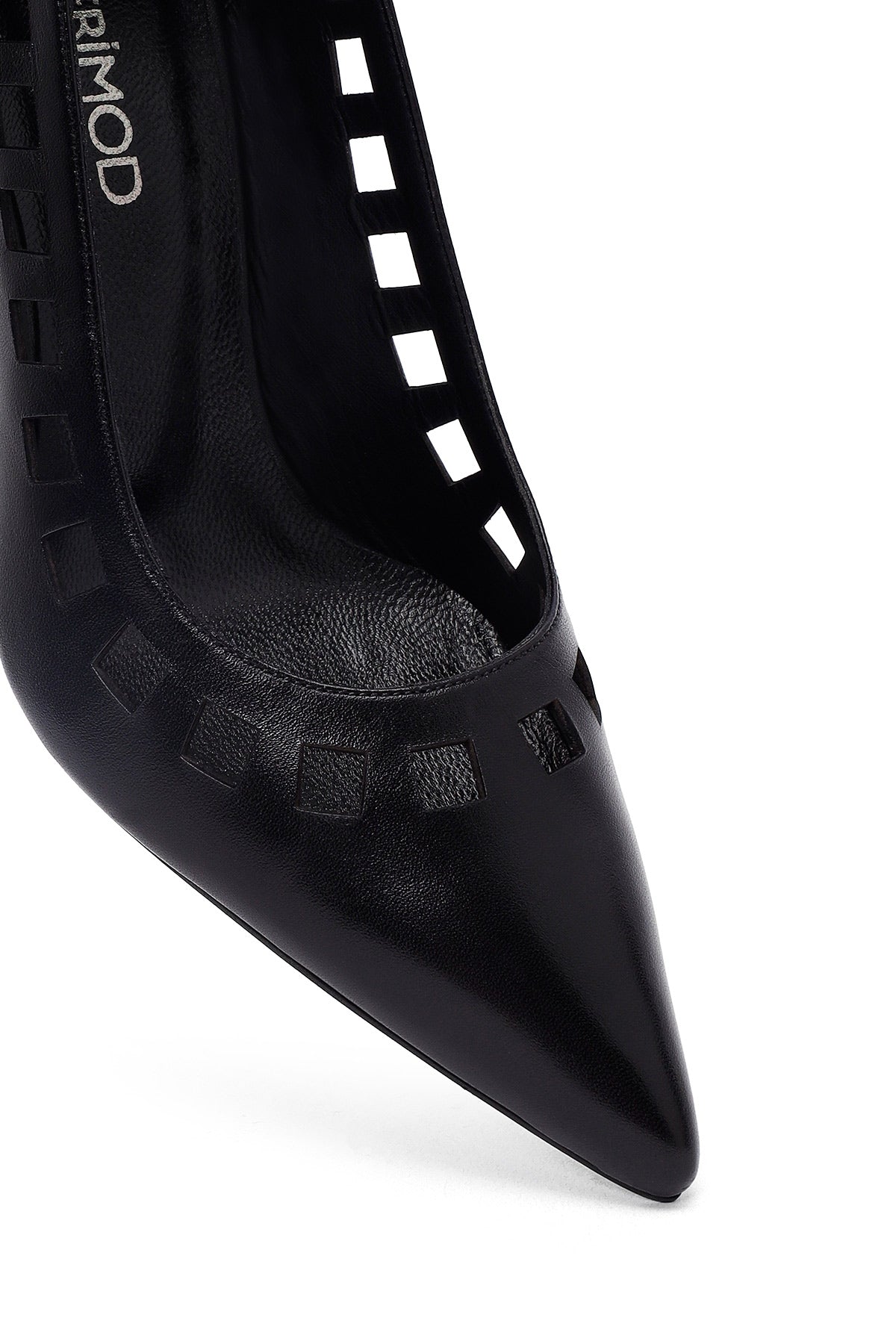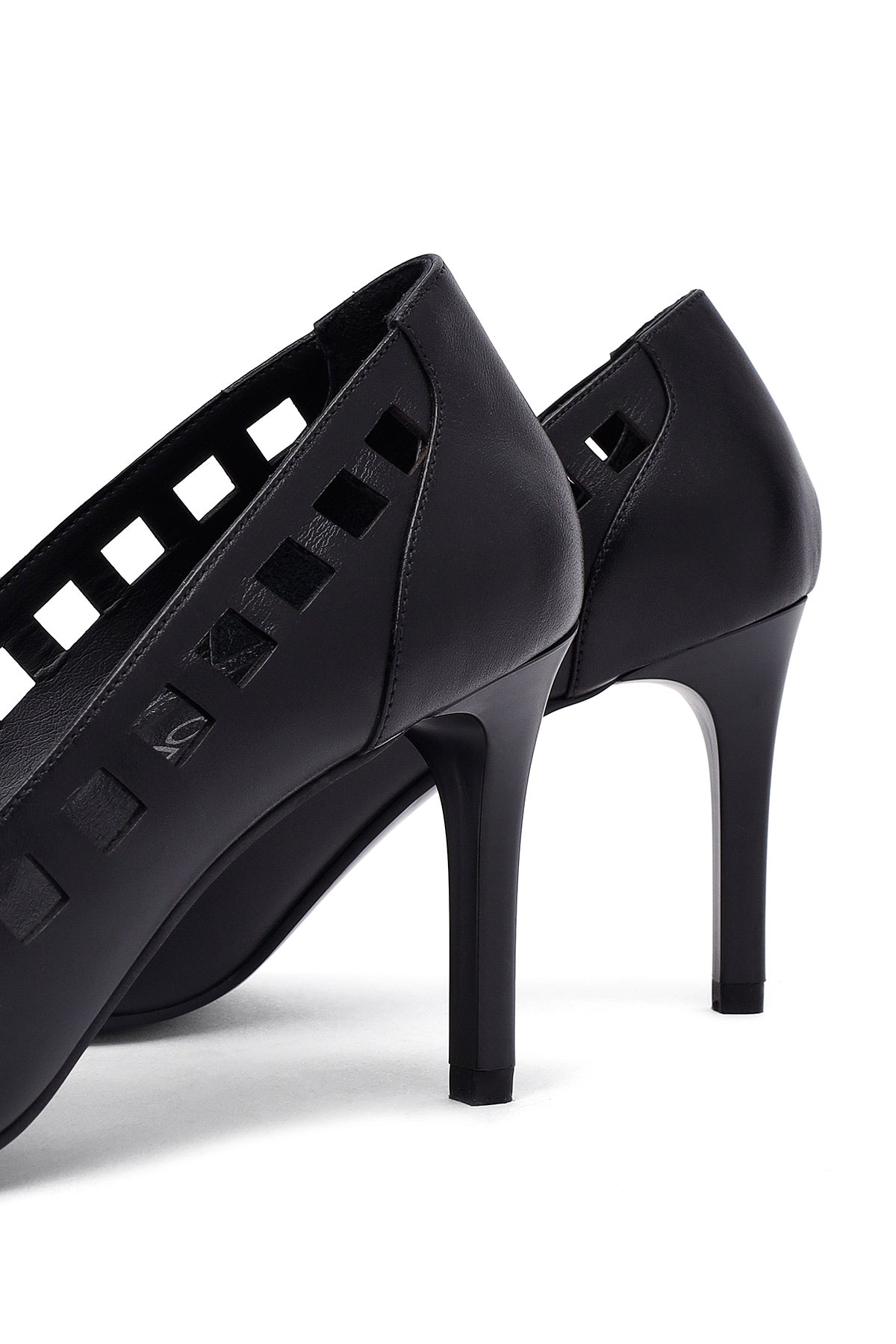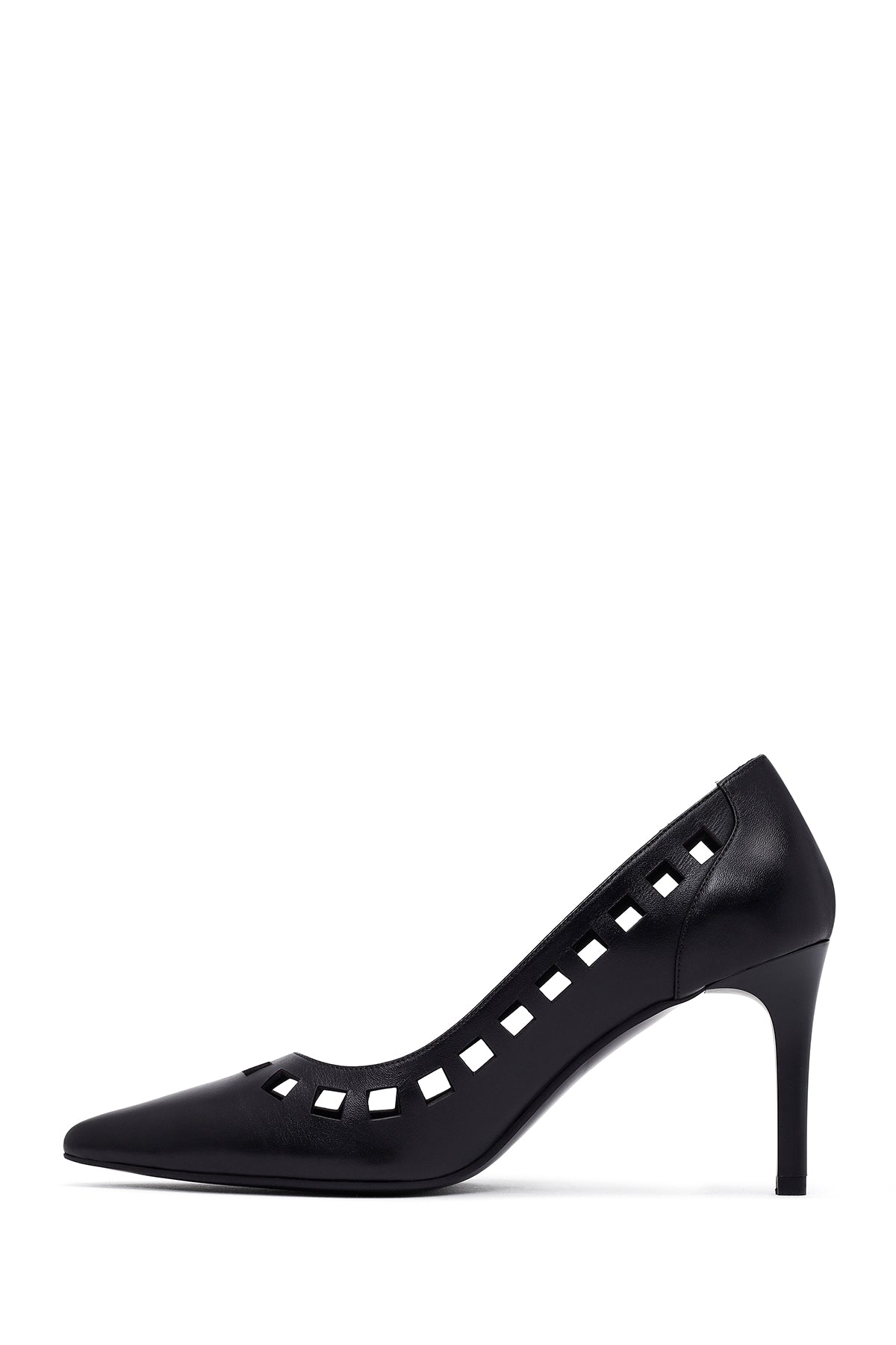 Derimod'un sonbahar koleksiyonundan, vidala deri kullanılarak tasarlanan siyah stiletto modeli, 8 cm yüksekliğindeki ince topuğu ile zarif bir duruş sergiliyor. Yanlardaki geometrik kesim detayları ile modern bir görünüm sunan model, sentetik iç astarı ile kullanım kolaylığı sağlıyor. Sivri burun formu ile ayağı zarif gösteren stiletto, ofis kombinlerinden davet kıyafetlerine, klasik takımlardan elbiselere kadar geniş bir kullanım alanı sunuyor. İlkbahar ve sonbahar mevsimlerinde özel günlerde ve iş hayatında tercih edilebilir. Ürün kodu: 25AFD162518