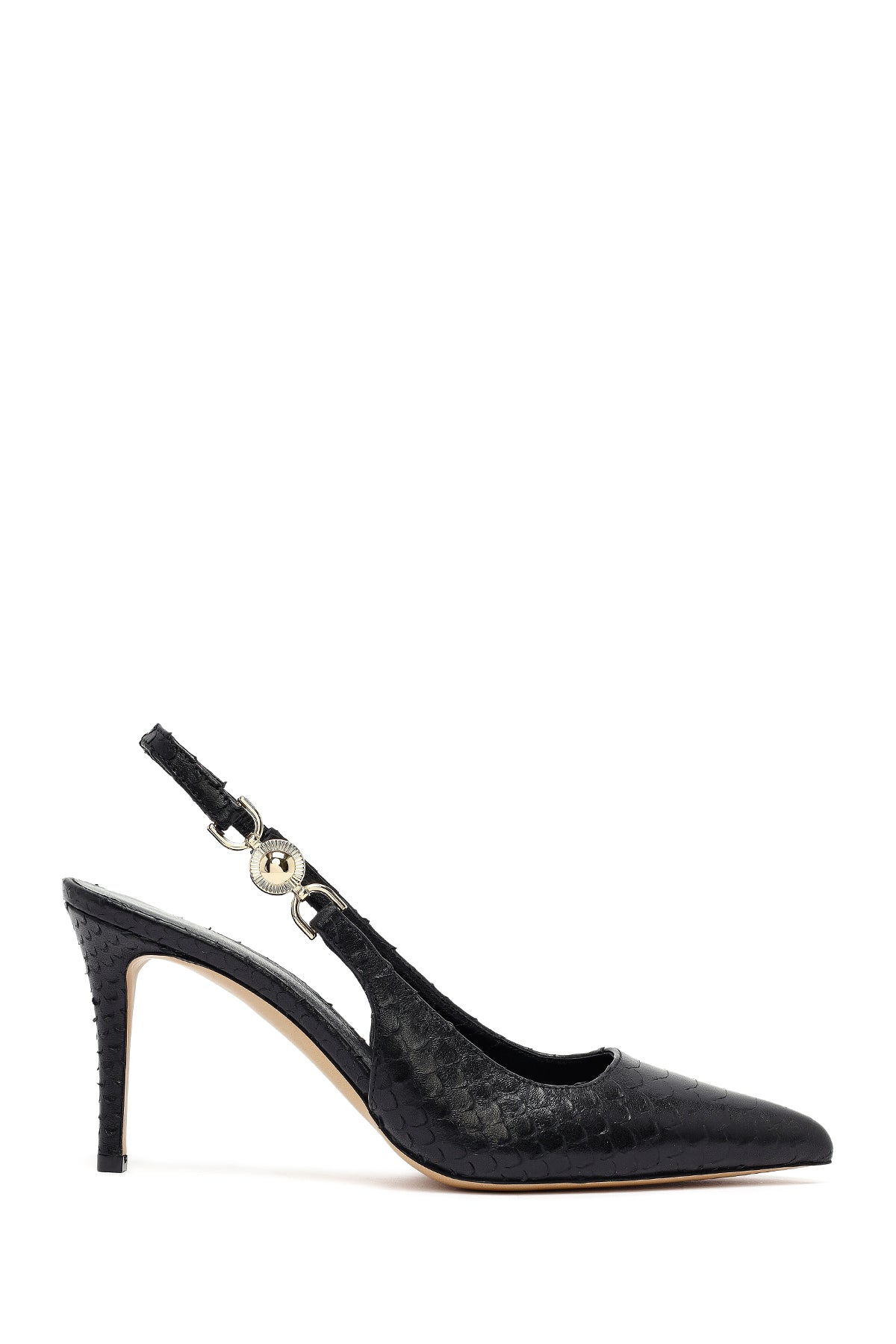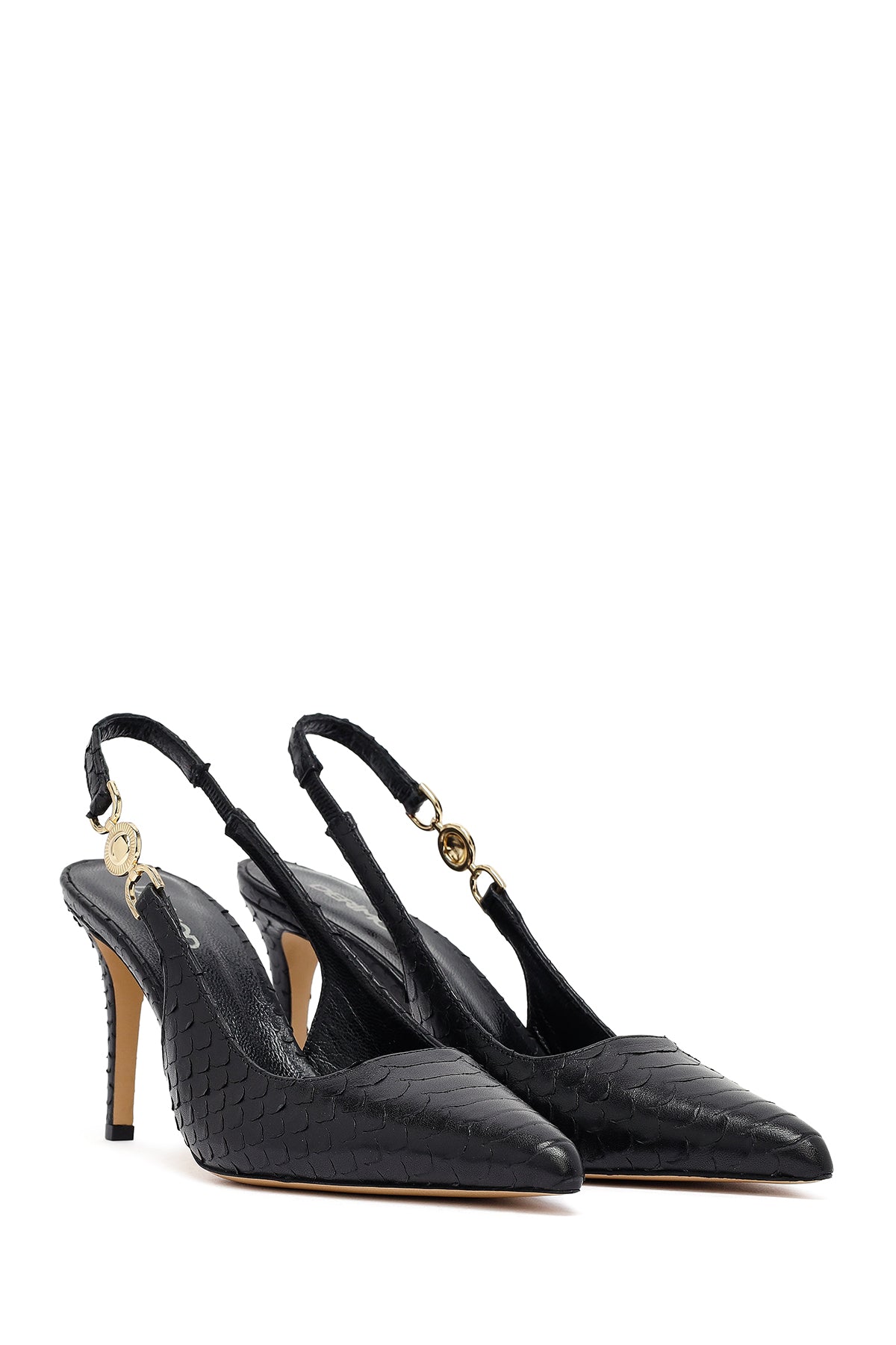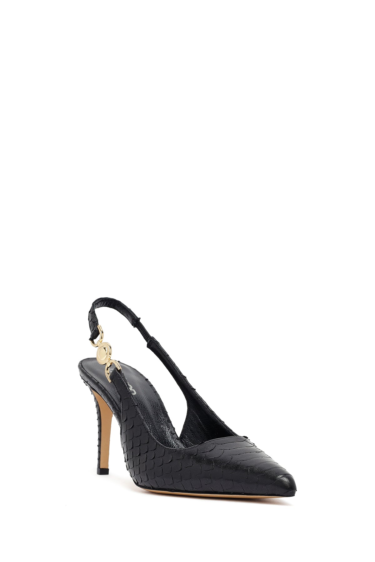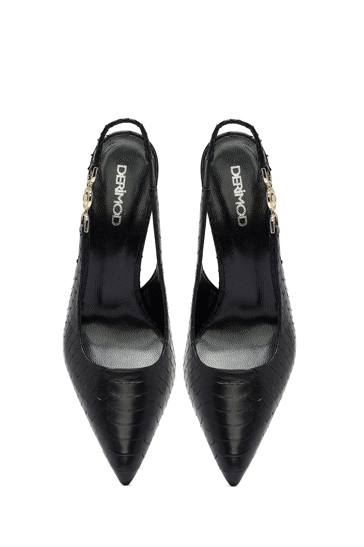 Derimod'un sonbahar koleksiyonundan, yılan derisi dokusunun asaletiyle tasarlanan siyah arkası açık ayakkabı modeli, 9 cm topuk yüksekliği ile zarif bir duruş sunuyor. Slingback tarzı tasarımı ve altın rengi toka detayı ile göz alıcı bir görünüm sergileyen model, deri iç astarı ile premium bir kullanım sağlıyor. Sivri burun formu ile modern çizgilere sahip ayakkabı, ofis kombinlerinden davet kıyafetlerine kadar geniş bir kullanım alanı sunuyor. İlkbahar ve sonbahar mevsimlerinde tercih edilebilir. Ürün kodu: 25AFD120240