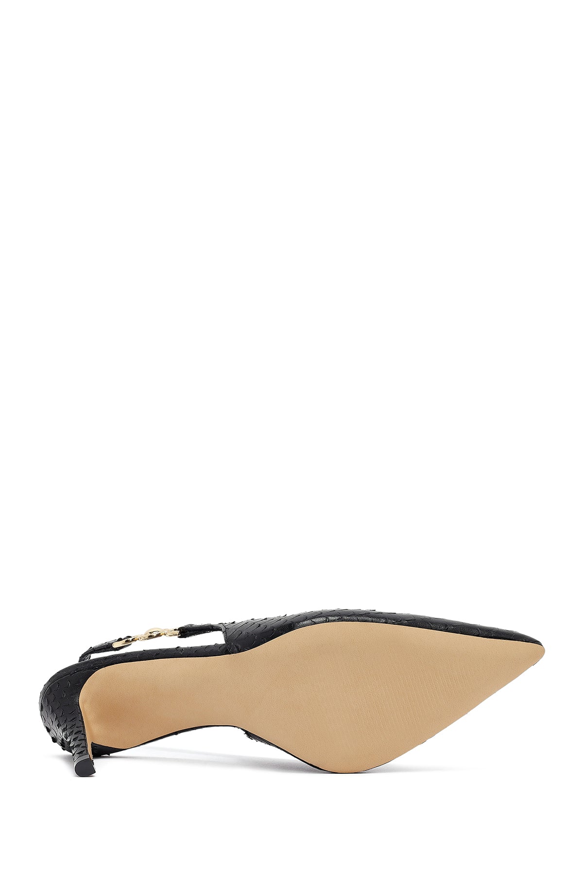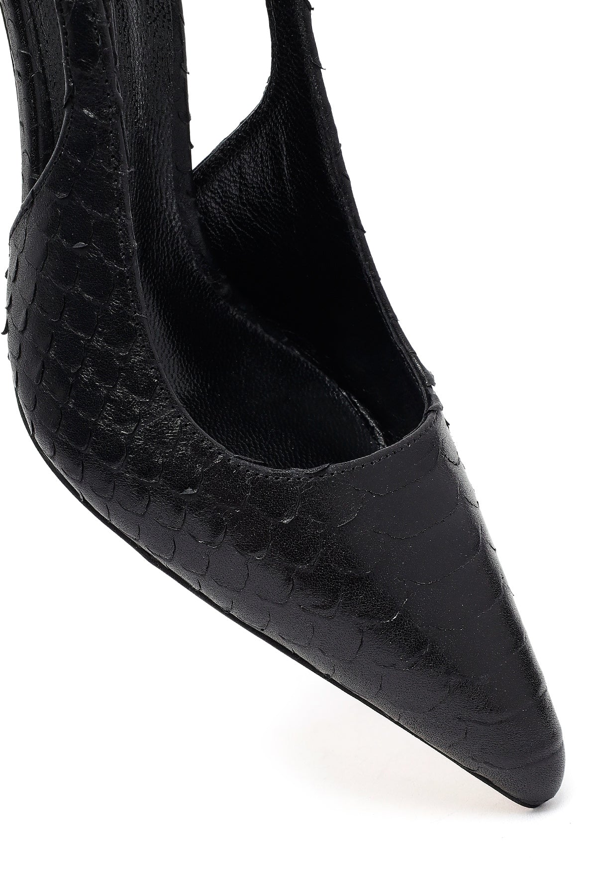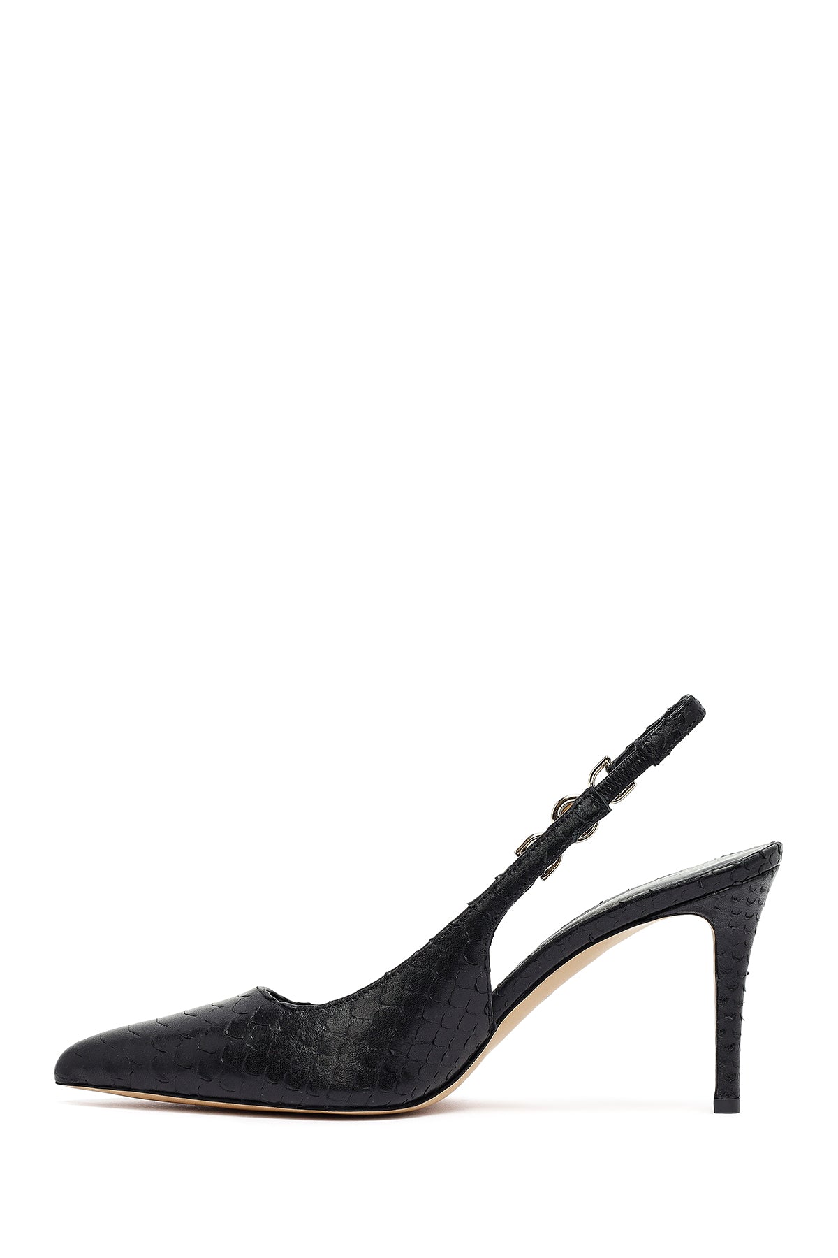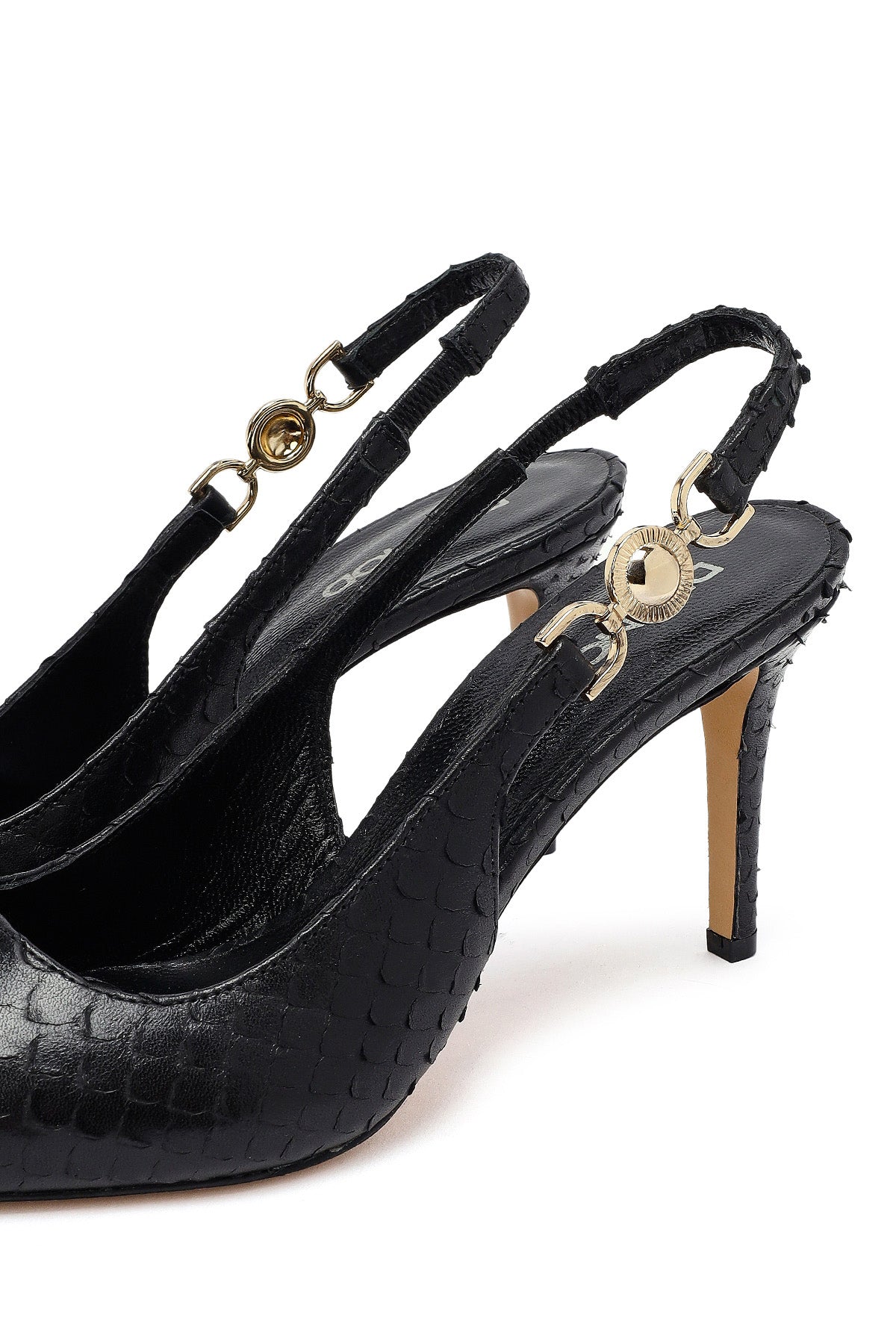 Derimod'un sonbahar koleksiyonundan, yılan derisi dokusunun asaletiyle tasarlanan siyah arkası açık ayakkabı modeli, 9 cm topuk yüksekliği ile zarif bir duruş sunuyor. Slingback tarzı tasarımı ve altın rengi toka detayı ile göz alıcı bir görünüm sergileyen model, deri iç astarı ile premium bir kullanım sağlıyor. Sivri burun formu ile modern çizgilere sahip ayakkabı, ofis kombinlerinden davet kıyafetlerine kadar geniş bir kullanım alanı sunuyor. İlkbahar ve sonbahar mevsimlerinde tercih edilebilir. Ürün kodu: 25AFD120240