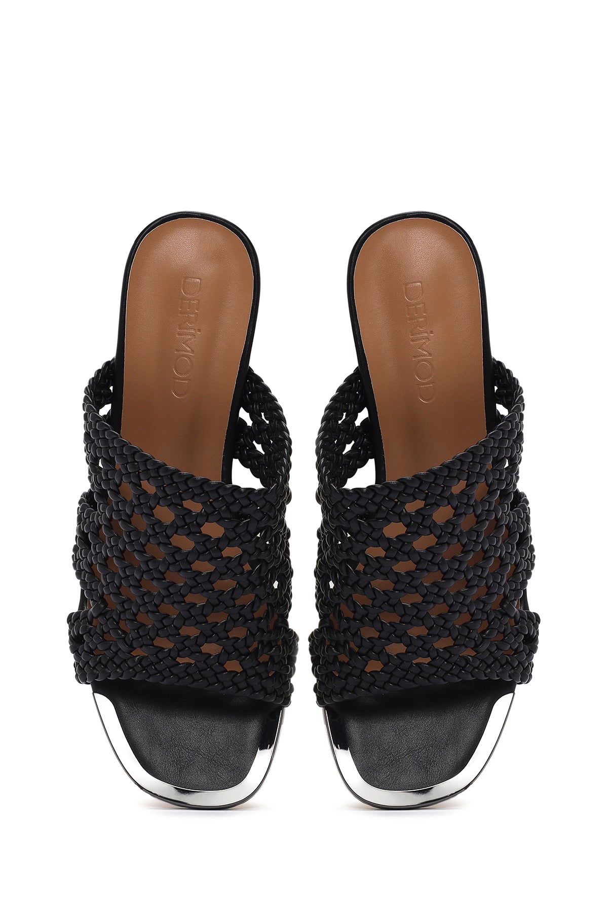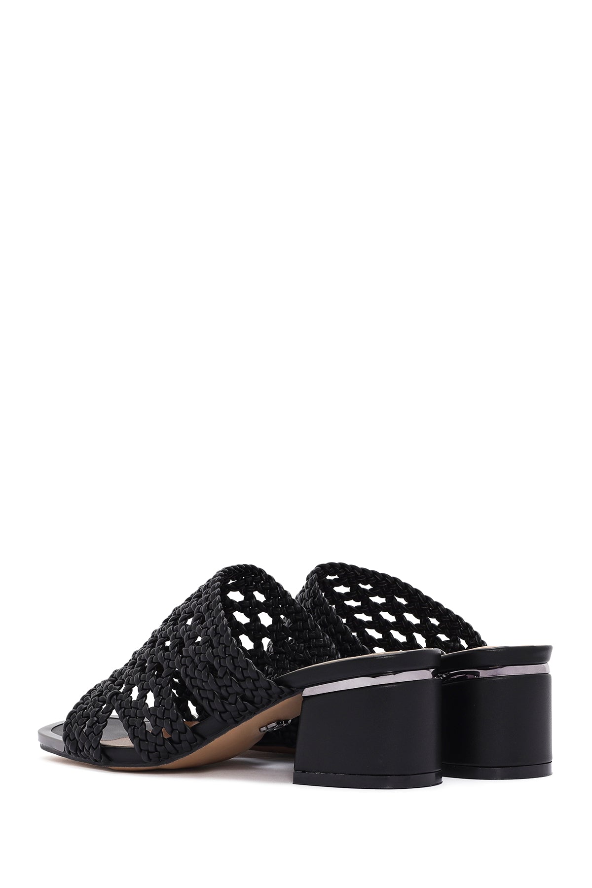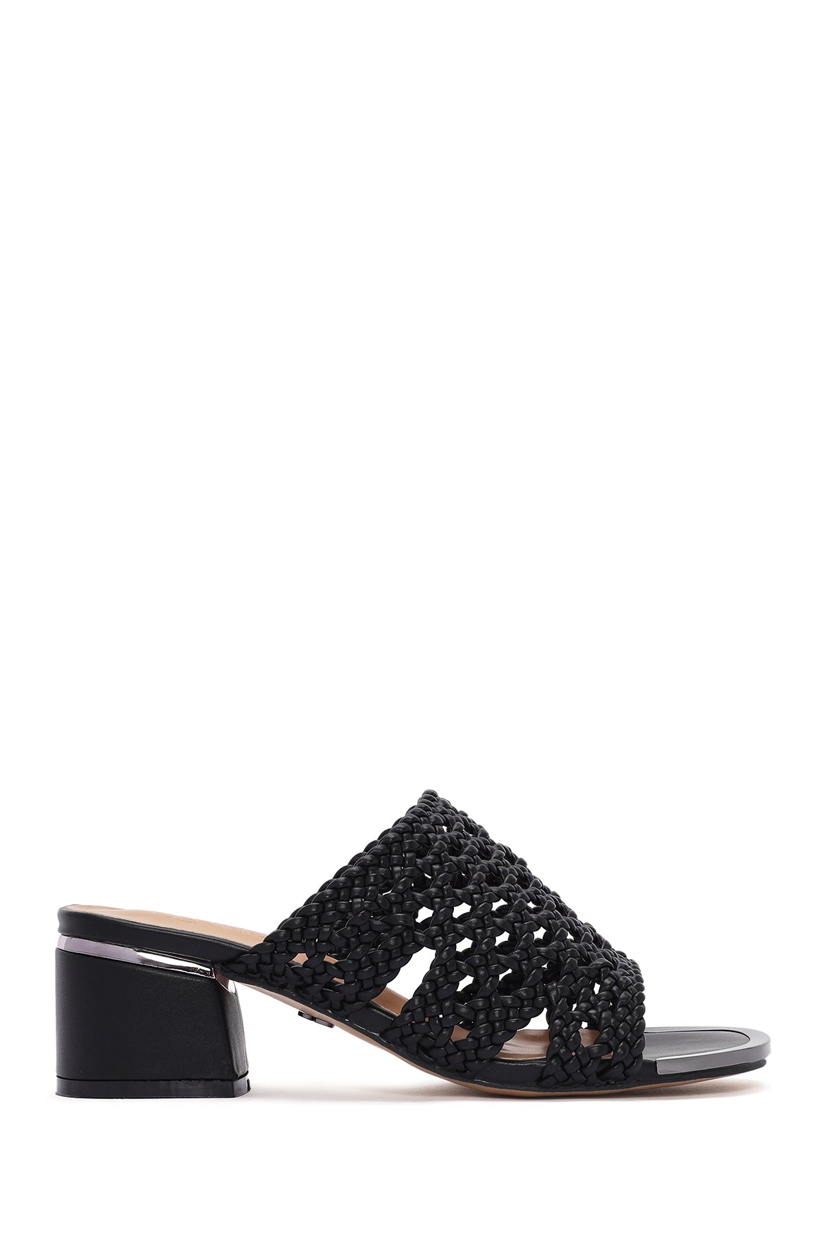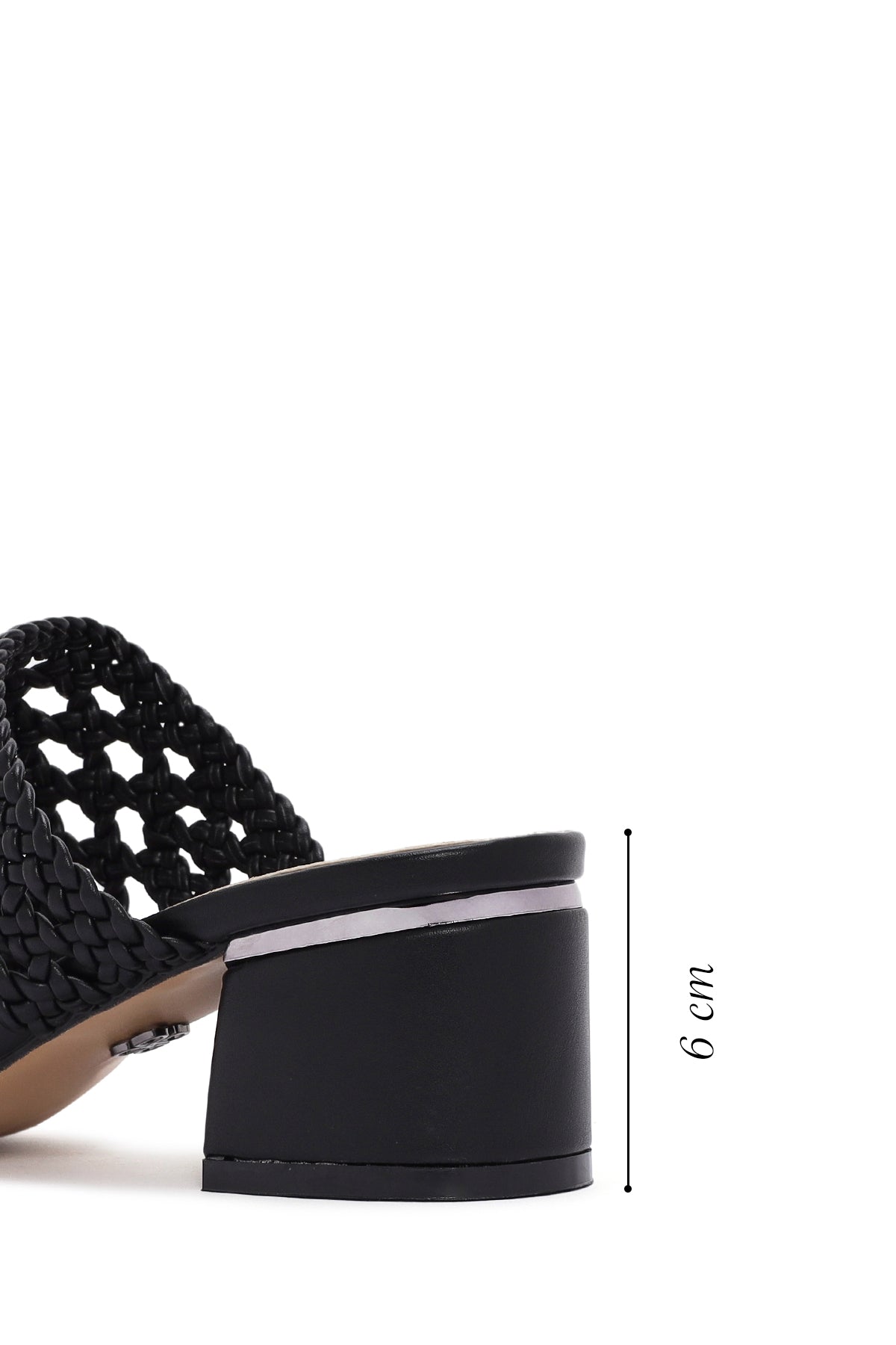 Kadın Siyah Topuklu Örgü Desenli Terlik