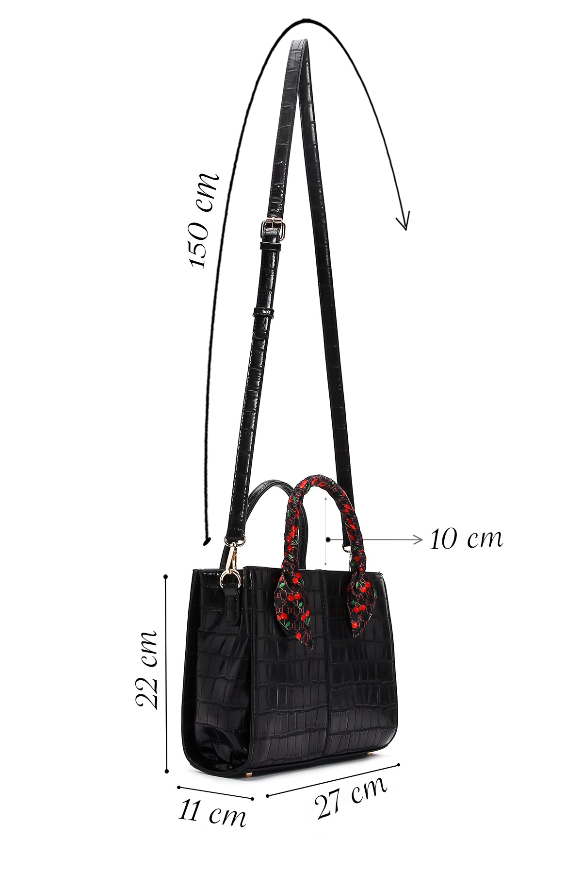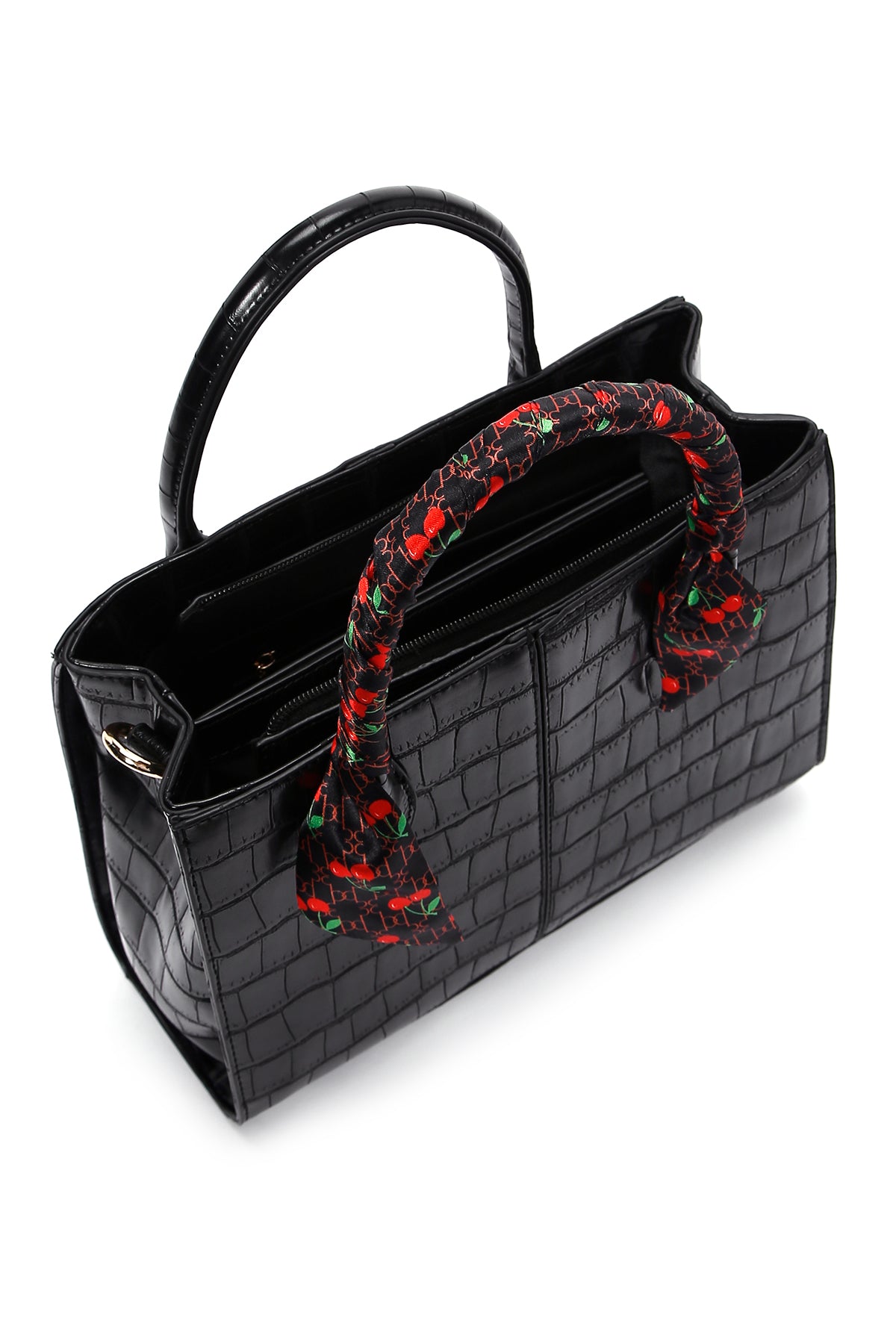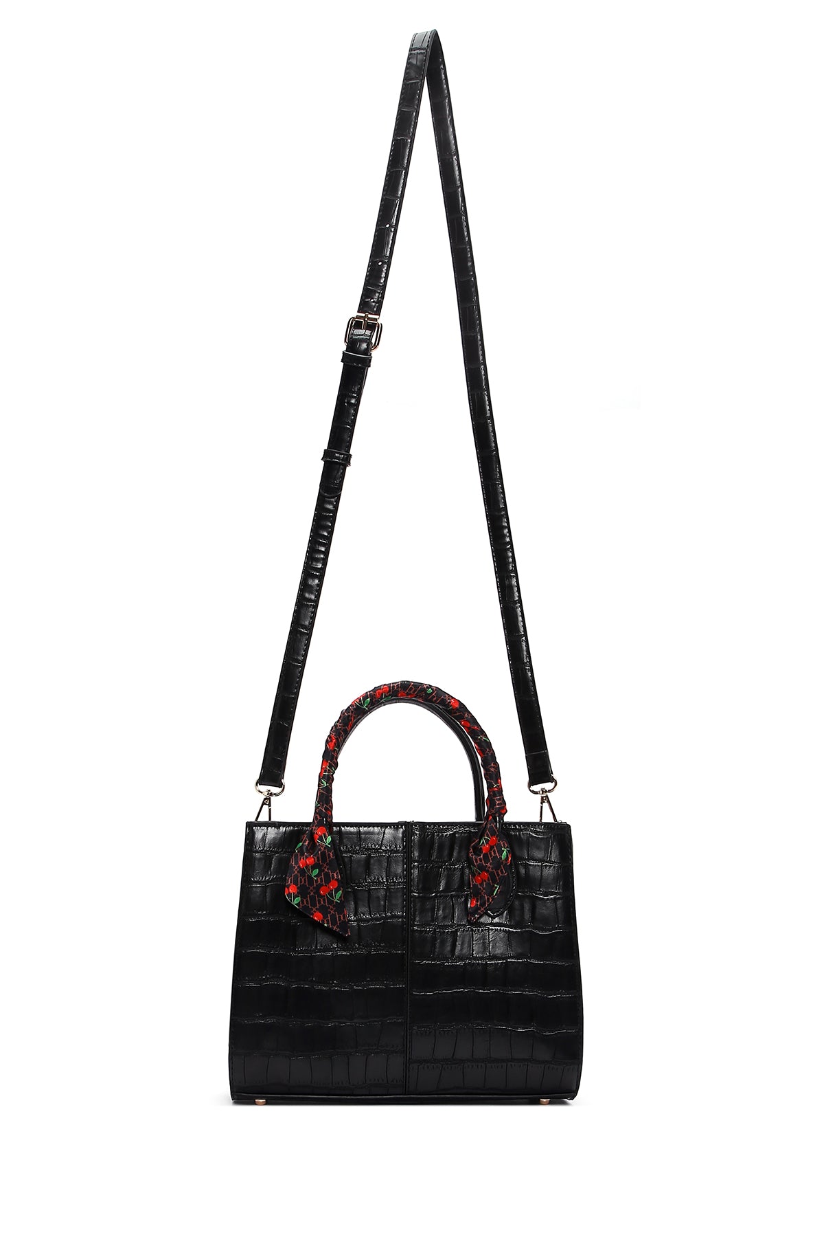 Kadın Siyah Uzun Askılı Aksesuar Detaylı Kroko Desenli Kol Çantası