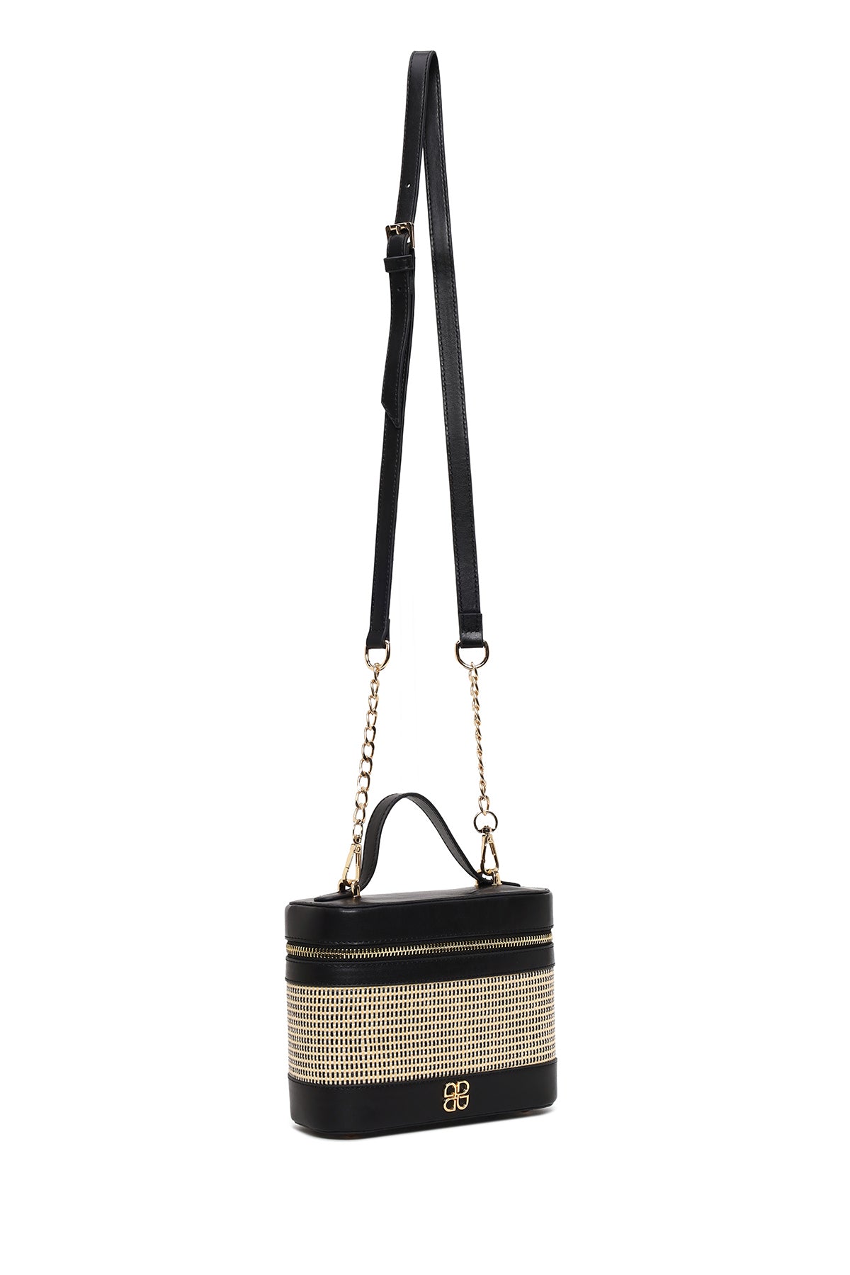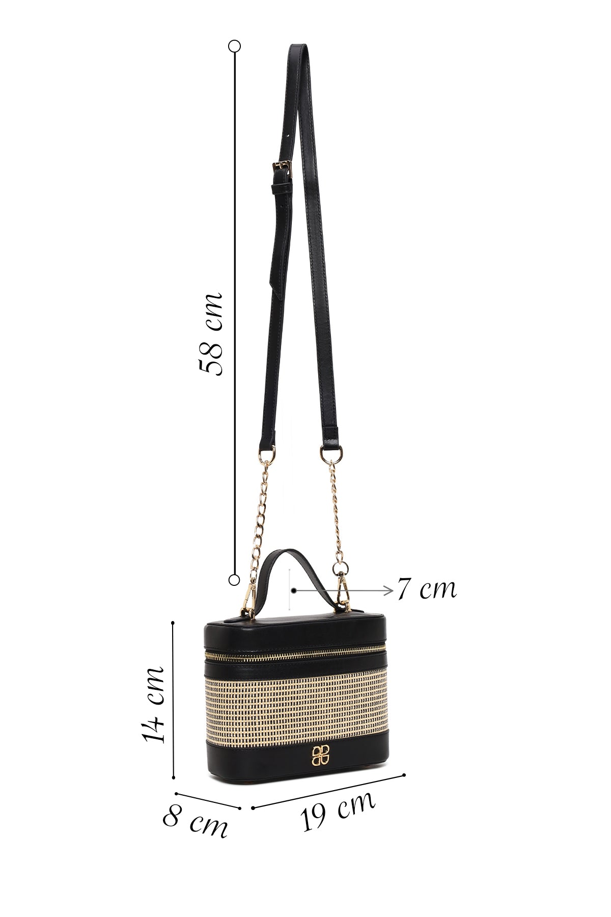 Şık siyah renkli, uzun askılı ve baskılı mini kutu formunda tasarlanmış çapraz çanta, öne çıkan kompakt yapısı ve örgü desenli yüzeyiyle dikkat çeker. Şehir hayatının dinamik temposunda ve ofis kullanımında zahmetsizce kullanılabilir; küçük ebatlarıyla işlevselliği artırır ve taşıması kolaylaştırır.