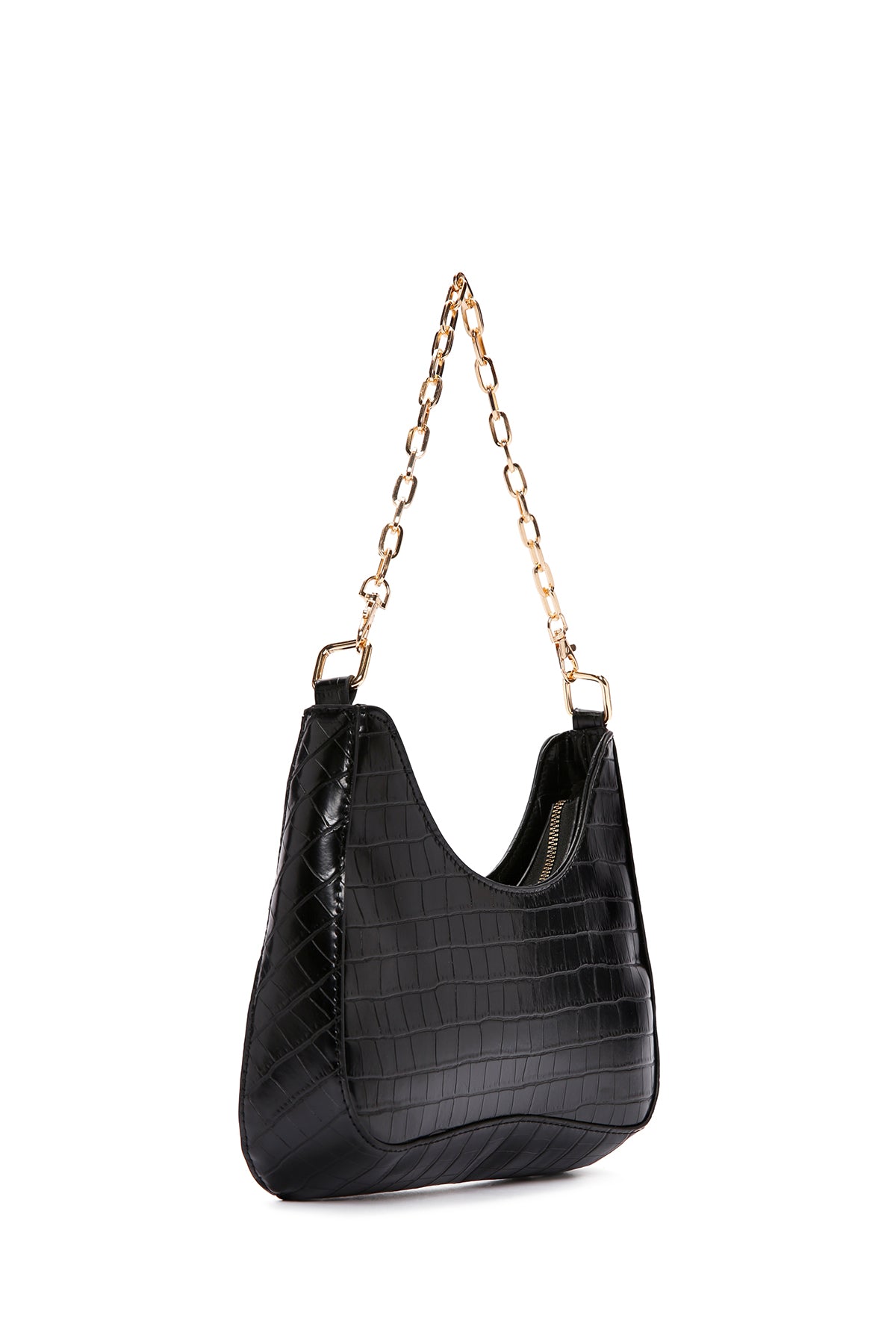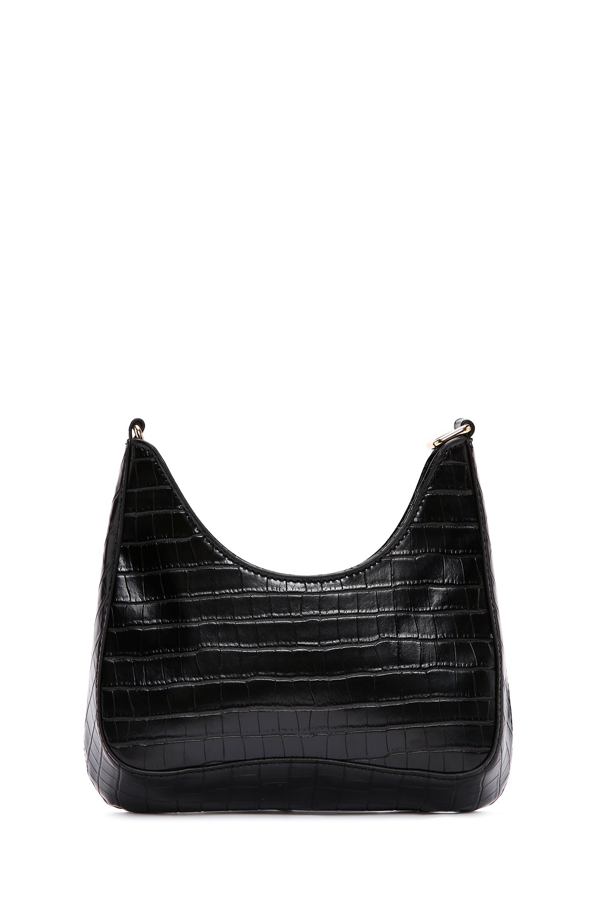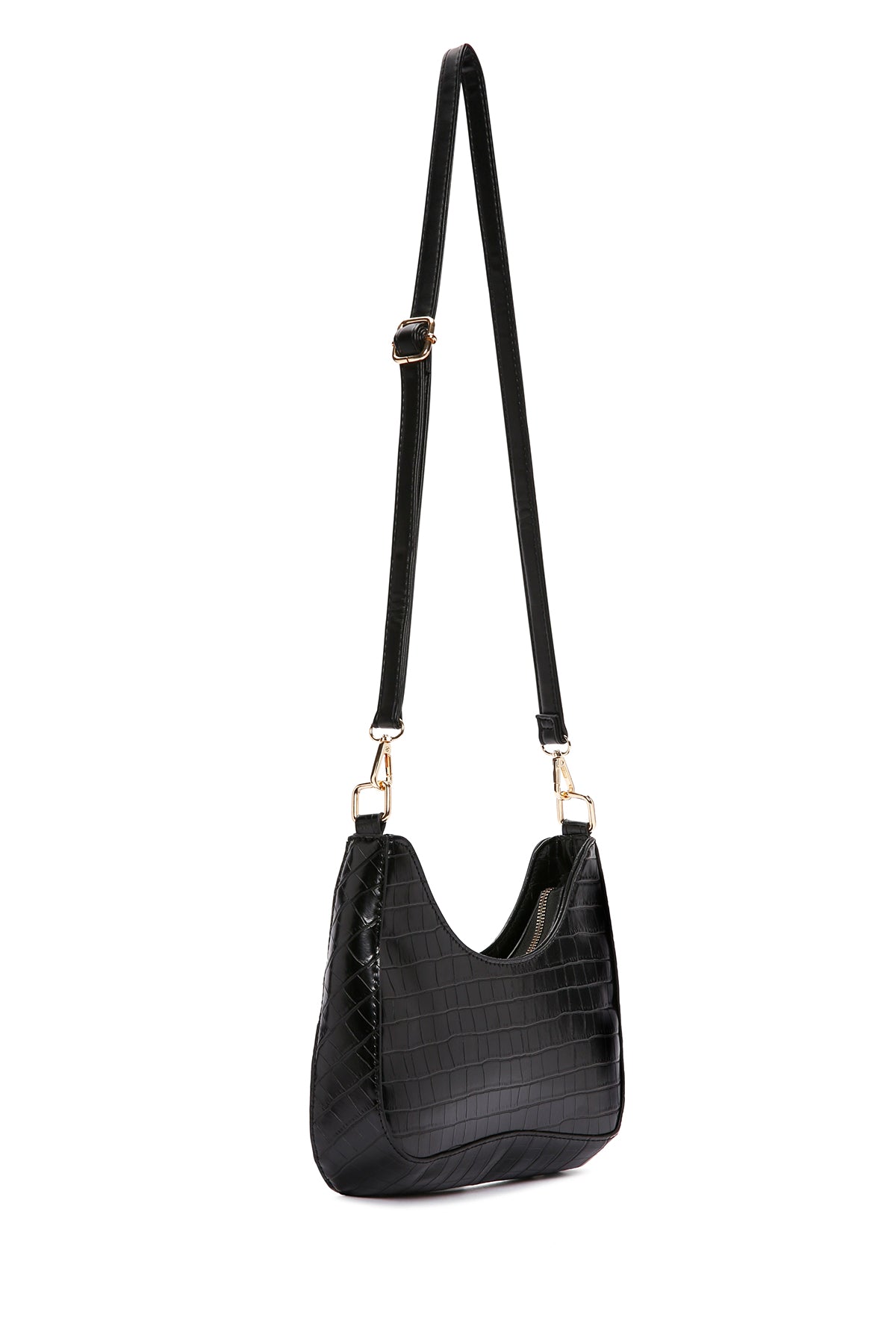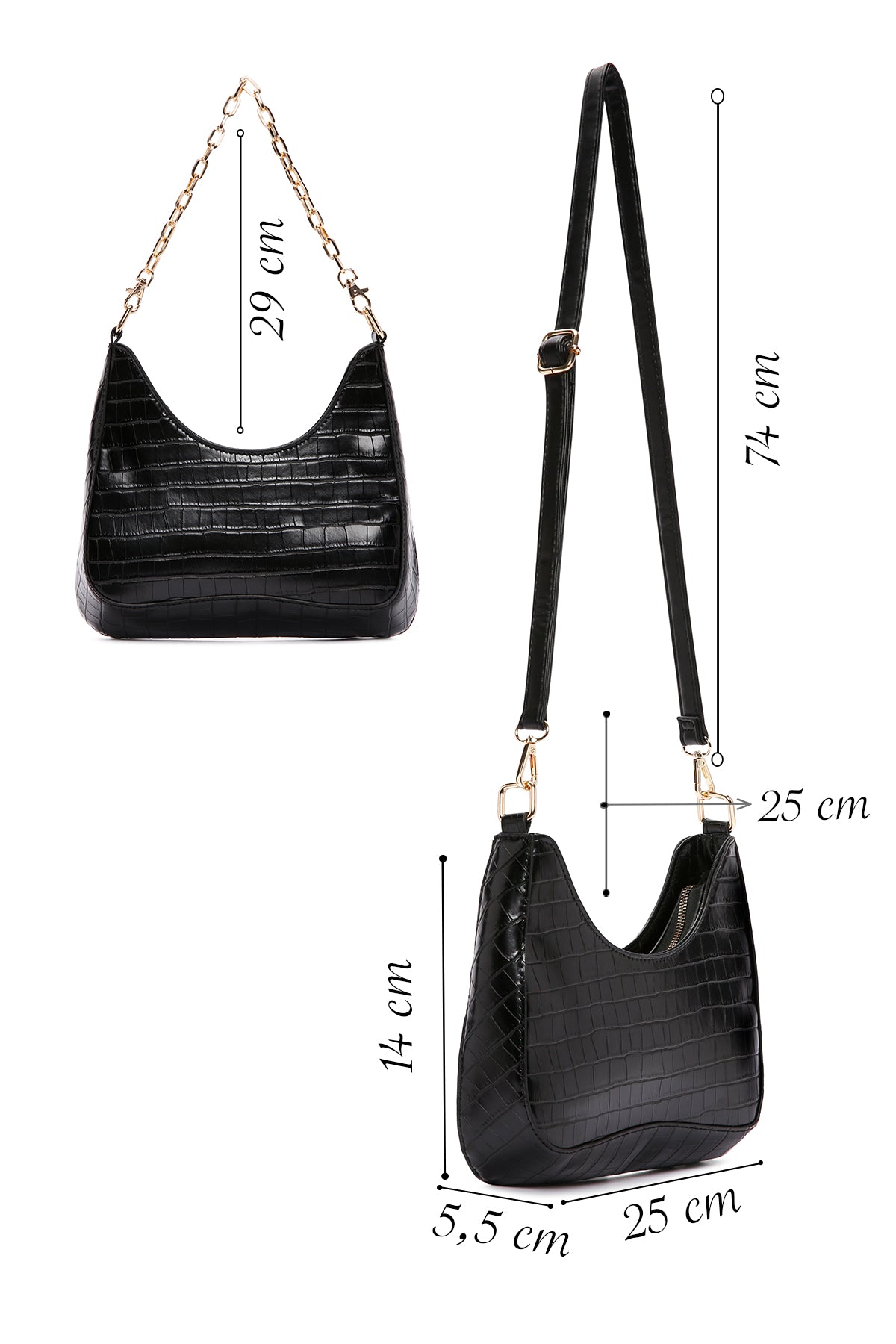 Kadın Siyah Uzun Askılı Kroko Desenli Kol Çantası, zarafeti ve modern tasarımı bir araya getiriyor. Kroko desenli yüzeyi, çantaya dikkat çekici bir hava katarken, gold renkli zincir askı detayı ile öne çıkar. İki boy askı seçeneği sayesinde çantayı hem omuzda hem de elde taşıma imkanı sunar. Günlük kullanım için ideal olan bu çanta, şıklığı ile her ortamda stilinizi tamamlayacak. Fonksiyonel yapısı ve estetik duruşuyla gardırobunuzun vazgeçilmez parçası olacak bu kol çantasını hemen keşfedin! Ürünün ebatları 25x5,5x14 cm olup, uzun askı uzunluğu 74 cm ve kısa askı uzunluğu 29 cm'dir. Ürünün kodu: 23WBD2644E3 11