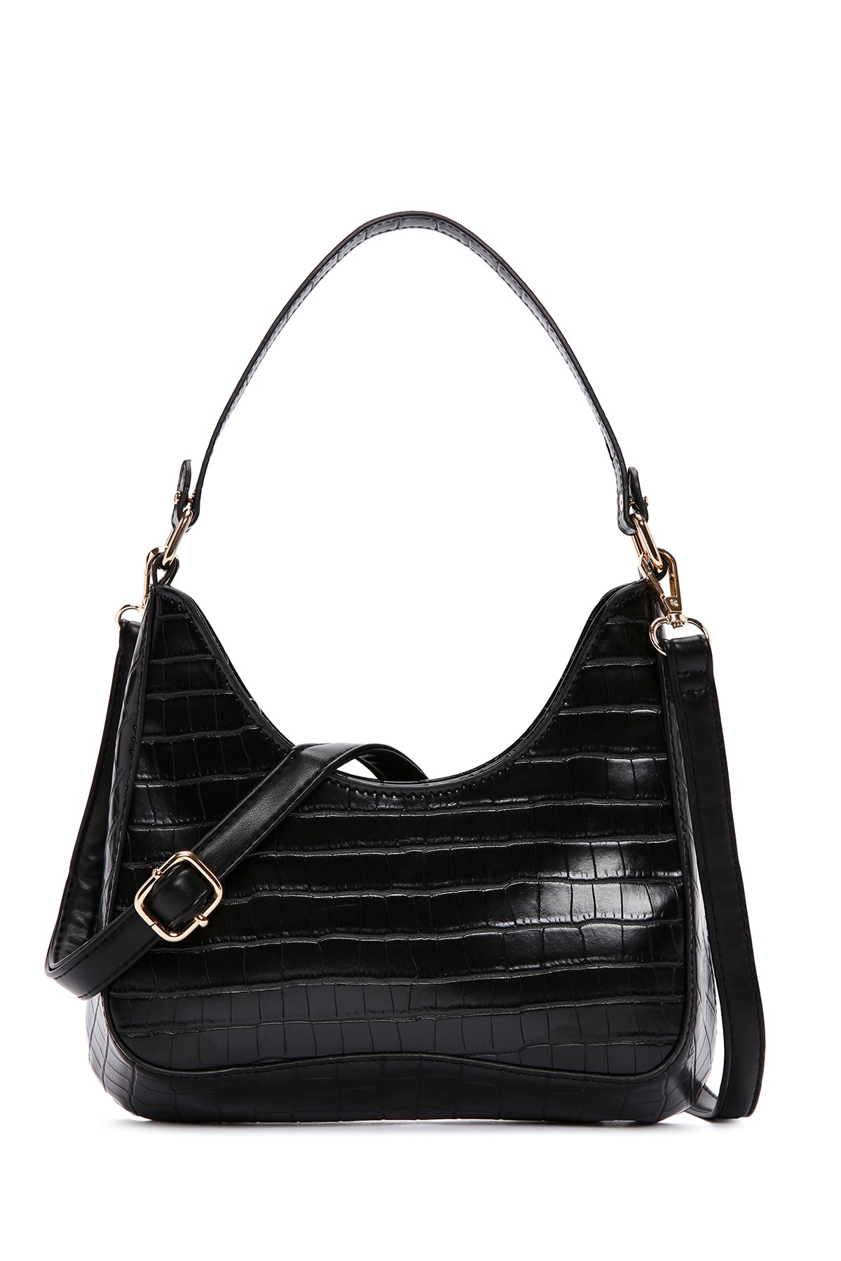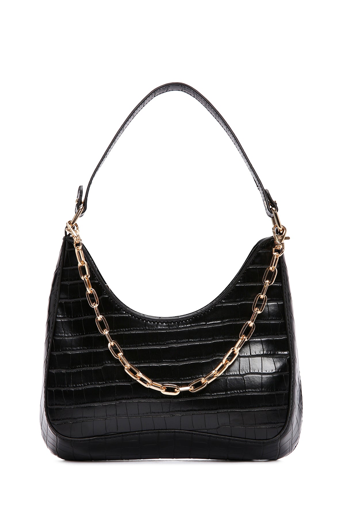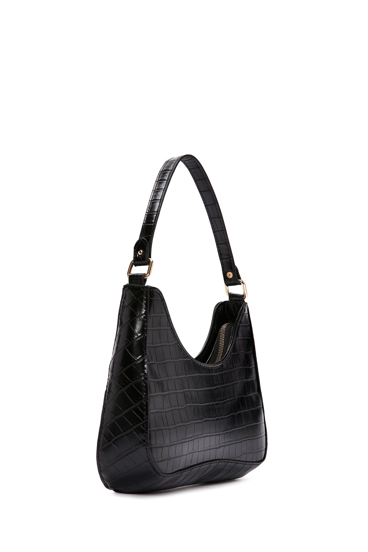 Kadın Siyah Uzun Askılı Kroko Desenli Kol Çantası, zarafeti ve modern tasarımı bir araya getiriyor. Kroko desenli yüzeyi, çantaya dikkat çekici bir hava katarken, gold renkli zincir askı detayı ile öne çıkar. İki boy askı seçeneği sayesinde çantayı hem omuzda hem de elde taşıma imkanı sunar. Günlük kullanım için ideal olan bu çanta, şıklığı ile her ortamda stilinizi tamamlayacak. Fonksiyonel yapısı ve estetik duruşuyla gardırobunuzun vazgeçilmez parçası olacak bu kol çantasını hemen keşfedin! Ürünün ebatları 25x5,5x14 cm olup, uzun askı uzunluğu 74 cm ve kısa askı uzunluğu 29 cm'dir. Ürünün kodu: 23WBD2644E3 11