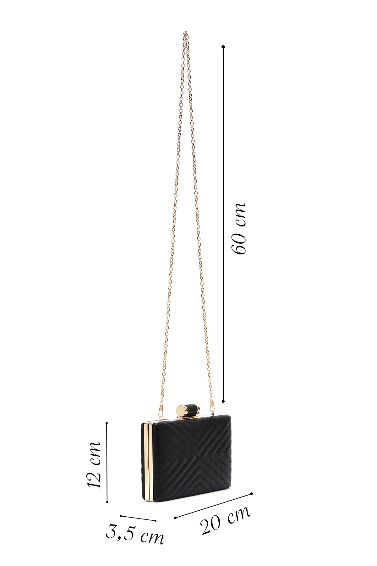 Şık ve modern tasarımıyla göz alıcı bir görünüm sunan siyah zincir askılı portföy çanta, özel davetler ve gece kullanımı için ideal bir seçim. 20 cm genişlik, 12 cm yükseklik ve 3,5 cm derinlik ölçüleriyle kompakt bir yapıya sahip olan çanta, mini boyutuyla taşıma kolaylığı sağlıyor. Üzerindeki özel dokulu desenler ve altın rengi metal detaylar çantaya zarif bir görünüm katarken, 60 cm uzunluğundaki zincir askısı sayesinde hem omuzda hem de çapraz kullanım imkanı sunuyor. Sentetik malzemeden üretilen çanta, dayanıklı yapısıyla dikkat çekerken, kumaş iç astarı eşyalarınızı düzenli bir şekilde taşımanıza olanak tanıyor. Kış koleksiyonunun parçası olan bu portföy çanta, özellikle abiye kıyafetler ve özel davetler için mükemmel bir tercih oluşturuyor. Ürün kodu: 24WBD2700KP