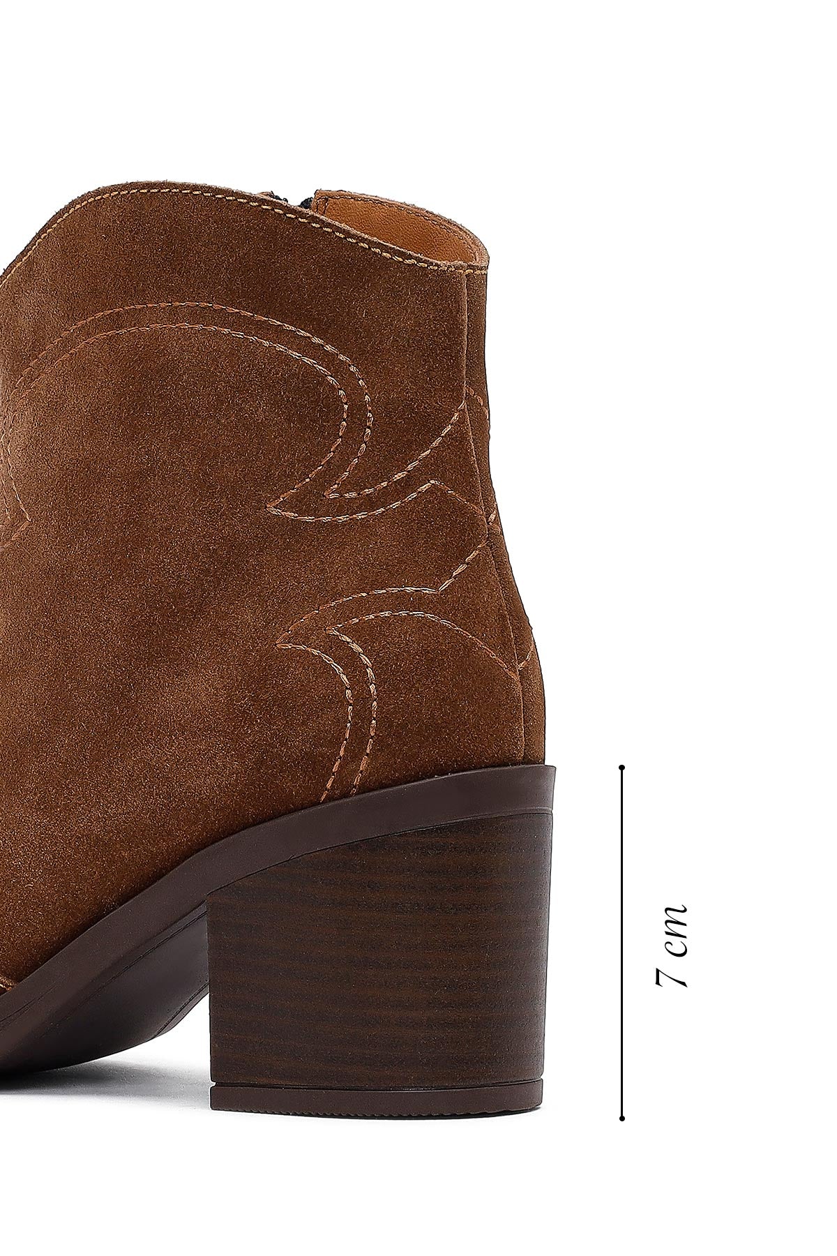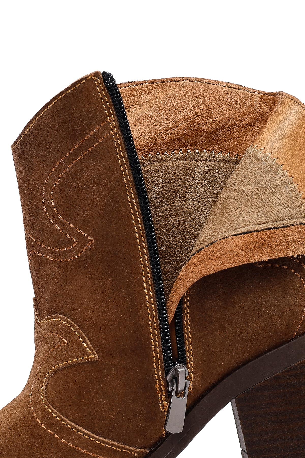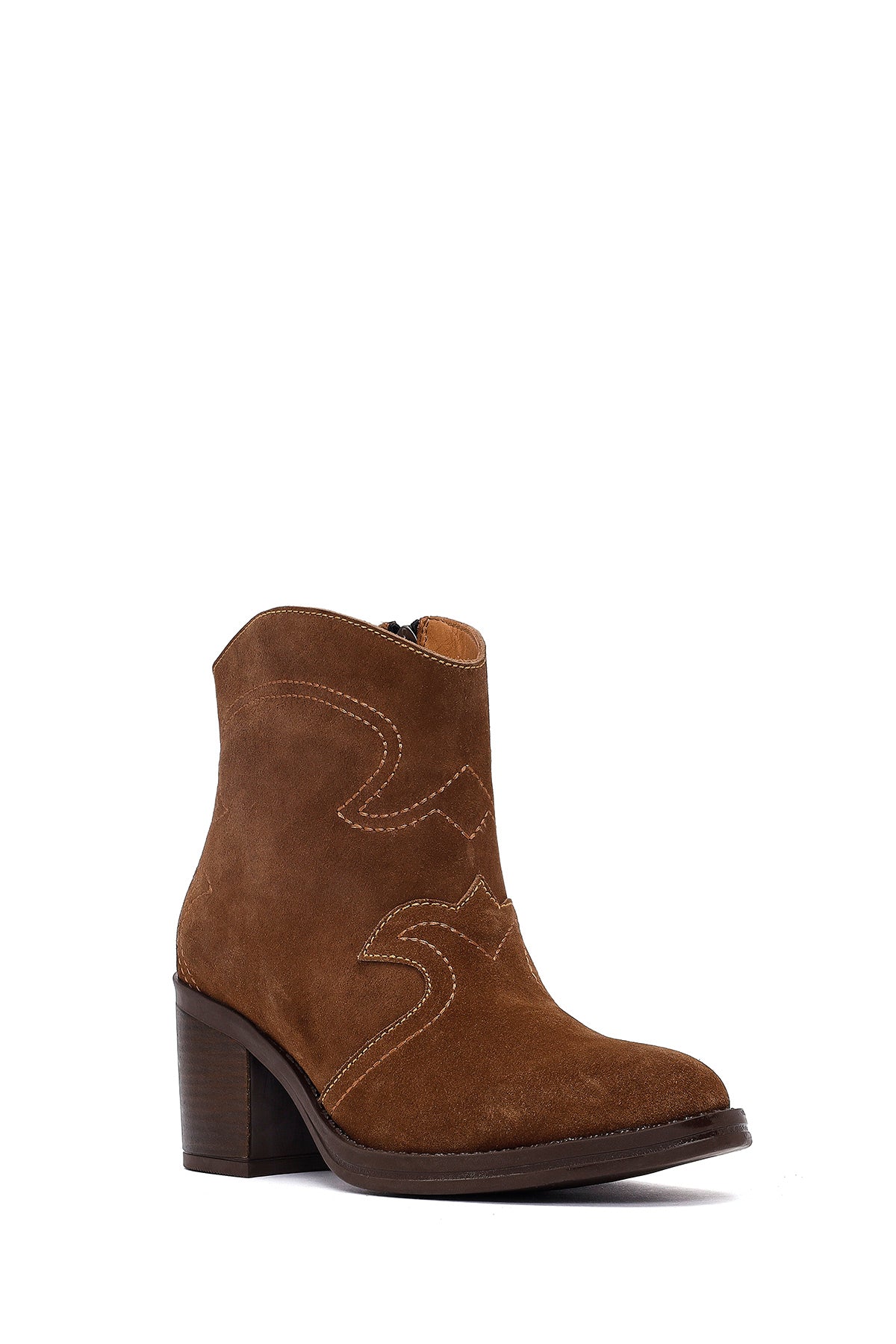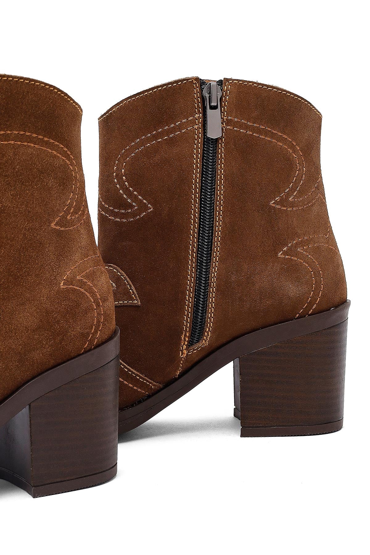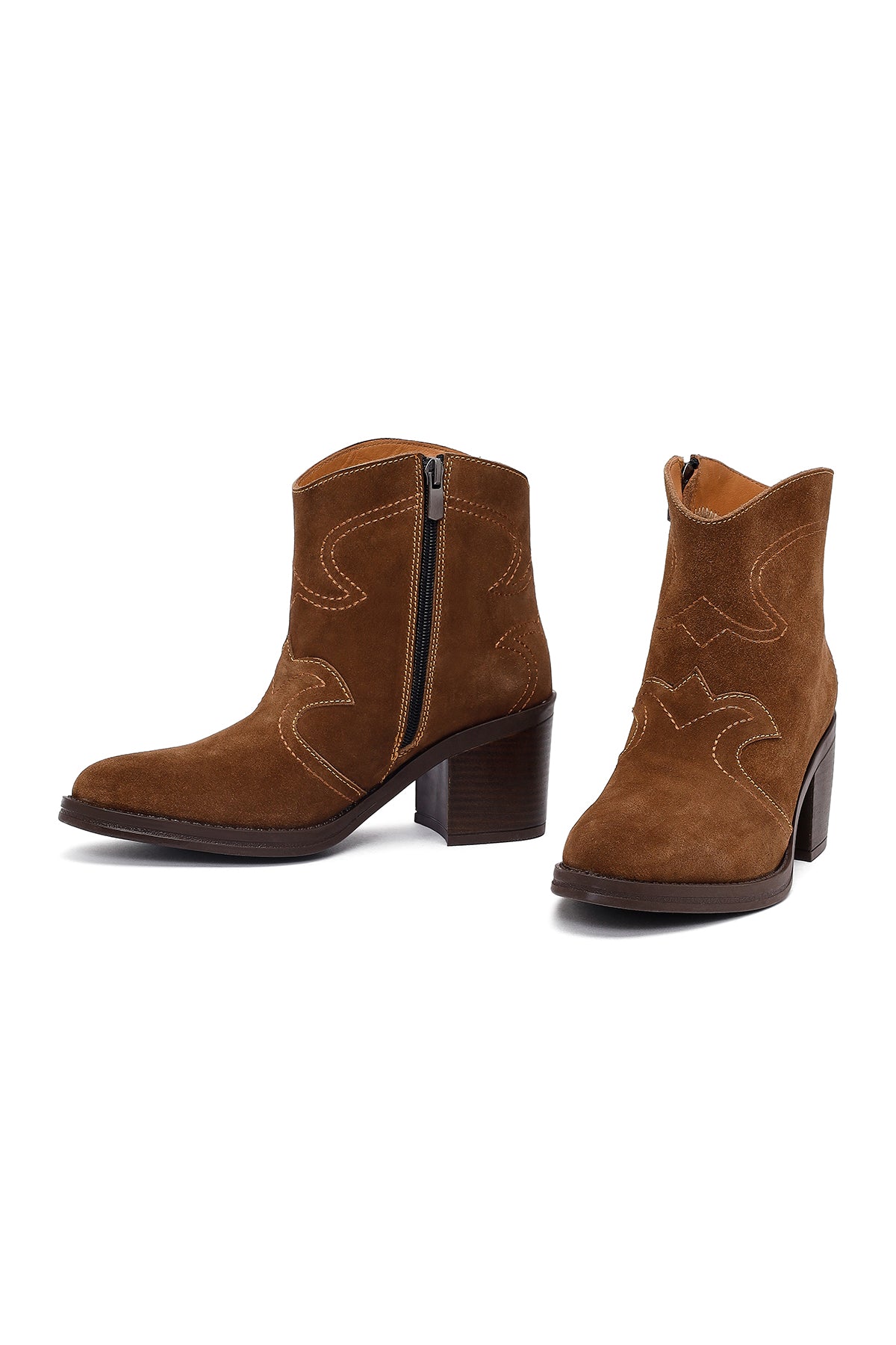 Derimod'un sonbahar koleksiyonundan, taba rengi süet deriden üretilen kovboy bot modeli, 7 cm yüksekliğindeki kalın topuğu ile modern bir siluet sunuyor. Klasik western tarzı dikişleri ve yan fermuarı ile kullanım kolaylığı sağlayan model, tekstil iç astarı ile mevsime uygun bir kullanım sunuyor. Günlük kombinlerden şık davetlere kadar geniş bir kullanım alanına sahip olan bot, jean'lerden elbiselere, eteklerden dar paçalı pantolonlara kadar pek çok kıyafetle uyum sağlıyor. Sonbahar ve kış mevsimlerinde tercih edilebilir. Ürün kodu: 25AFD221210