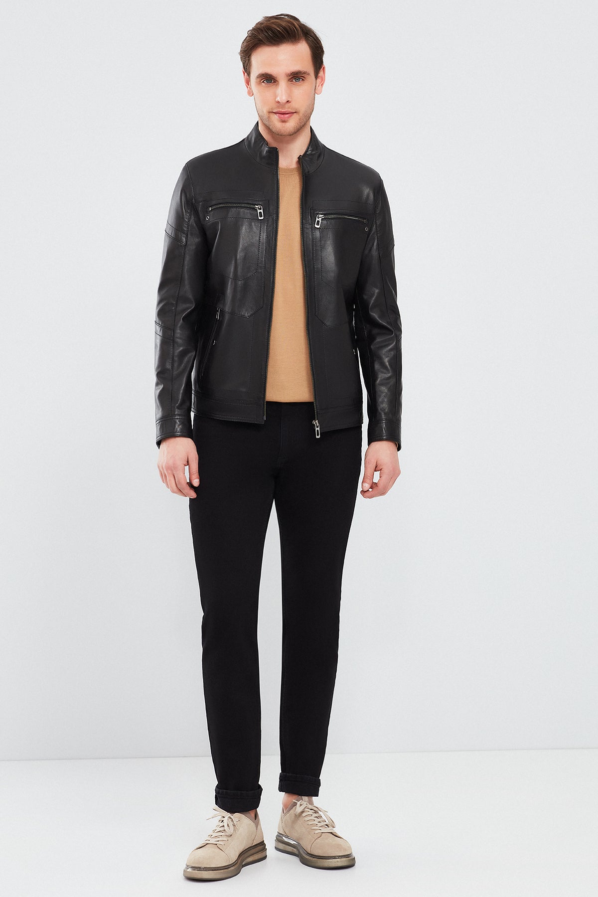 Kimmich Erkek Siyah Deri Mont, zarif ve işlevsel tasarımıyla dikkat çekiyor. Deri materyali sayesinde hem dayanıklı hem de şık bir görünüm sunar. Hakim yaka tasarımı, modern ve şık bir hava katarken, fermuarlı kapama detayı pratiklik sağlar. Dört adet dış cep, günlük ihtiyaçlarınız için ekstra alan sunar ve iki iç cep de önemli eşyalarınızı güvenle taşımanıza imkan verir. Regular fit kesimi, rahat ve şık bir kullanım deneyimi sunar. Hem günlük yaşamda hem de özel günlerde tercih edebileceğiniz bu mont, gardırobunuzun vazgeçilmez bir parçası olacak. Ürünün kodu: 24SGD6506U4 11