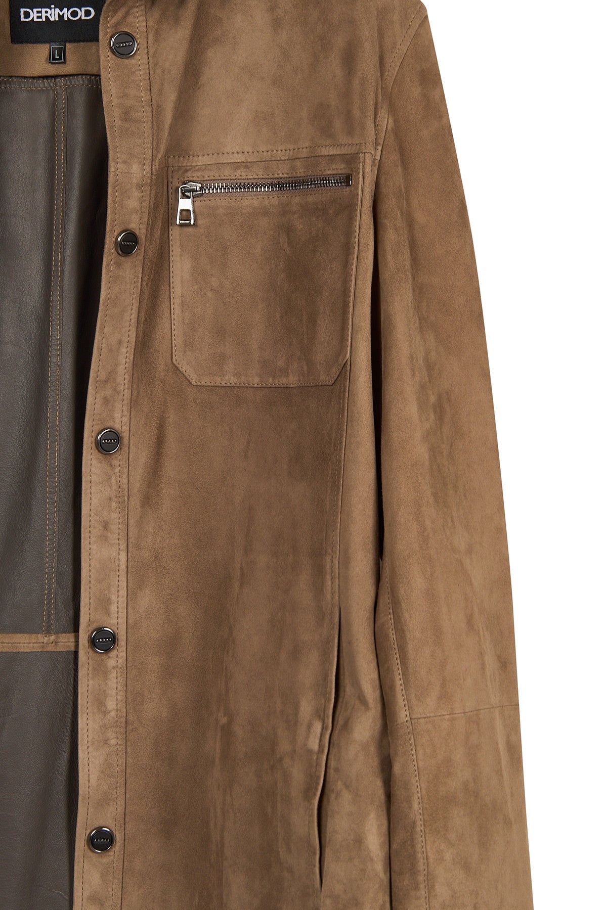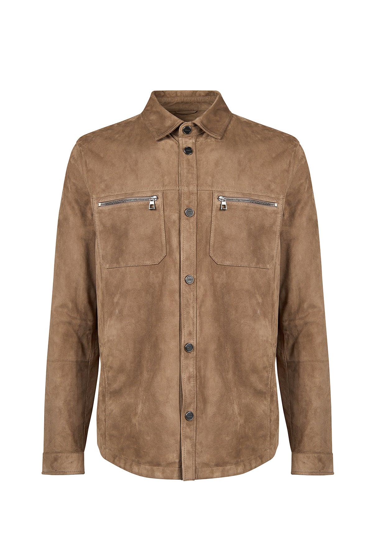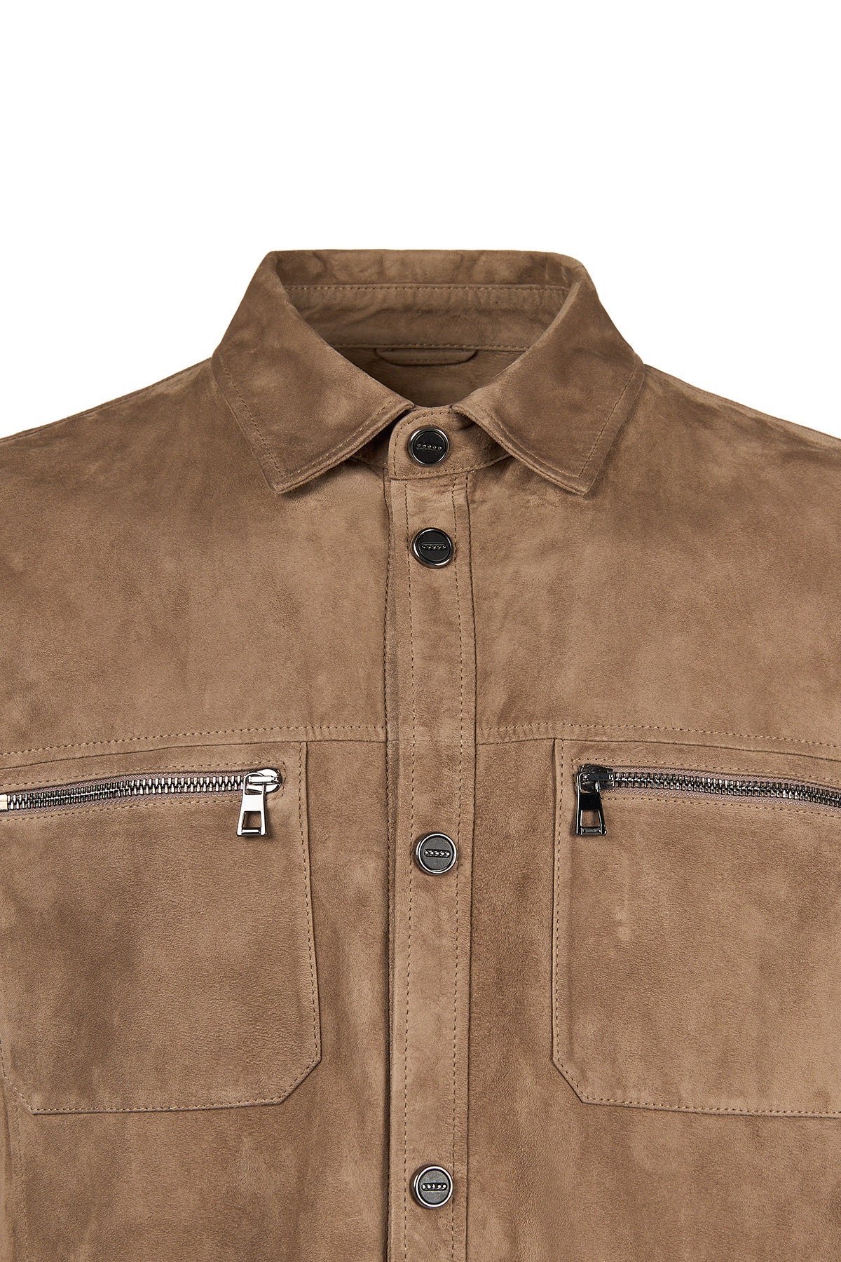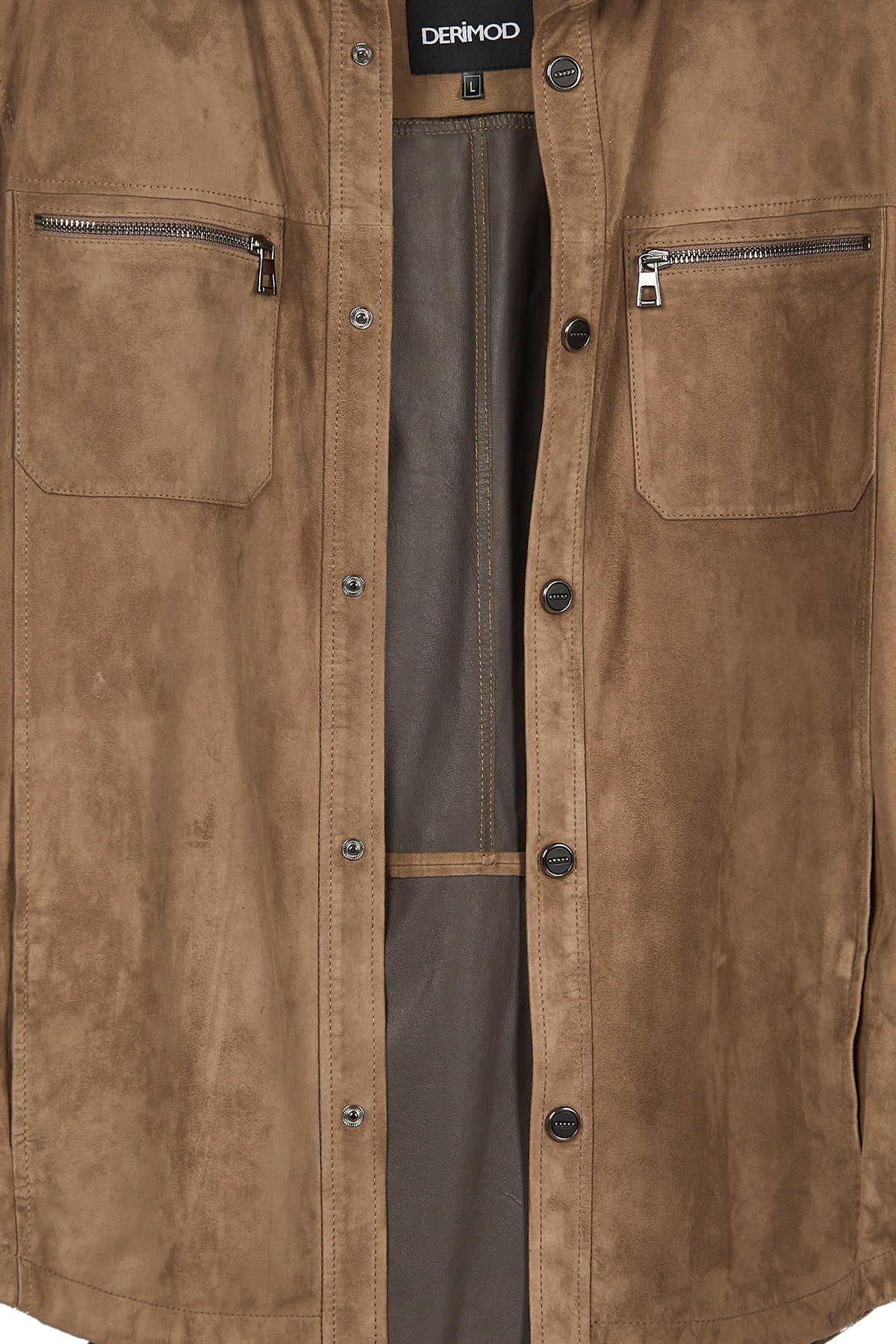 Vizon renkte hakiki süet deri kullanılarak üretilmiş astarsız bir gömlek ceket modelidir. Şehir hayatında veya ofis ortamında rahatça kullanılabilir ve sade dizaynı sayesinde farklı kombinlerle bütünleşir. Ön yüzünde yer alan iki yatay fermuarlı cep ve çıtçıt kapama detayı hem pratiklik, hem de modern bir görünüm sunar.