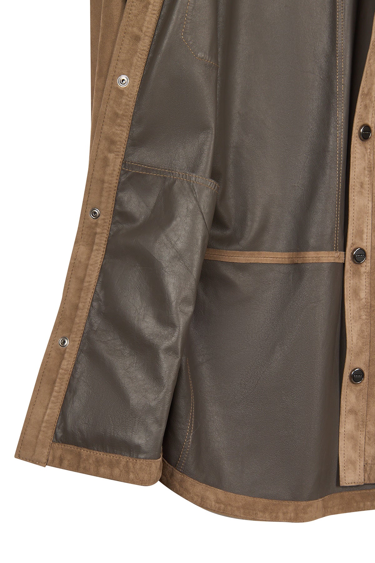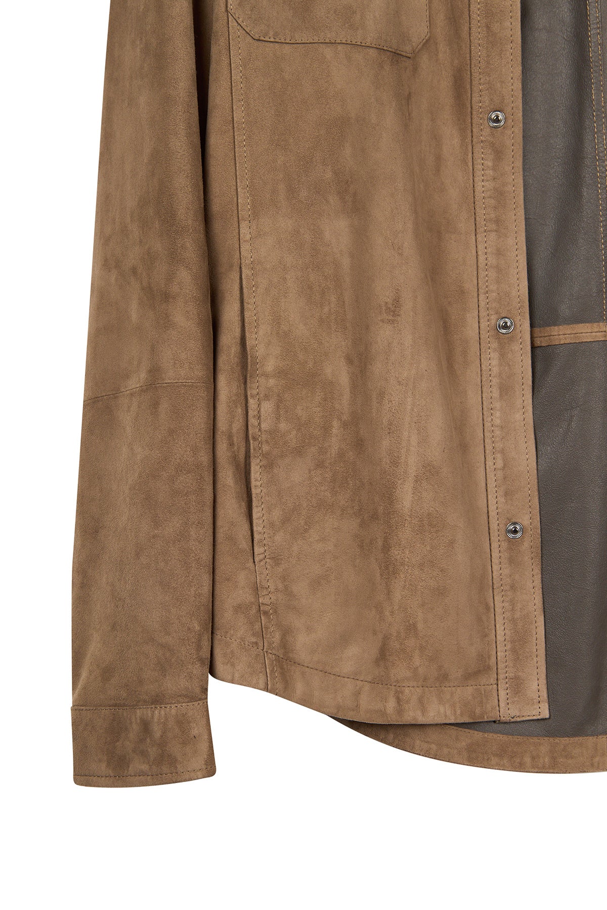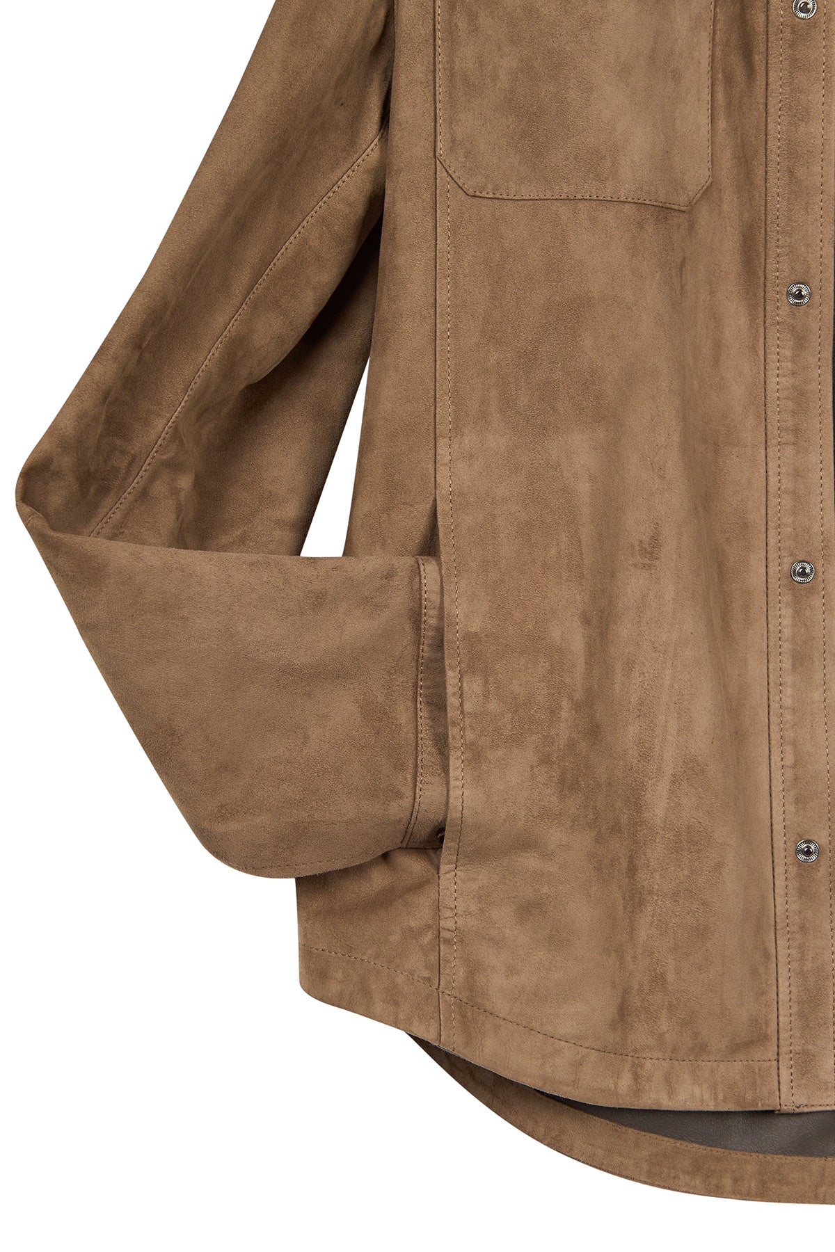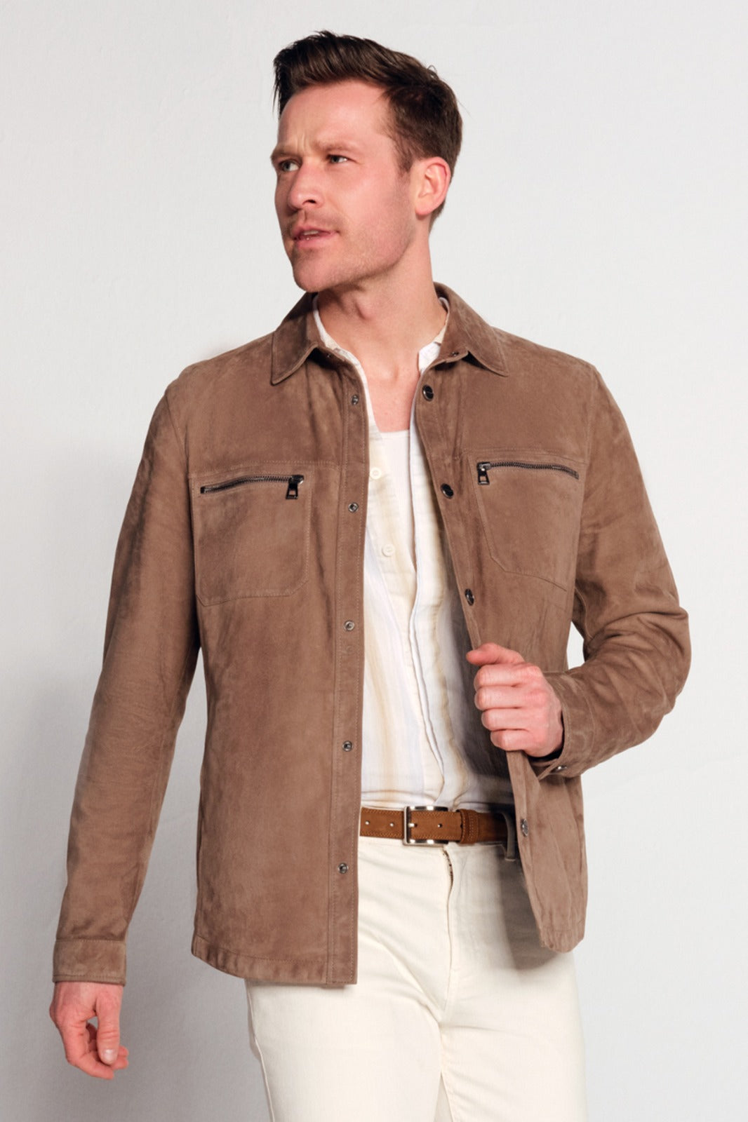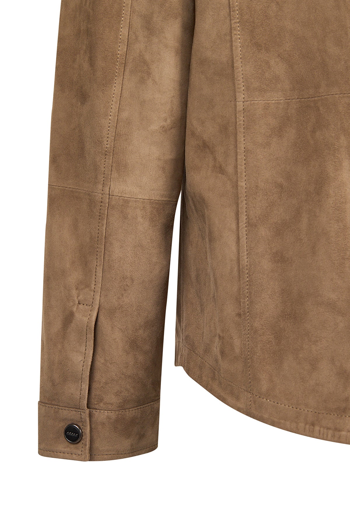 Vizon renkte hakiki süet deri kullanılarak üretilmiş astarsız bir gömlek ceket modelidir. Şehir hayatında veya ofis ortamında rahatça kullanılabilir ve sade dizaynı sayesinde farklı kombinlerle bütünleşir. Ön yüzünde yer alan iki yatay fermuarlı cep ve çıtçıt kapama detayı hem pratiklik, hem de modern bir görünüm sunar.