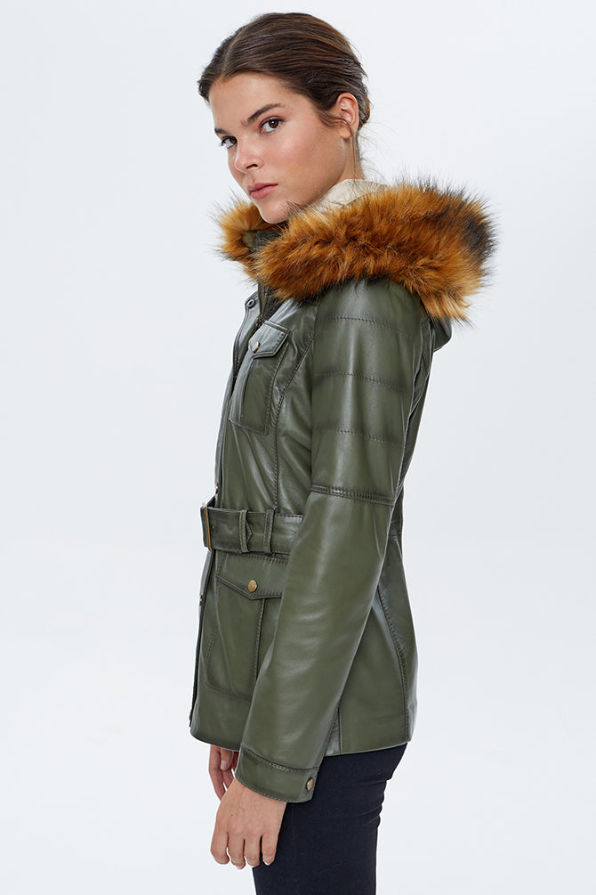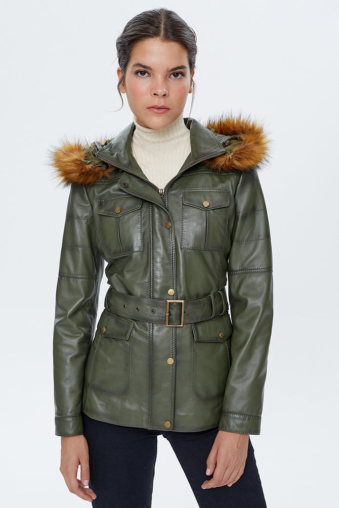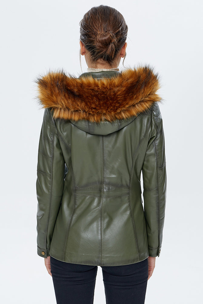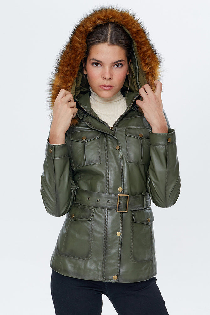 Latinia Kadın Haki Kapüşonlu Deri Mont