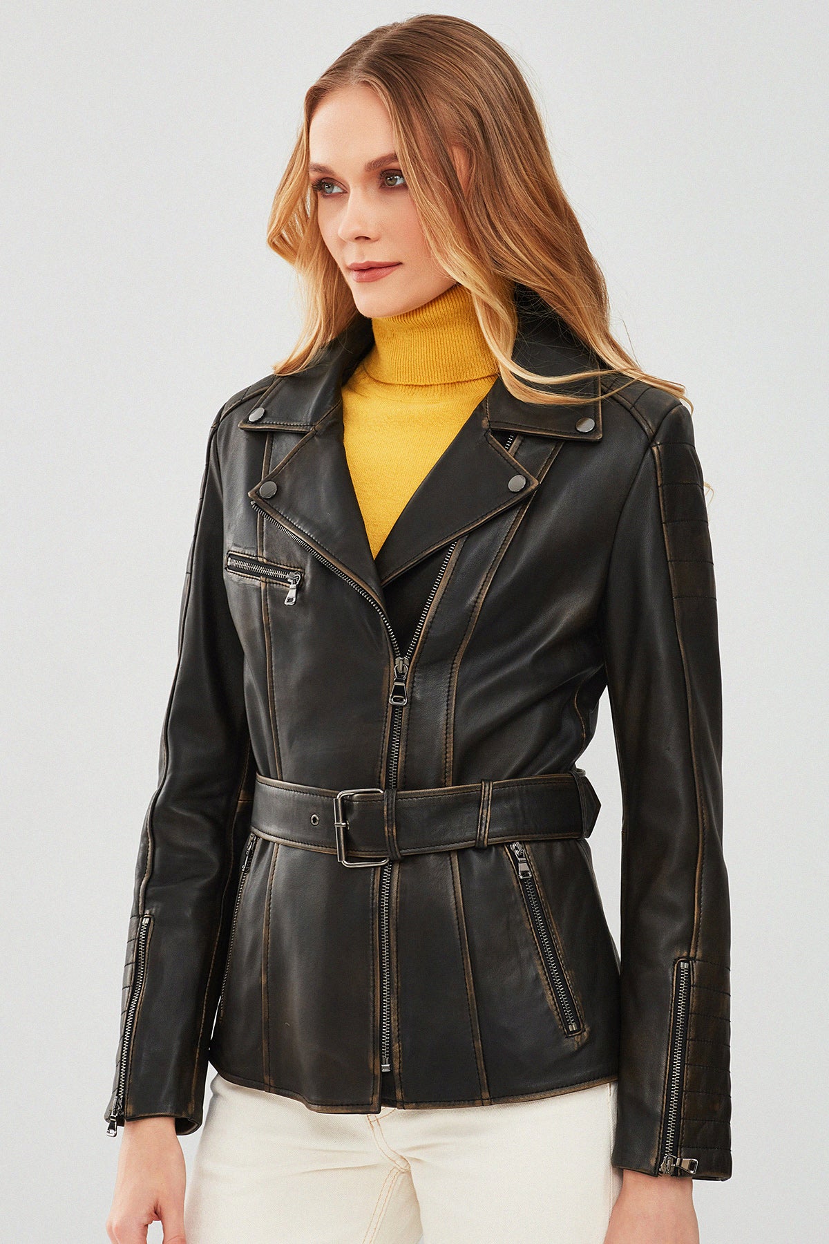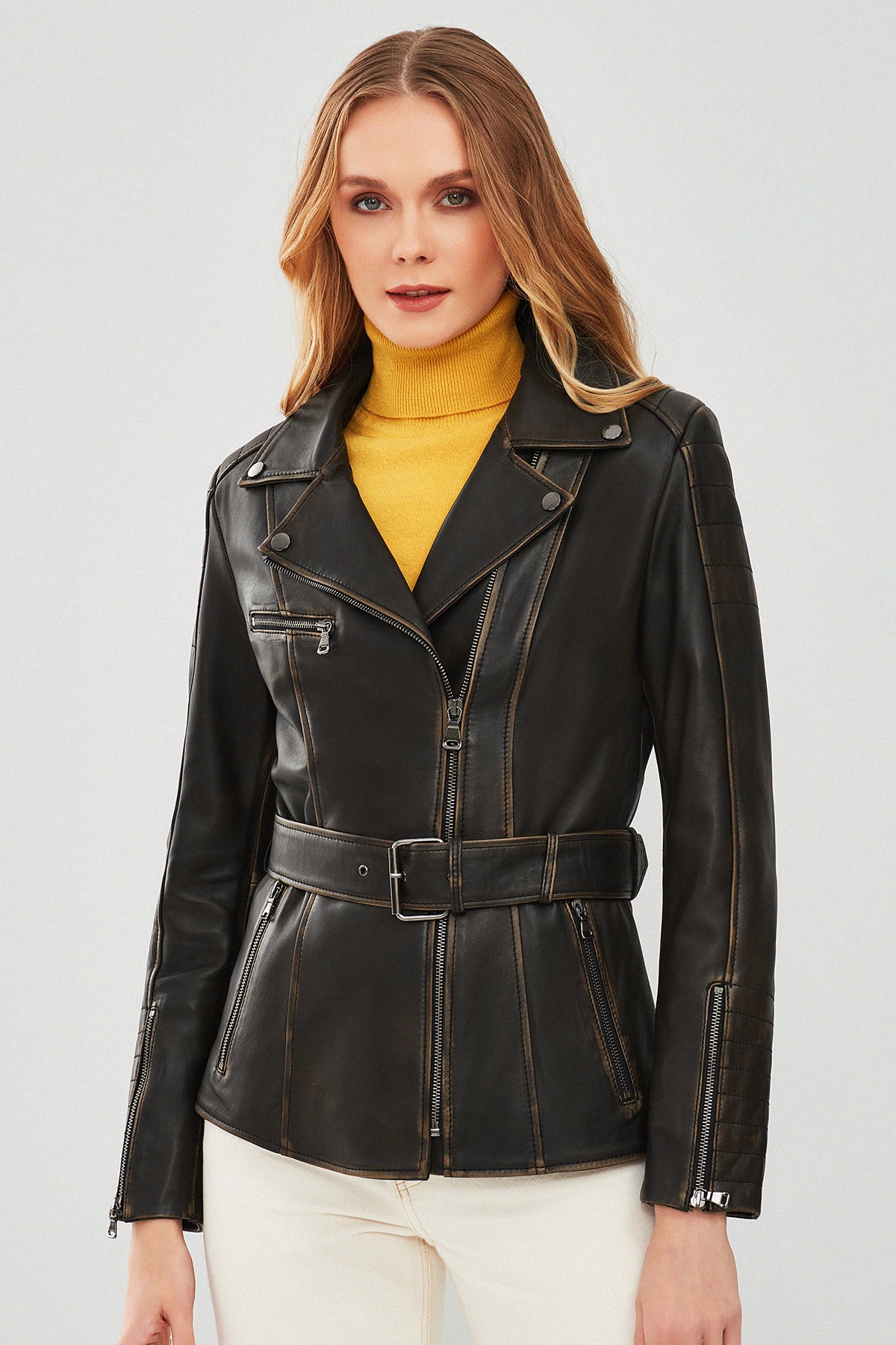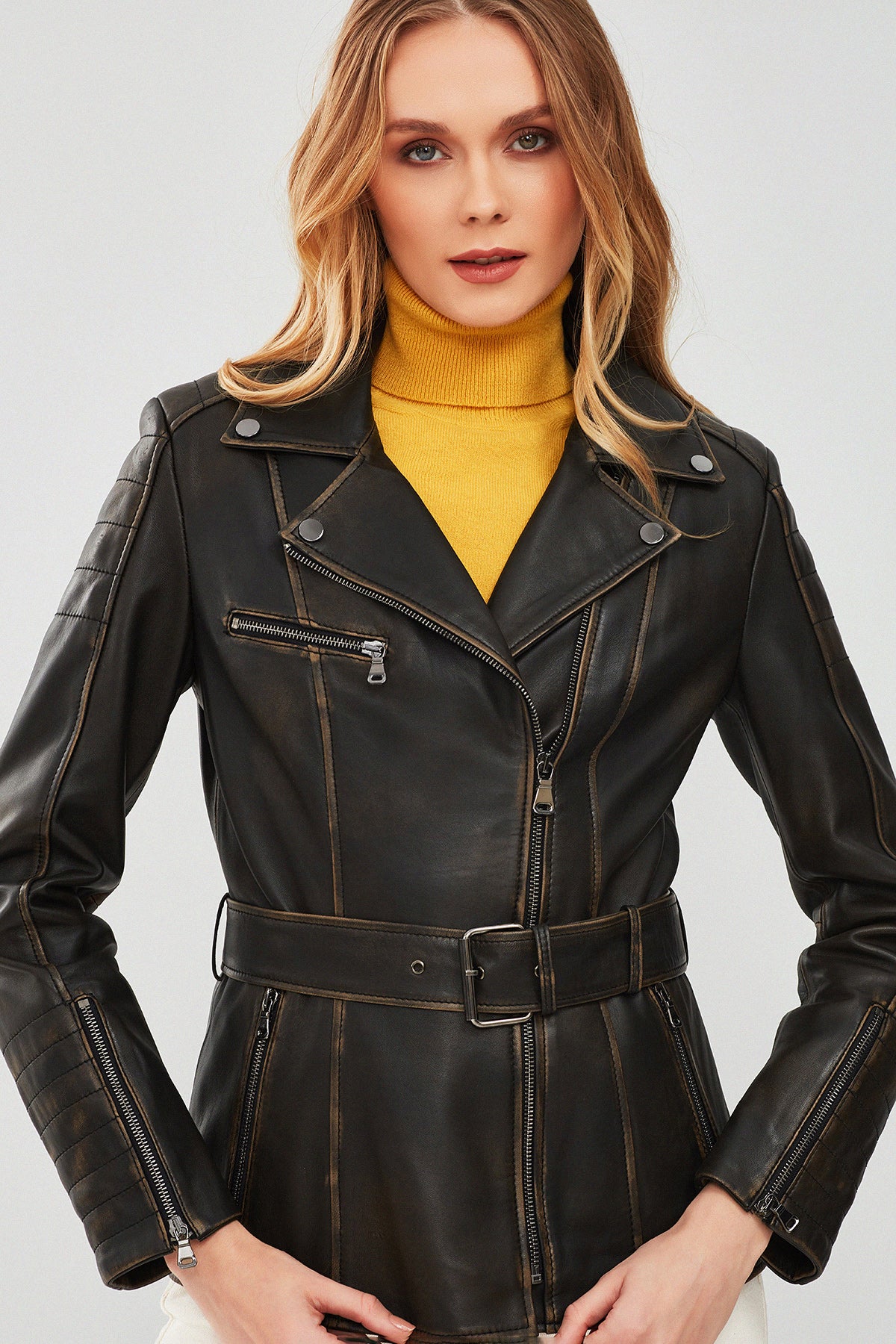 Mayfair Kadın Kahverengi Vintage Uzun Biker Deri Ceket