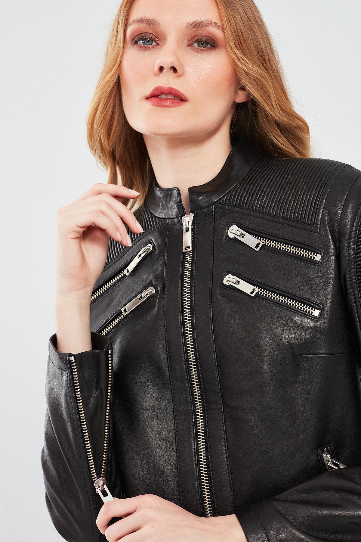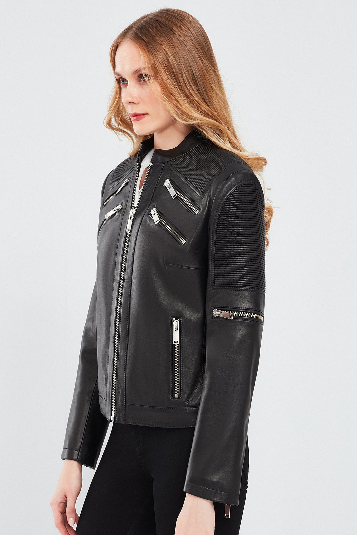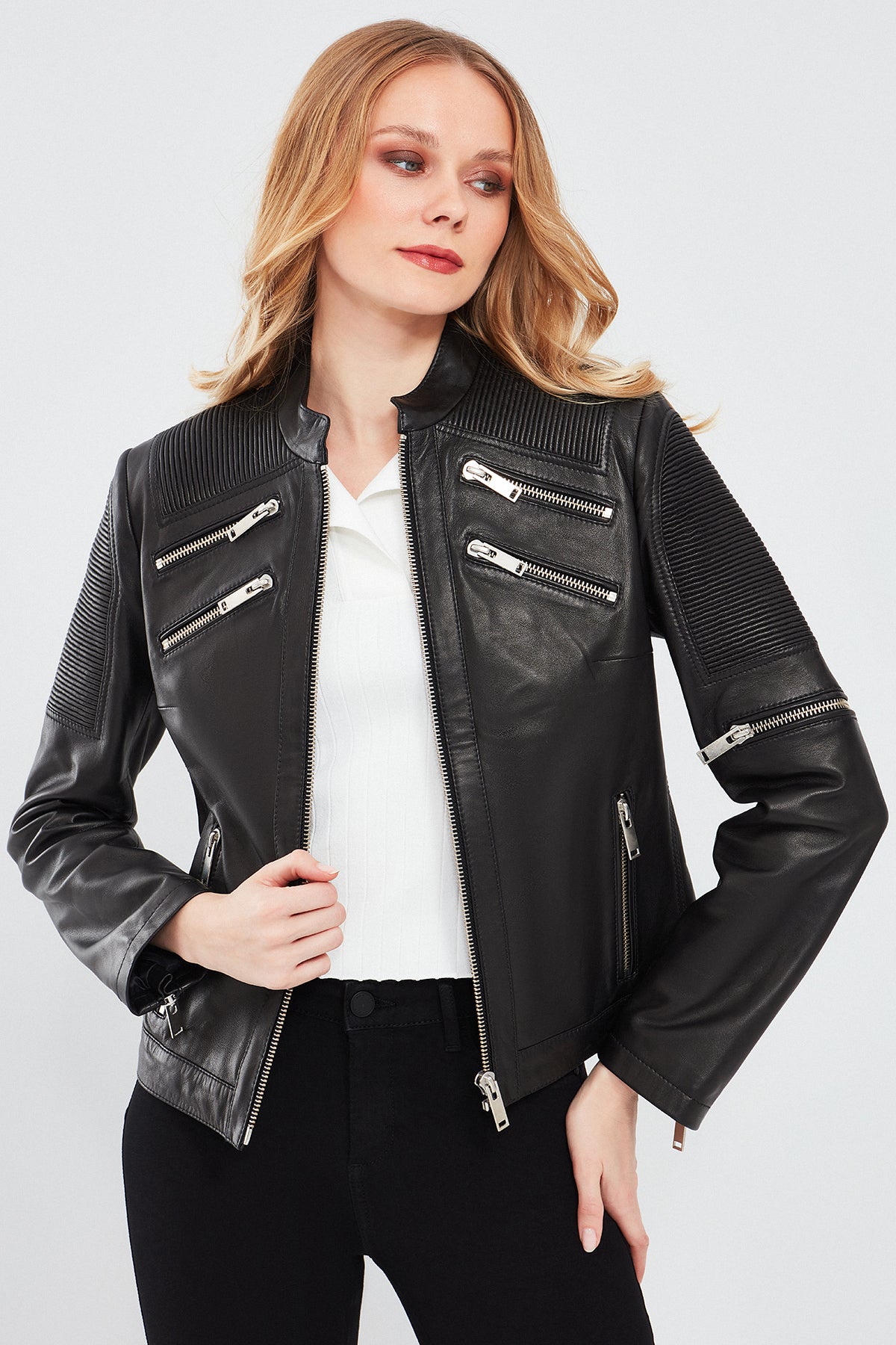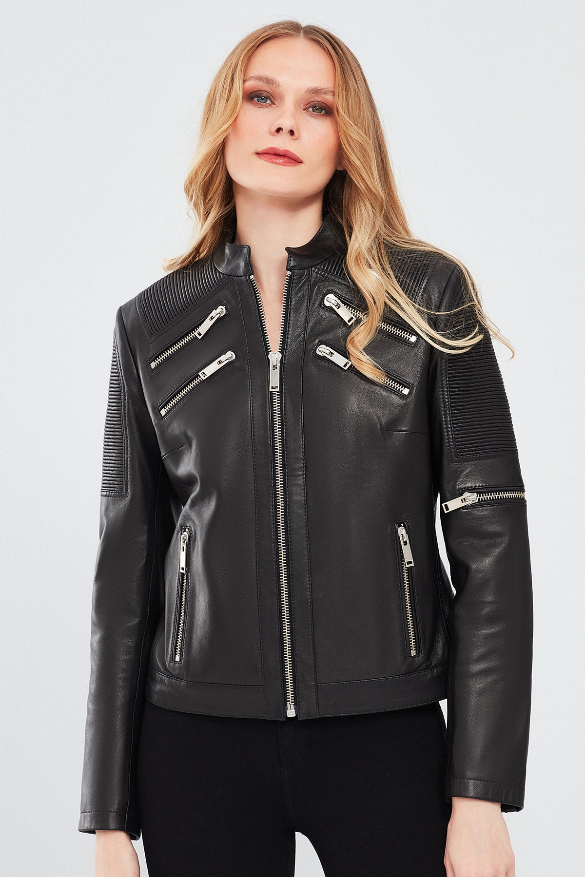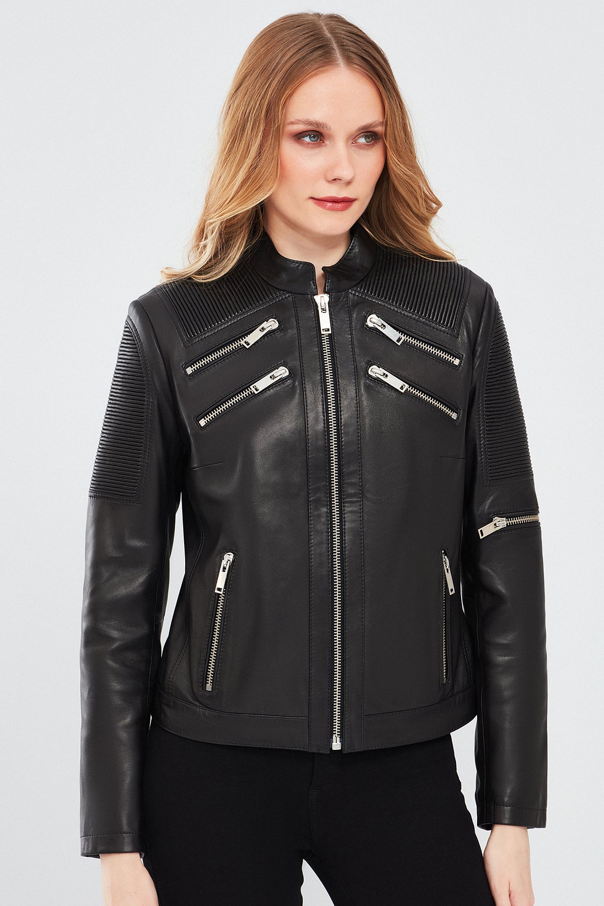 Derimod'un Milano Kadın Siyah Deri Ceketi, modern ve şık bir tarzı spor bir dokunuşla birleştiriyor. Yüksek kaliteli deri malzemesiyle üretilen bu ceket, hem dayanıklı hem de dinamik bir görünüm sunar. Siyah rengi, her kombinle kolayca uyum sağlayarak gardırobunuzun vazgeçilmez parçası olmaya adaydır. Fermuarlı kapama detayı, cekete modern bir hava katarken, hakim yaka detayı da tarzınıza özgünlük kazandırır. Milano Kadın Siyah Deri Ceket, günlük kullanımdan özel davetlere kadar geniş bir kullanım alanına sahiptir. Hem şık hem de rahat olan bu ceket, spor tarzınızı yansıtmanıza yardımcı olacaktır.