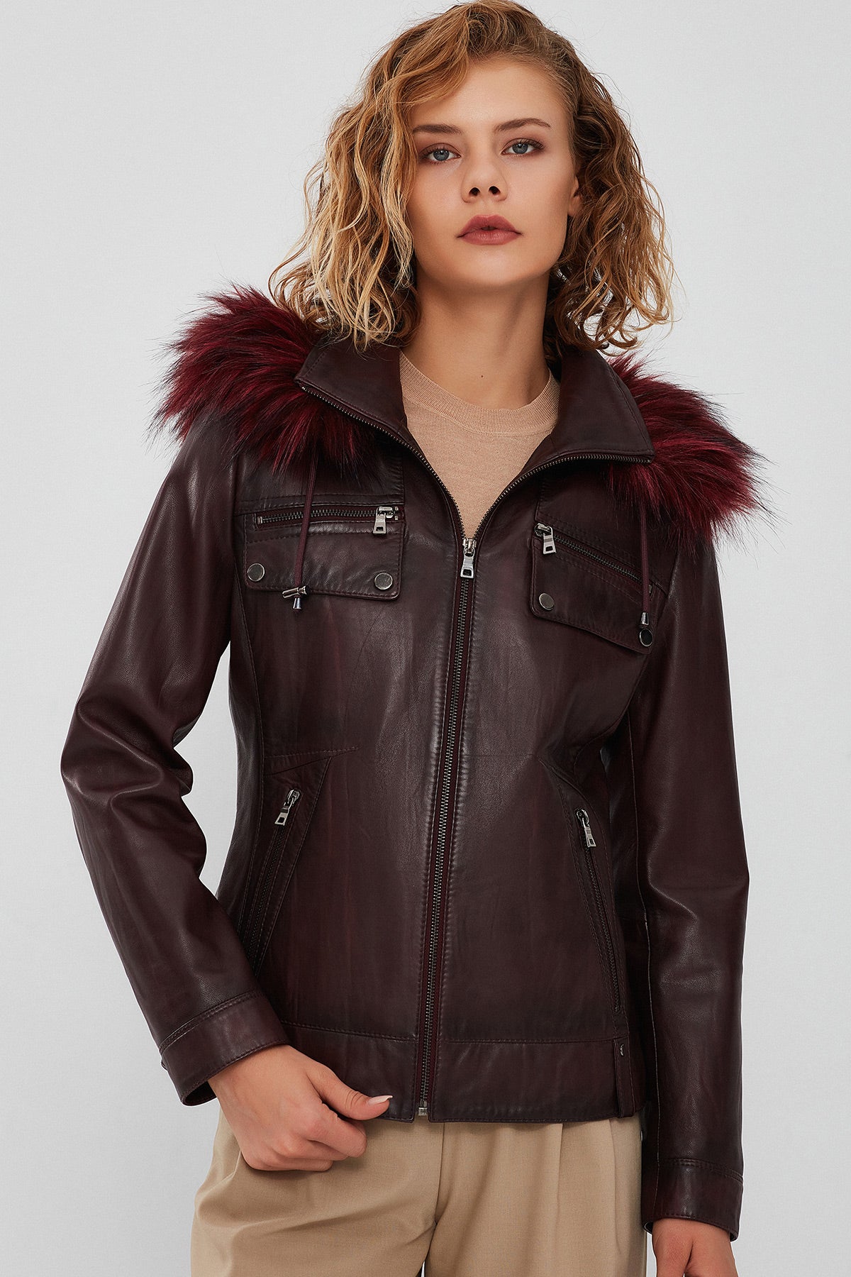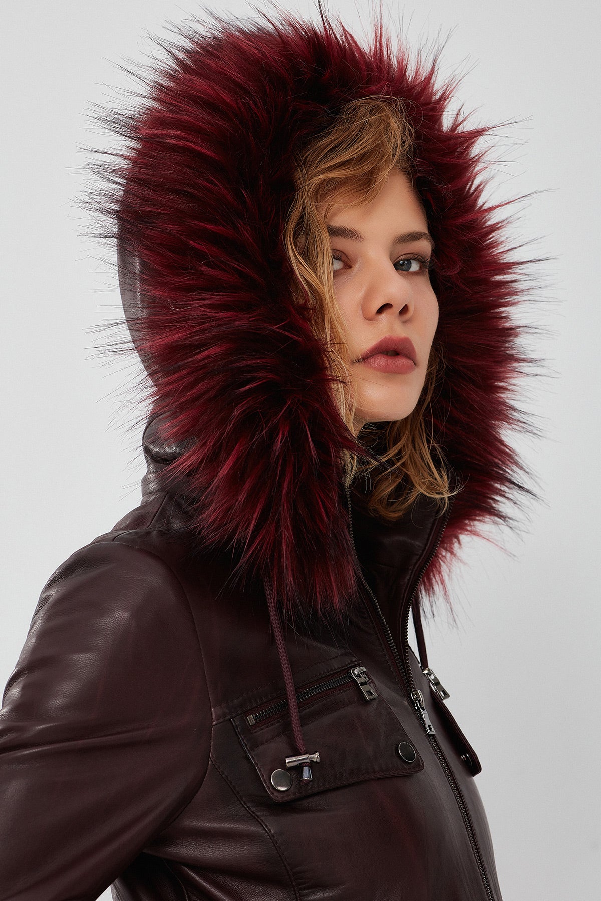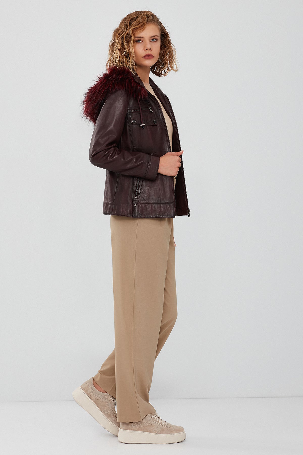 Derimod’un Zarif ve Şıklığı bir arada sunan Monica Kadın Bordo Kapüşonlu Kürklü Deri Ceket ile tarzınızı konuşturun. Ürünün kodu: 23WGE5121NC 66