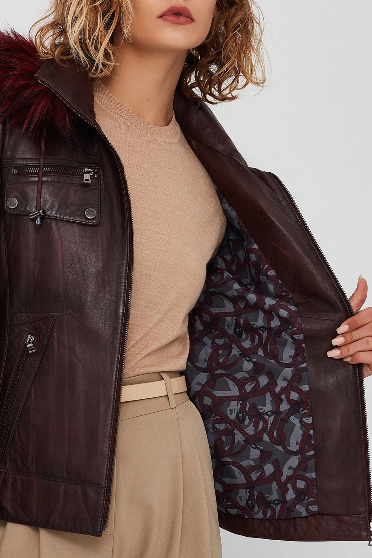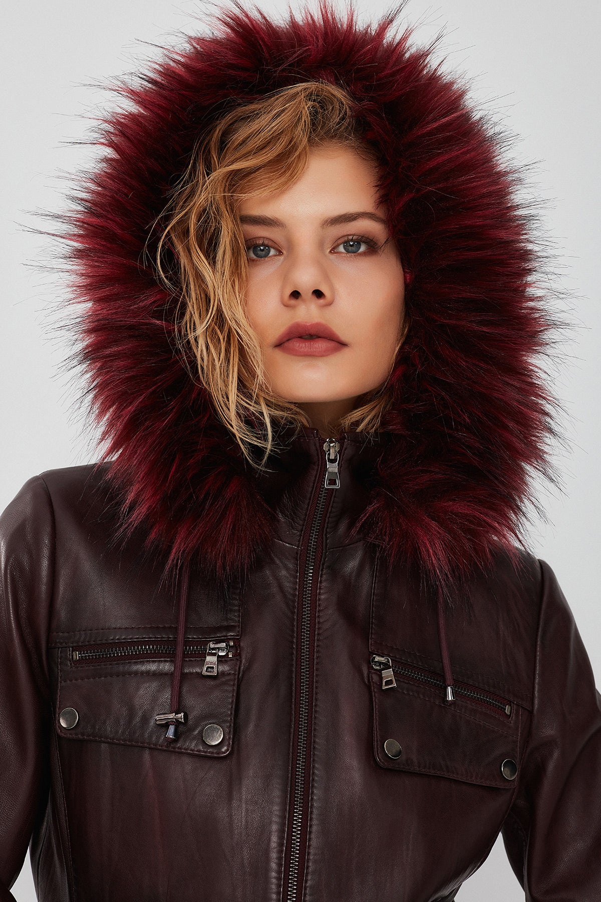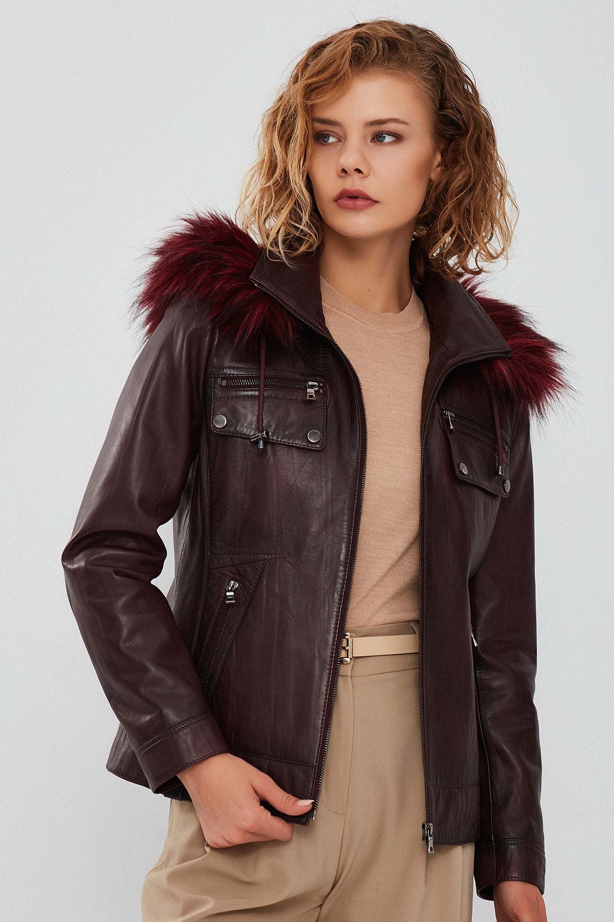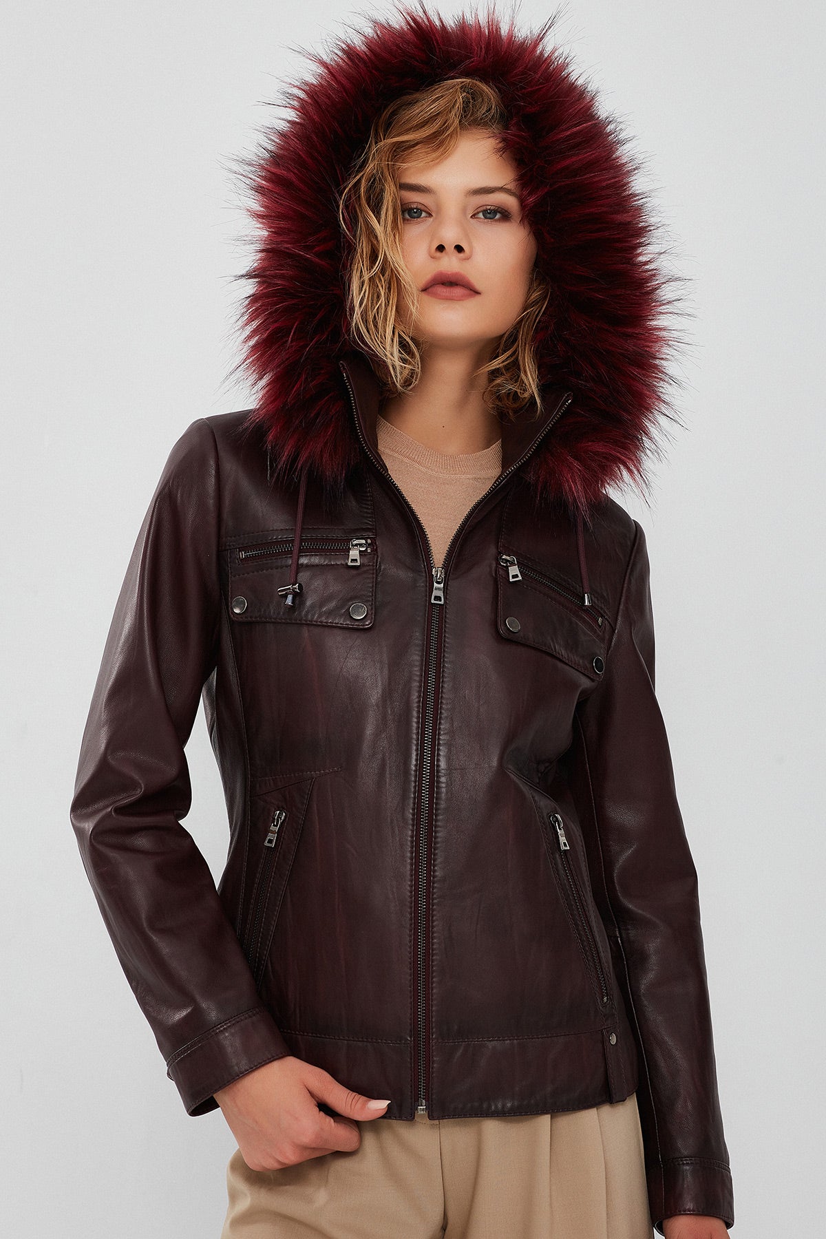 Derimod’un Zarif ve Şıklığı bir arada sunan Monica Kadın Bordo Kapüşonlu Kürklü Deri Ceket ile tarzınızı konuşturun. Ürünün kodu: 23WGE5121NC 66