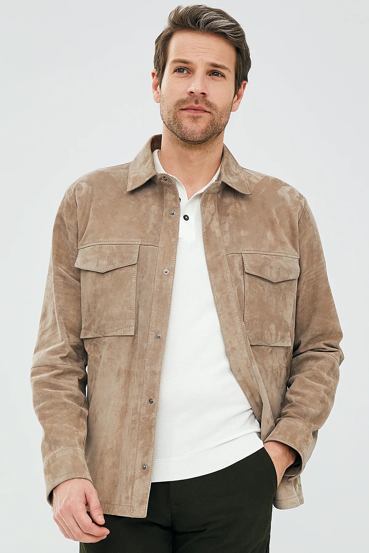 Derimod’un Zarif ve Şıklığı bir arada sunan Navas Erkek Bej Gömlek Tipi Çıtçıtlı Süet Deri Ceket ile tarzınızı konuşturun. Ürünün kodu: 23SGD648310 04