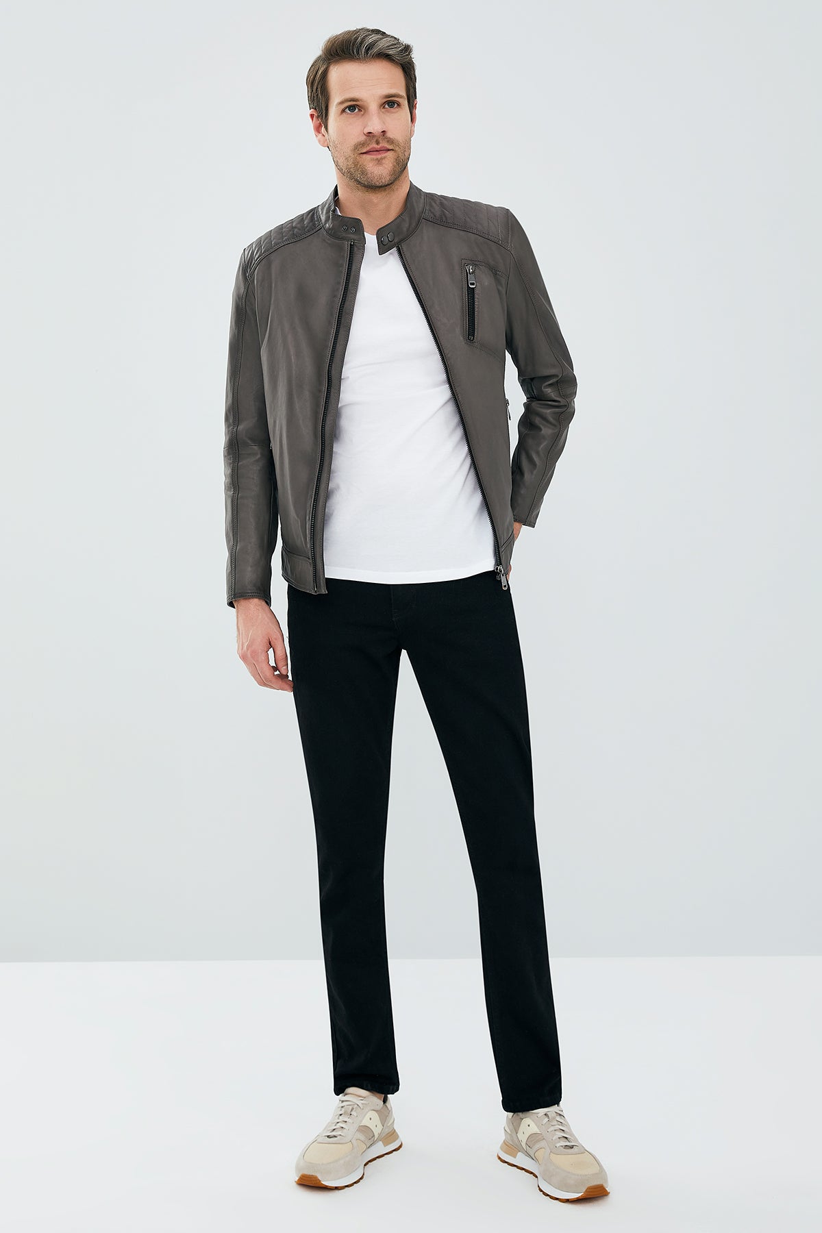 New Durant Erkek Gri Slim-Fit Deri Ceket