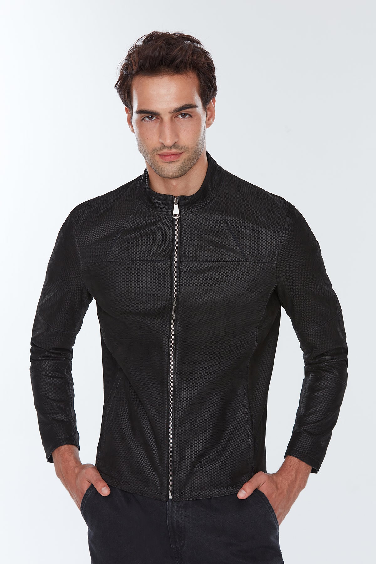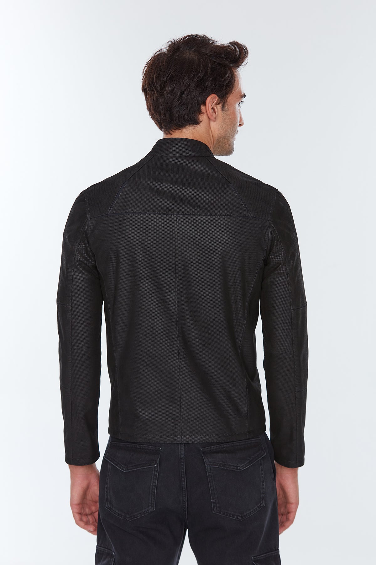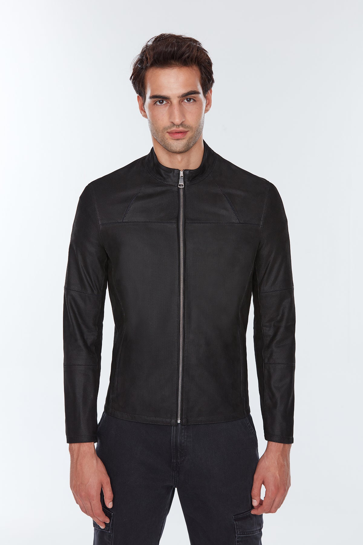 Neymar Erkek Siyah Süet Baskılı Slim-Fit Kısa Deri Ceket