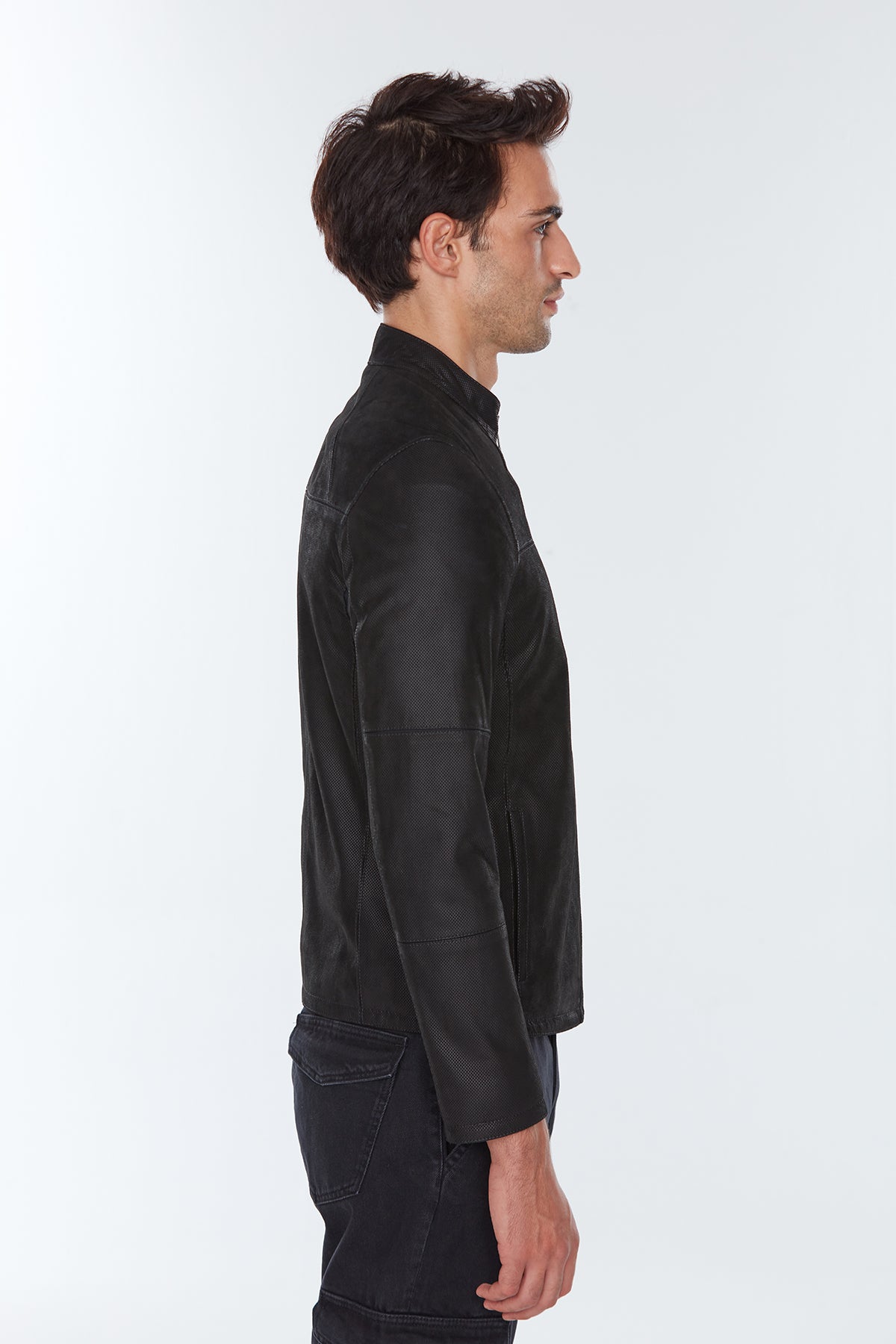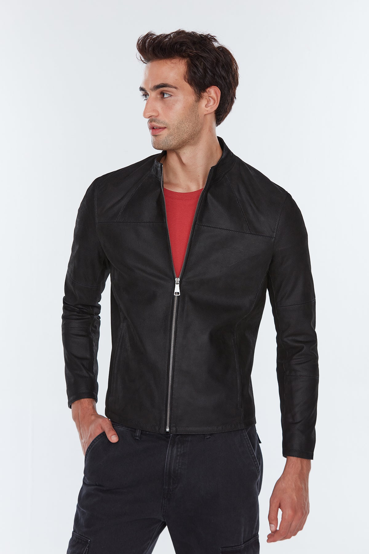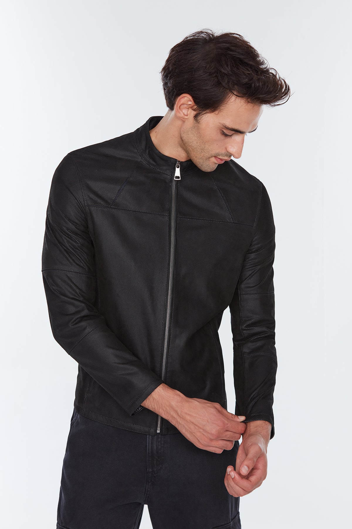 Neymar Erkek Siyah Süet Baskılı Slim-Fit Kısa Deri Ceket