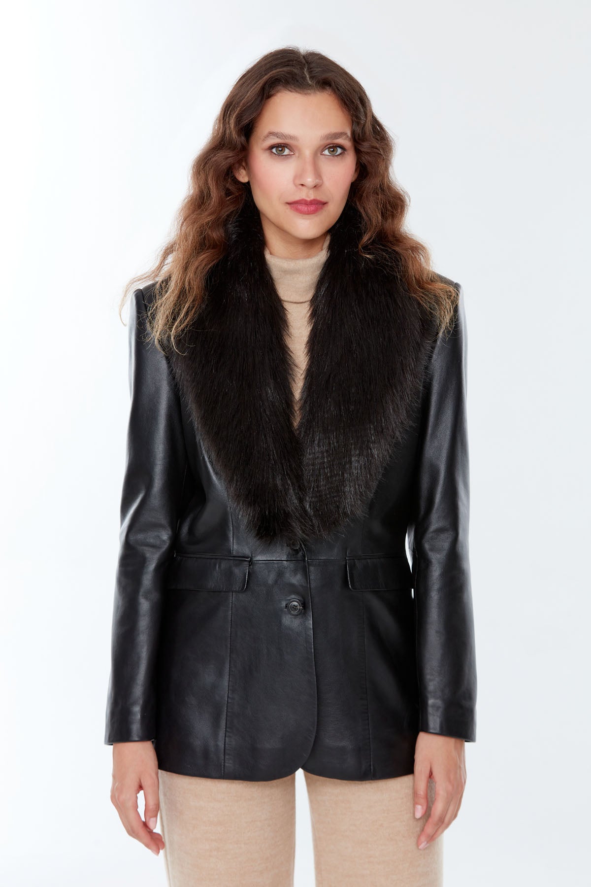 Noella Kadın Siyah Kürklü Blazer Deri Ceket
