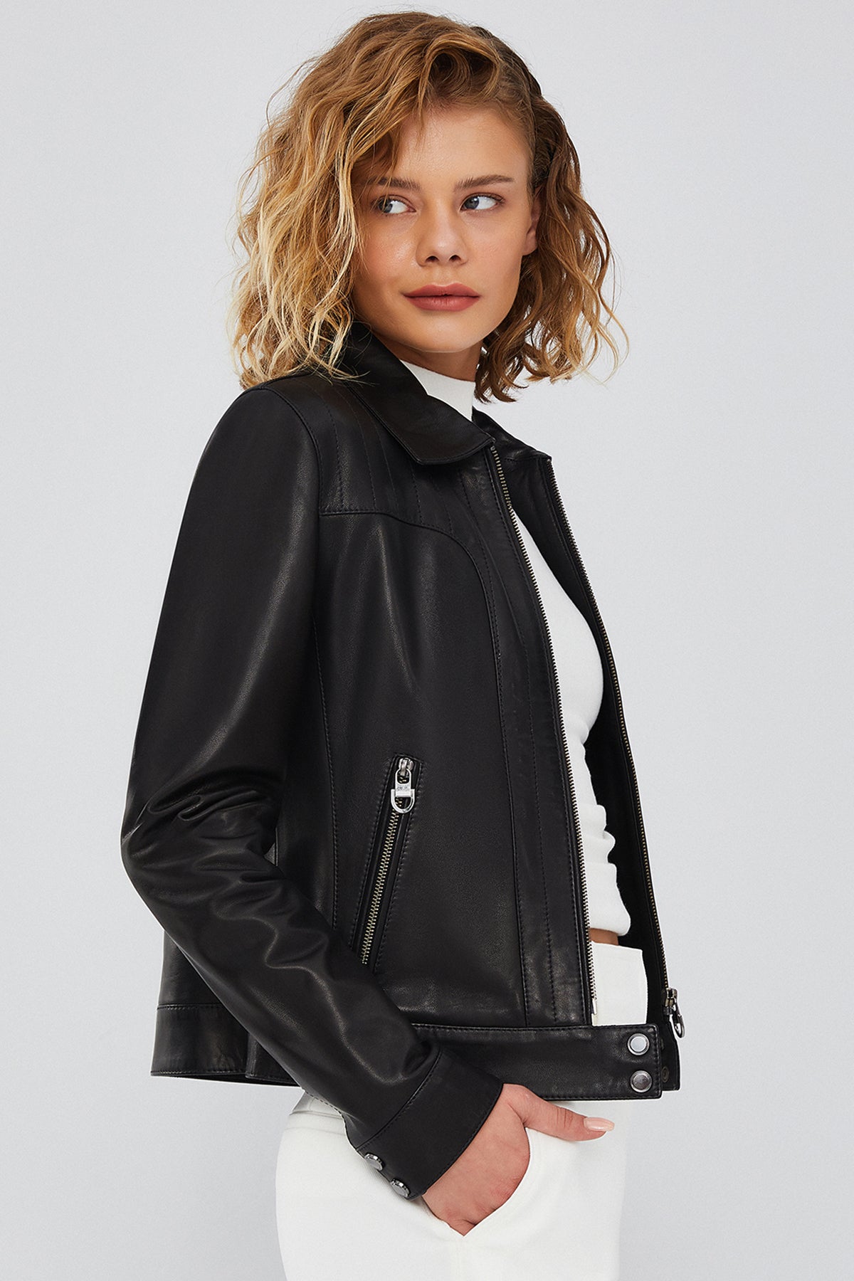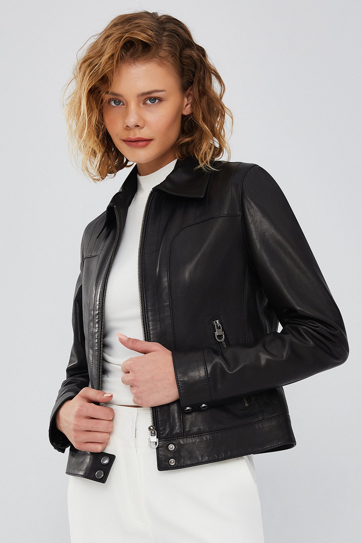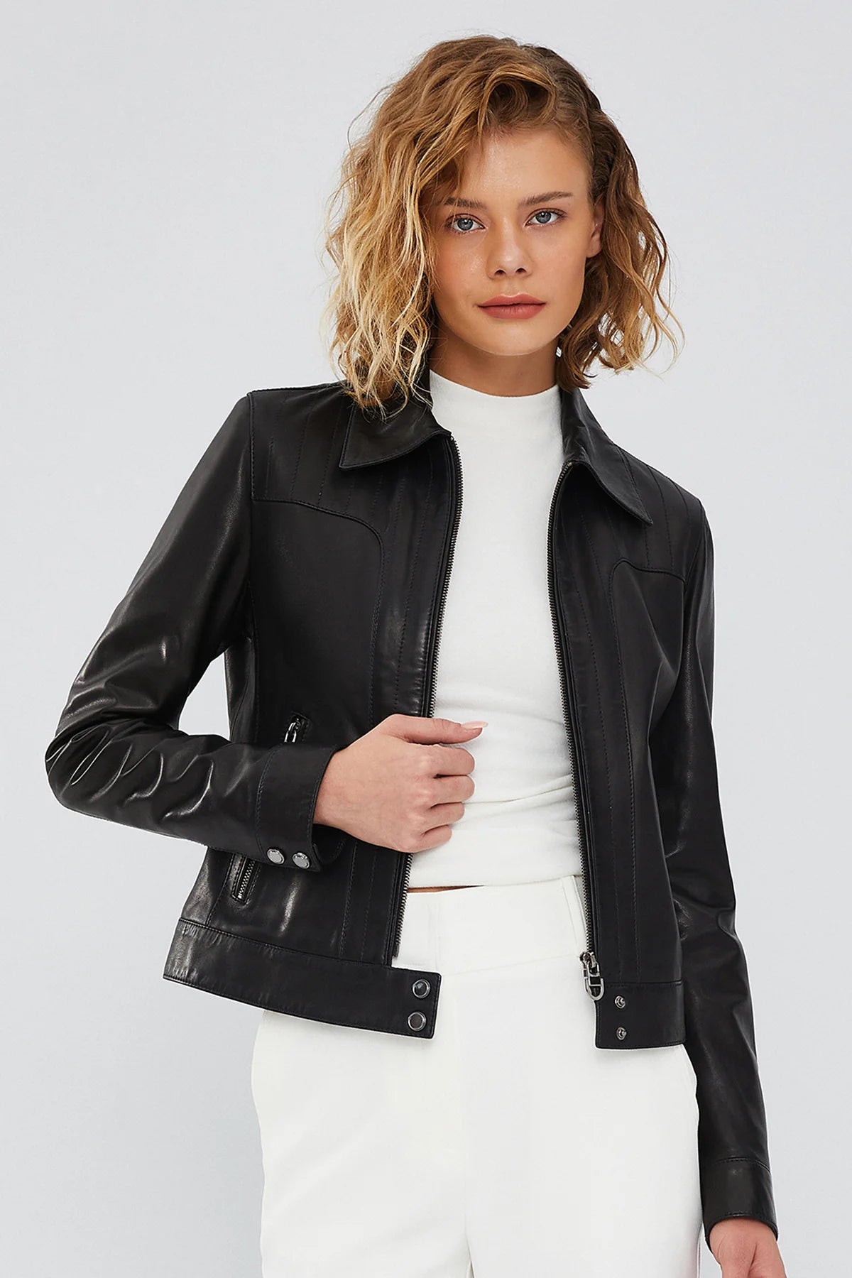 Derimod’un Zarif ve Şıklığı bir arada sunan Olympia Kadın Siyah Kısa Deri Ceket ile tarzınızı konuşturun. Ürünün kodu: 23WGD5105VE 4A