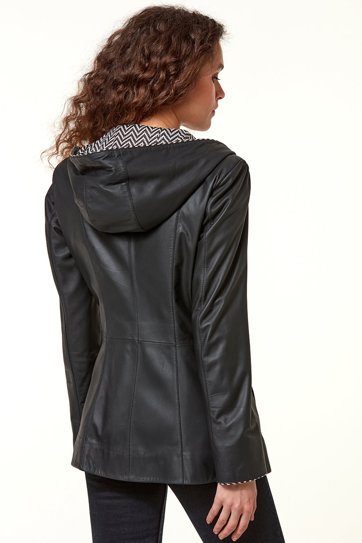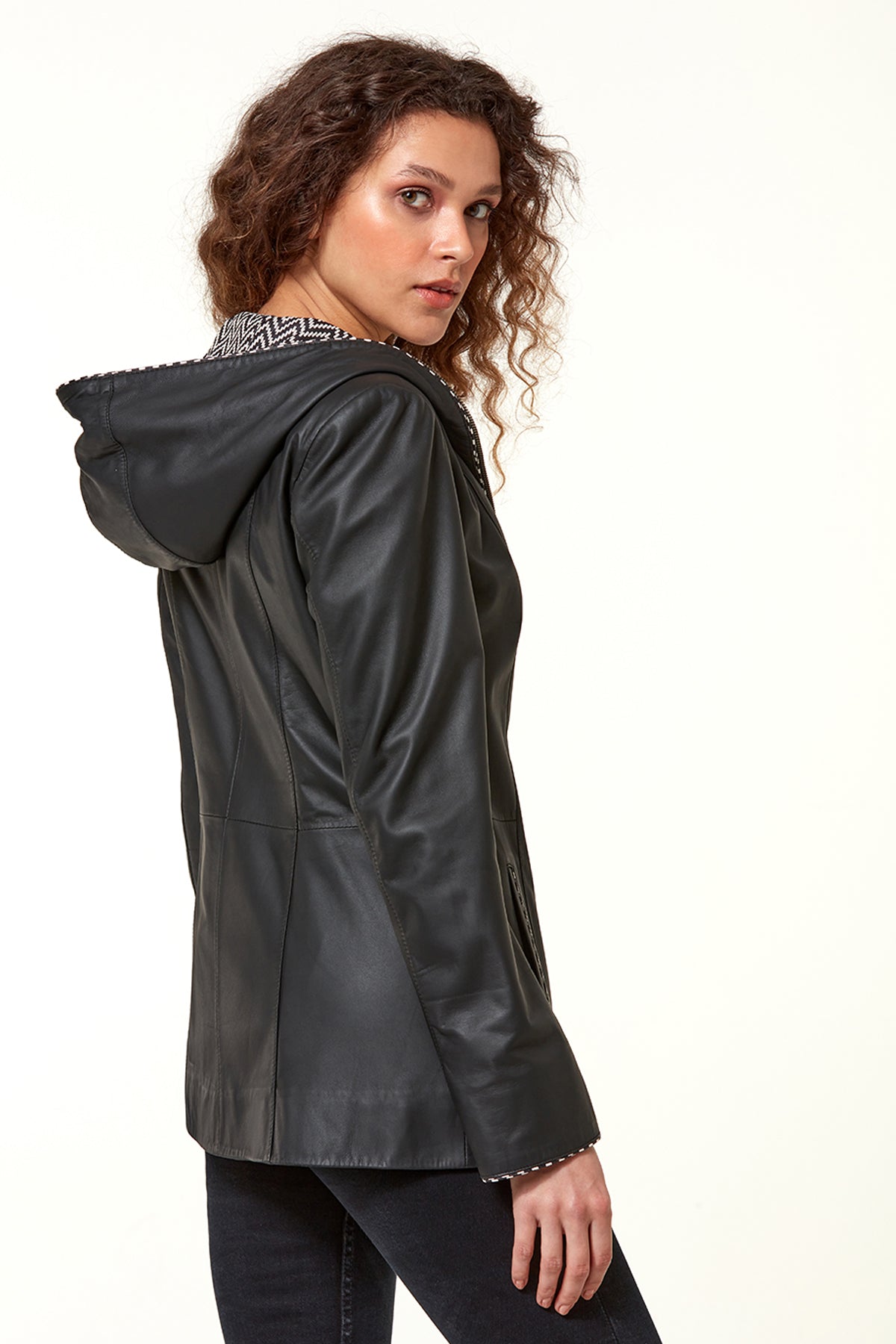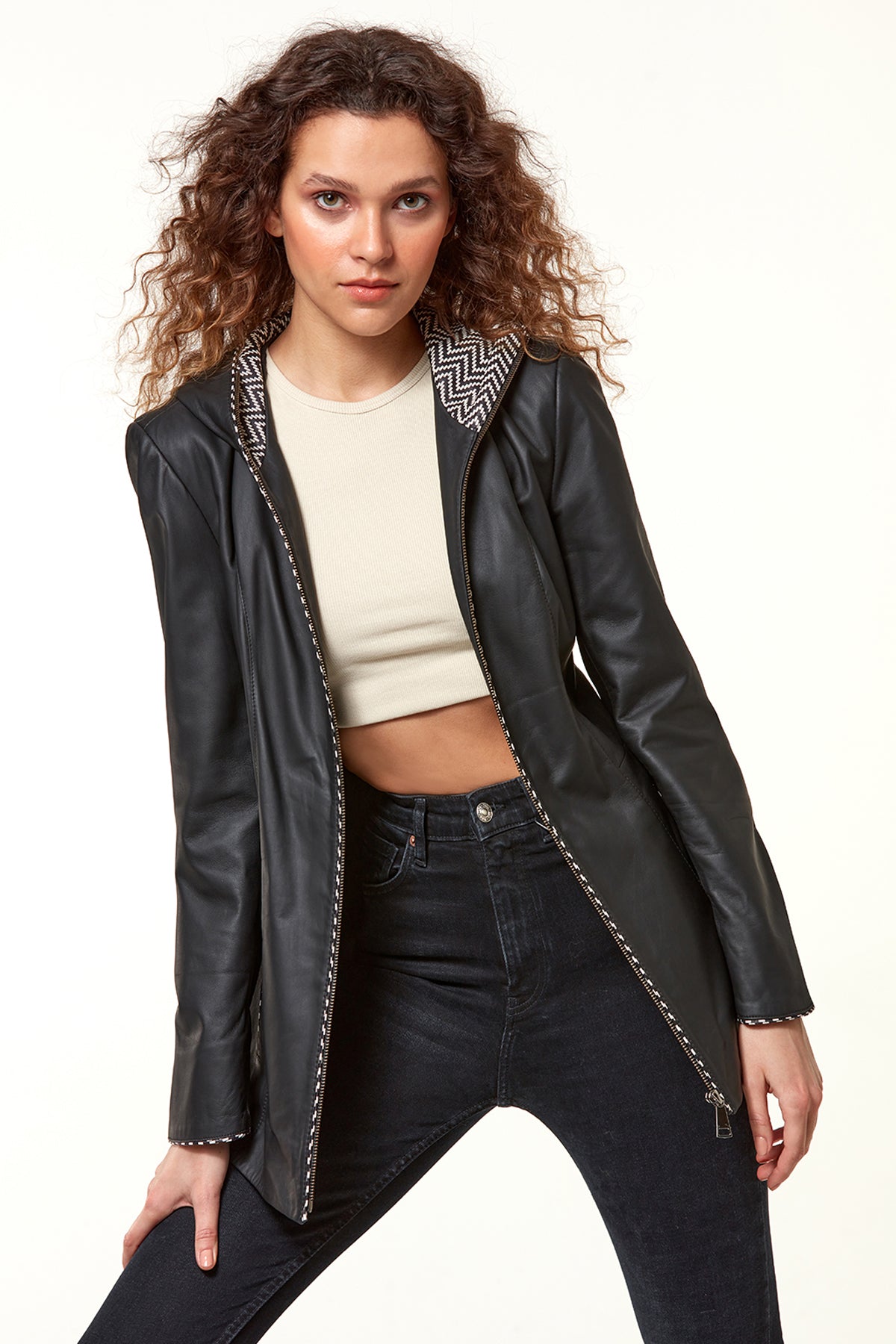 Pamela Kadın Siyah Kapüşonlu Uzun Deri Ceket