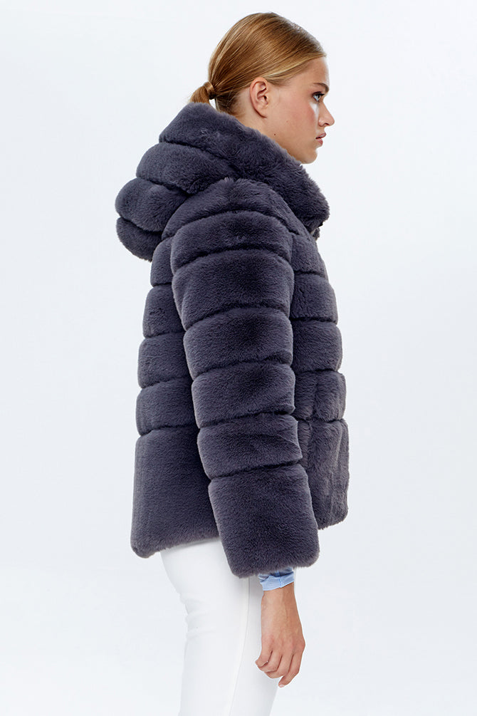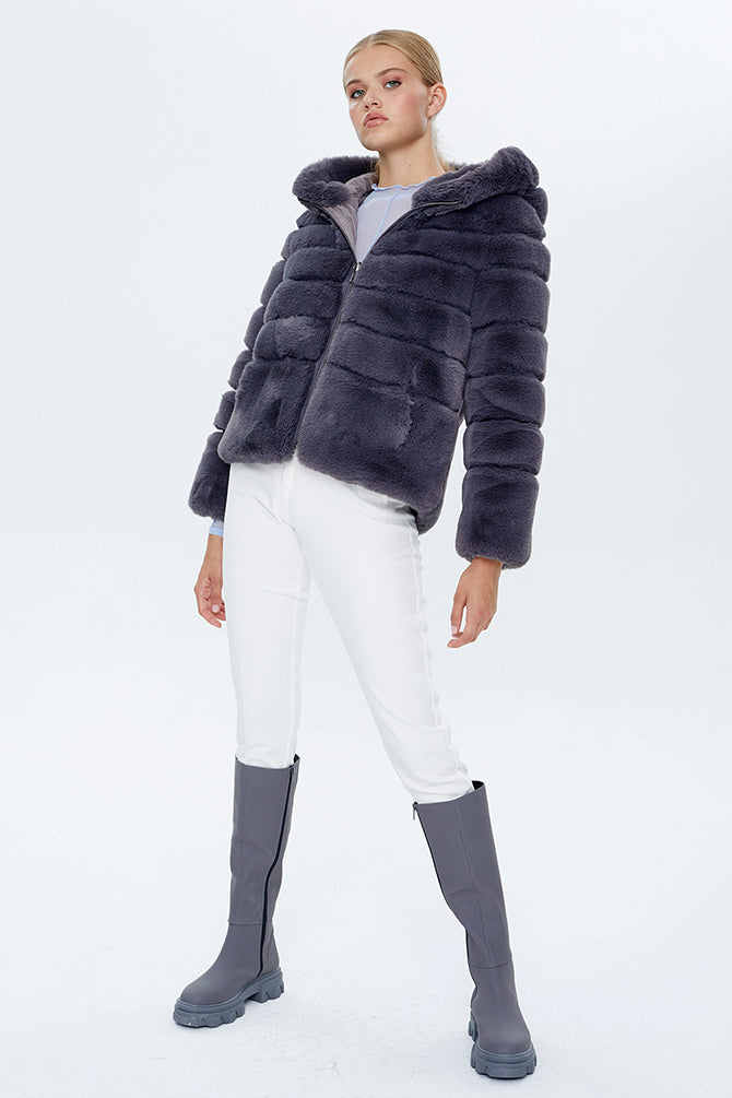 Pavia Kadın Antrasit Kapüşonlu Peluş Deri Mont