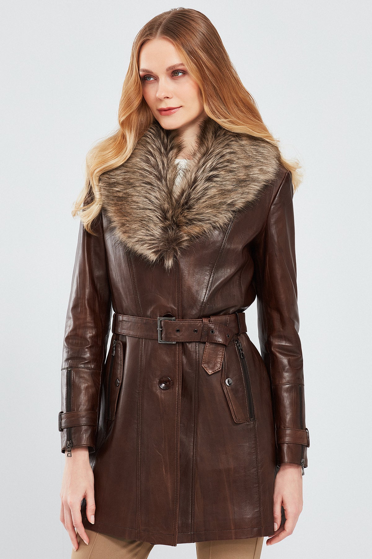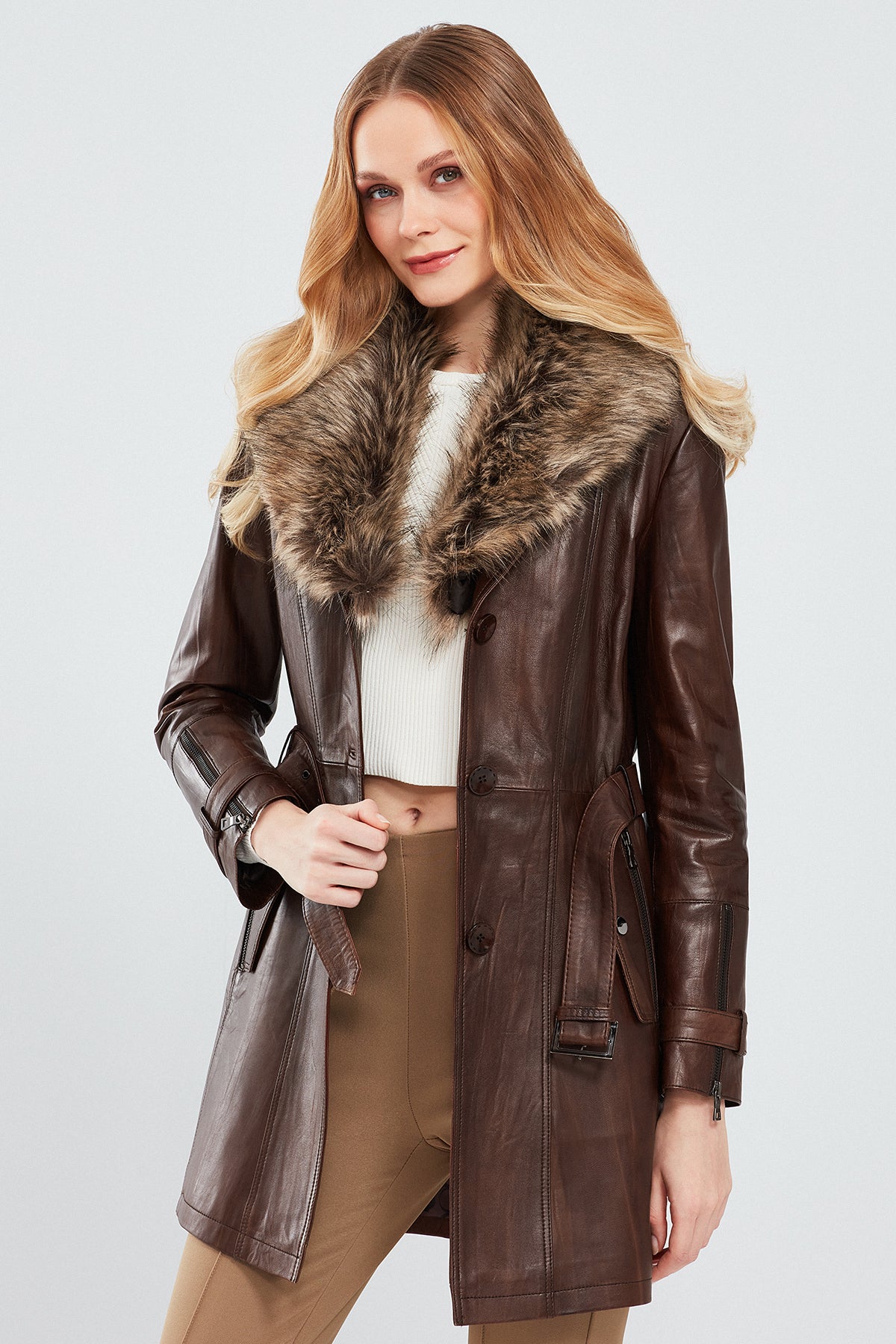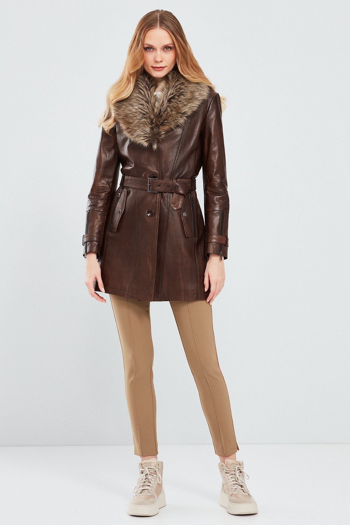 Derimod’un Zarif ve Şıklığı bir arada sunan Rhoda Kadın Kahverengi Kürklü Deri Trençkot ile tarzınızı konuşturun. Ürünün kodu: 20WGE5886NC 25