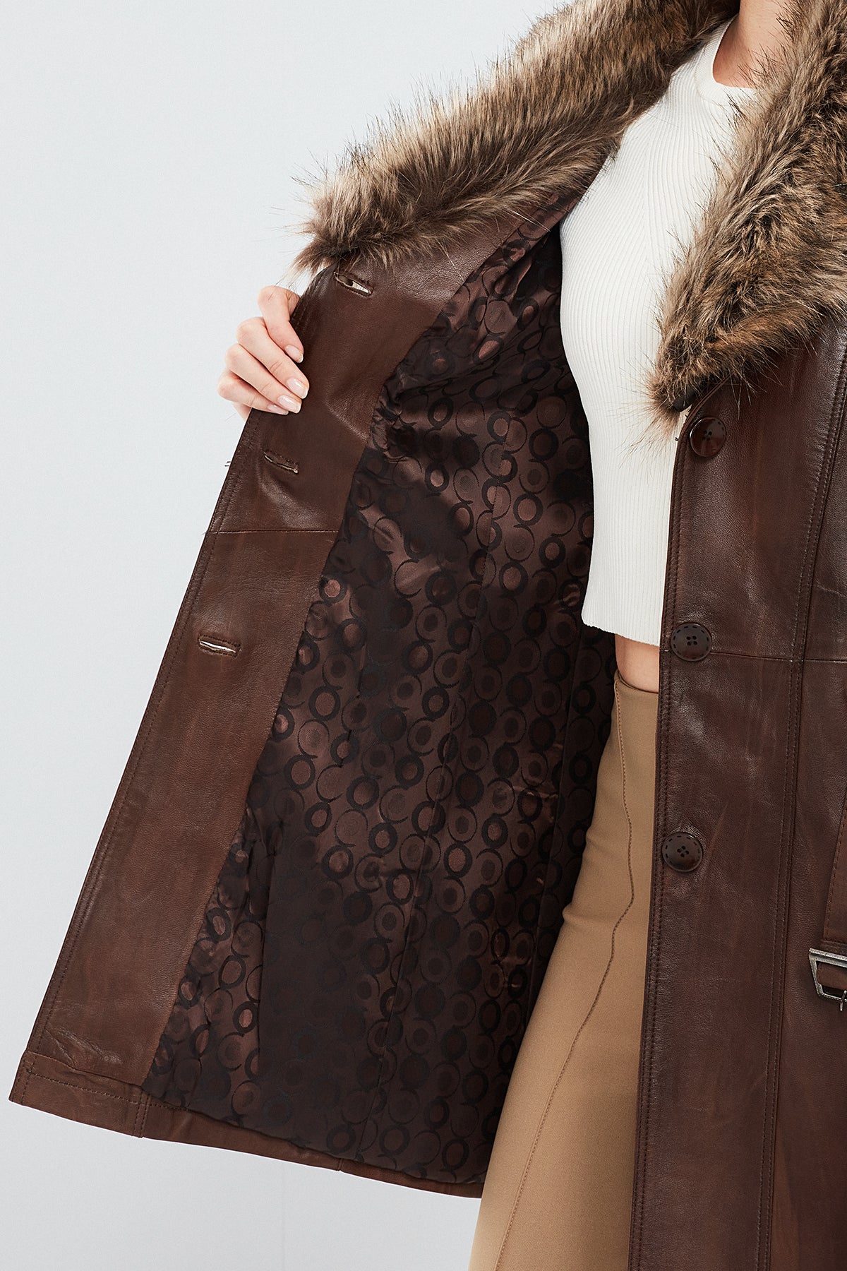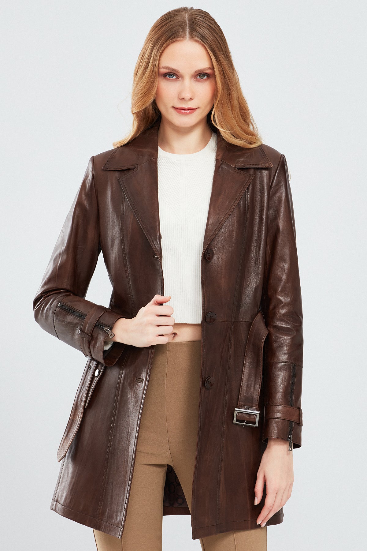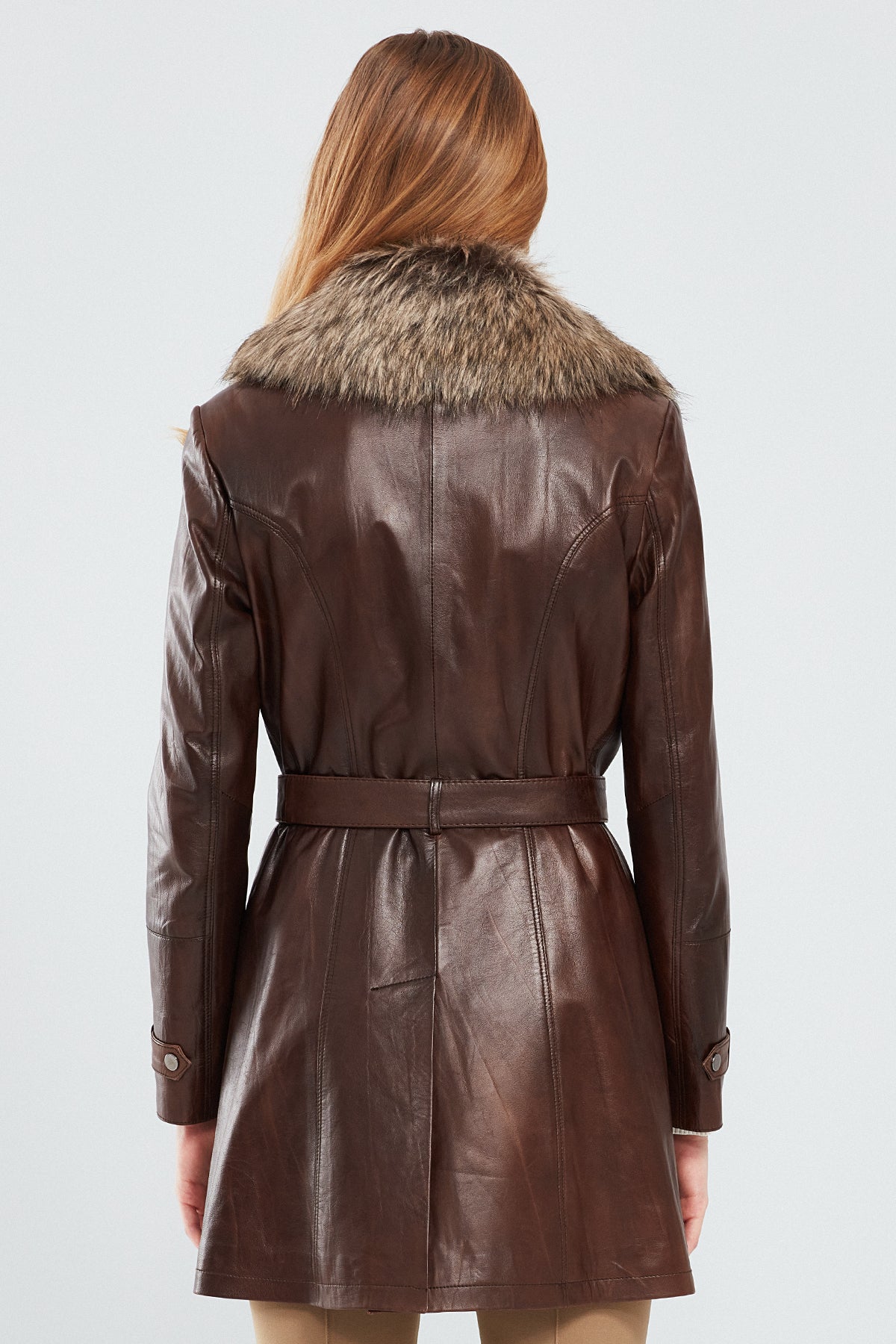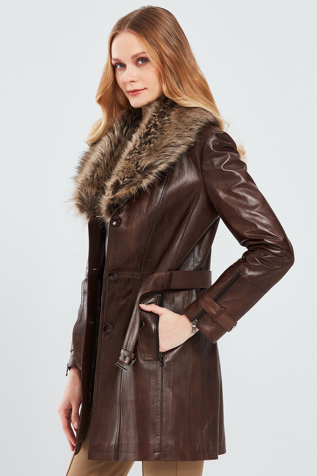 Derimod’un Zarif ve Şıklığı bir arada sunan Rhoda Kadın Kahverengi Kürklü Deri Trençkot ile tarzınızı konuşturun. Ürünün kodu: 20WGE5886NC 25