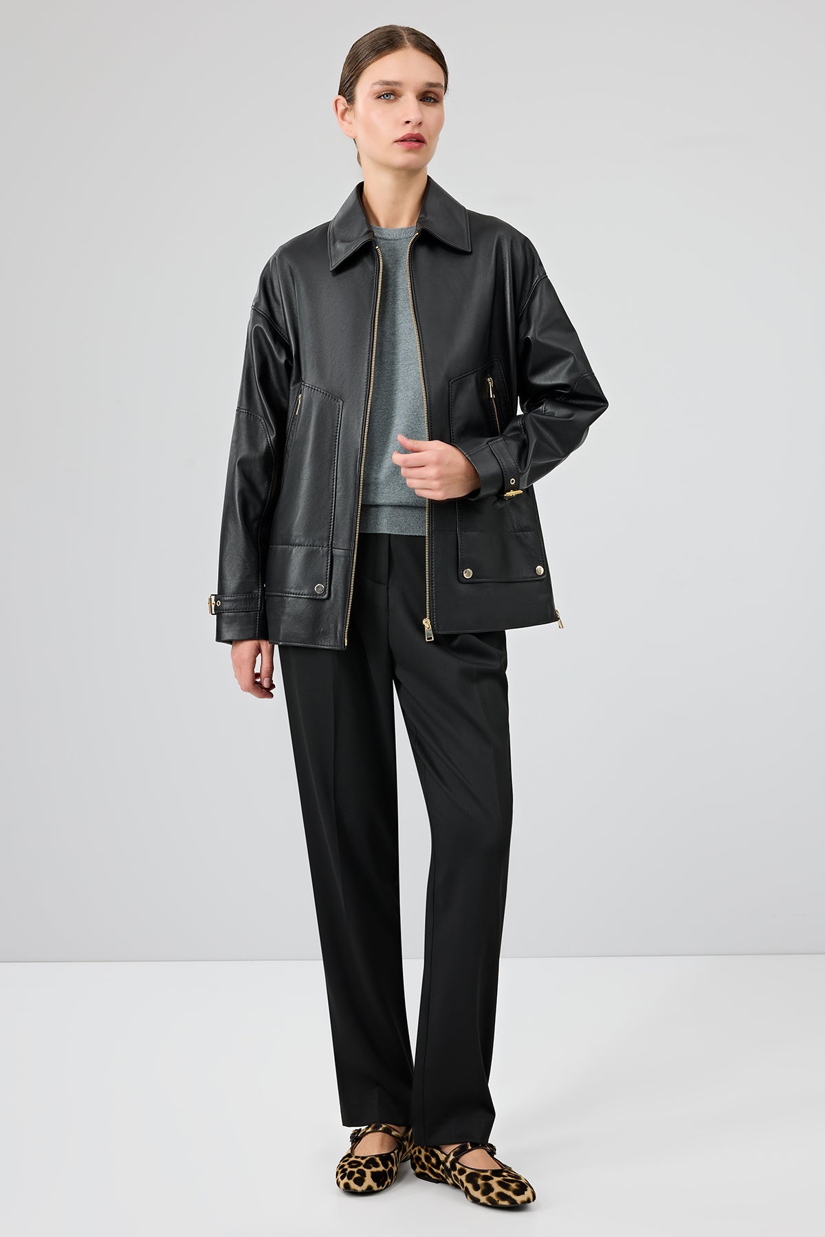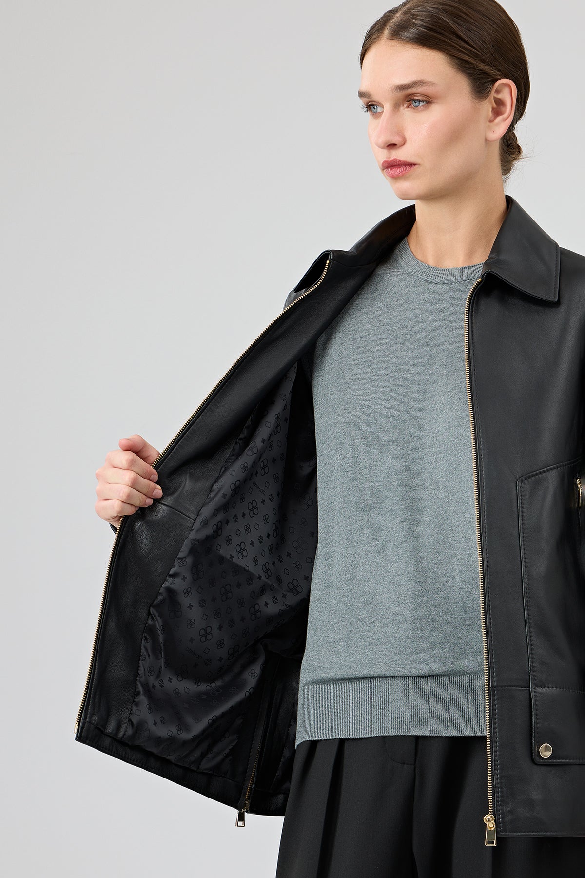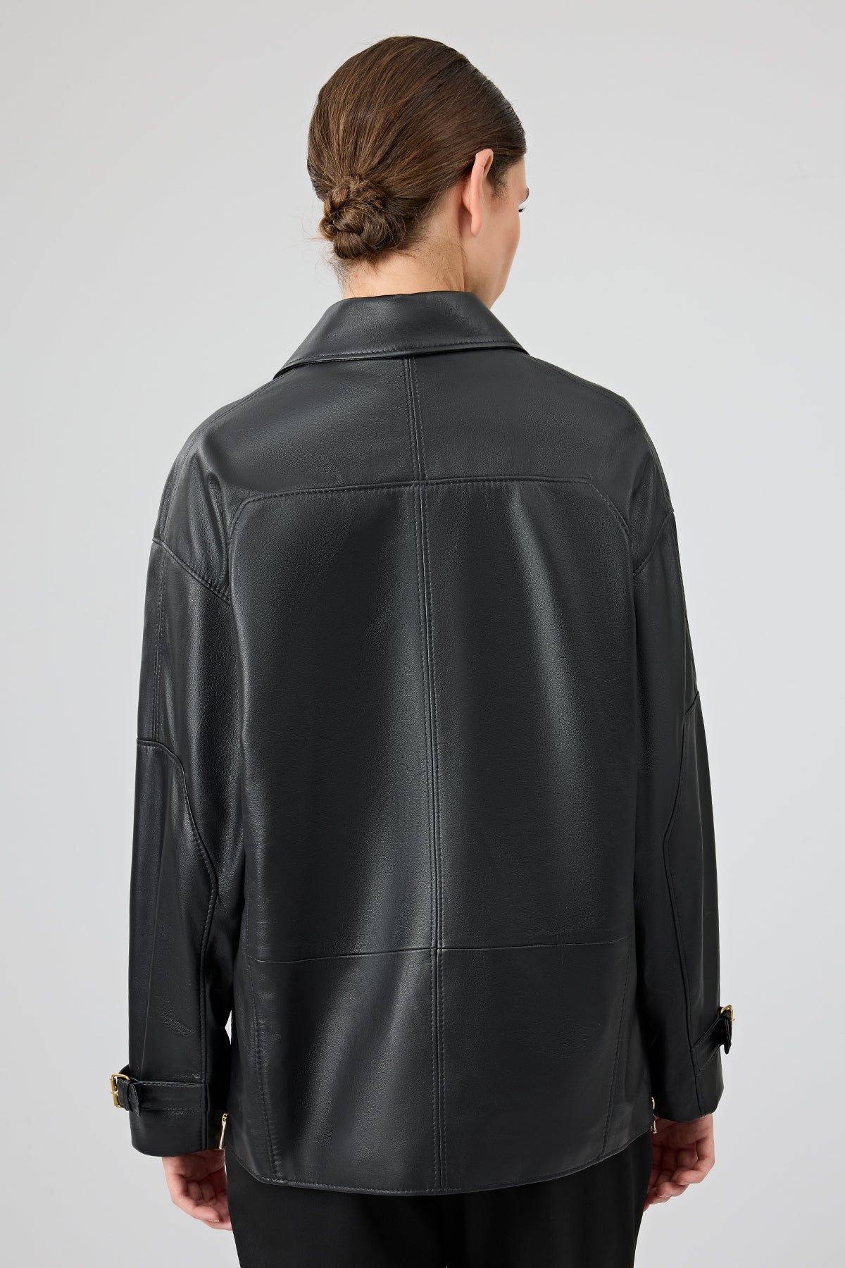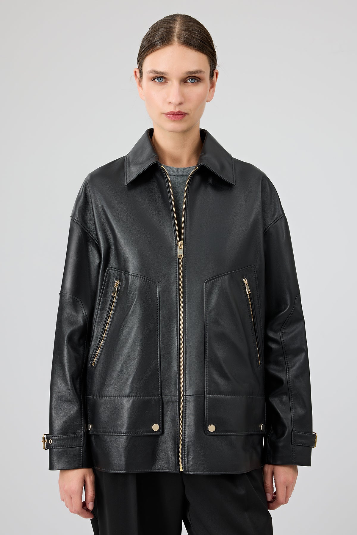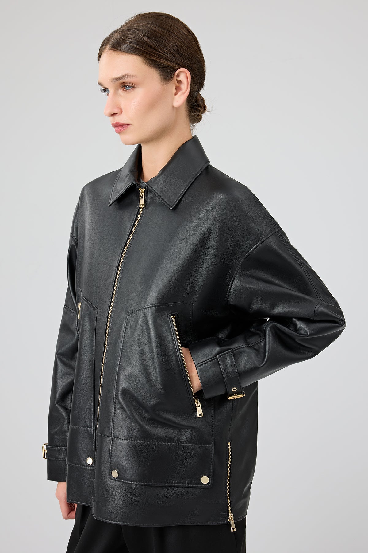 Derimod’un Zarifliği ve Şıklığı bir arada sunan Rosalin Kadın Siyah Gömlek Yaka Oversize Deri Mont ile tarzınızı konuşturun. Ürünün kodu: 25WGE53271M 11