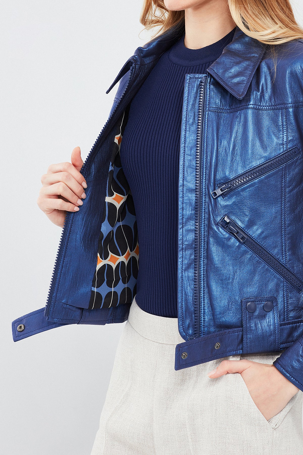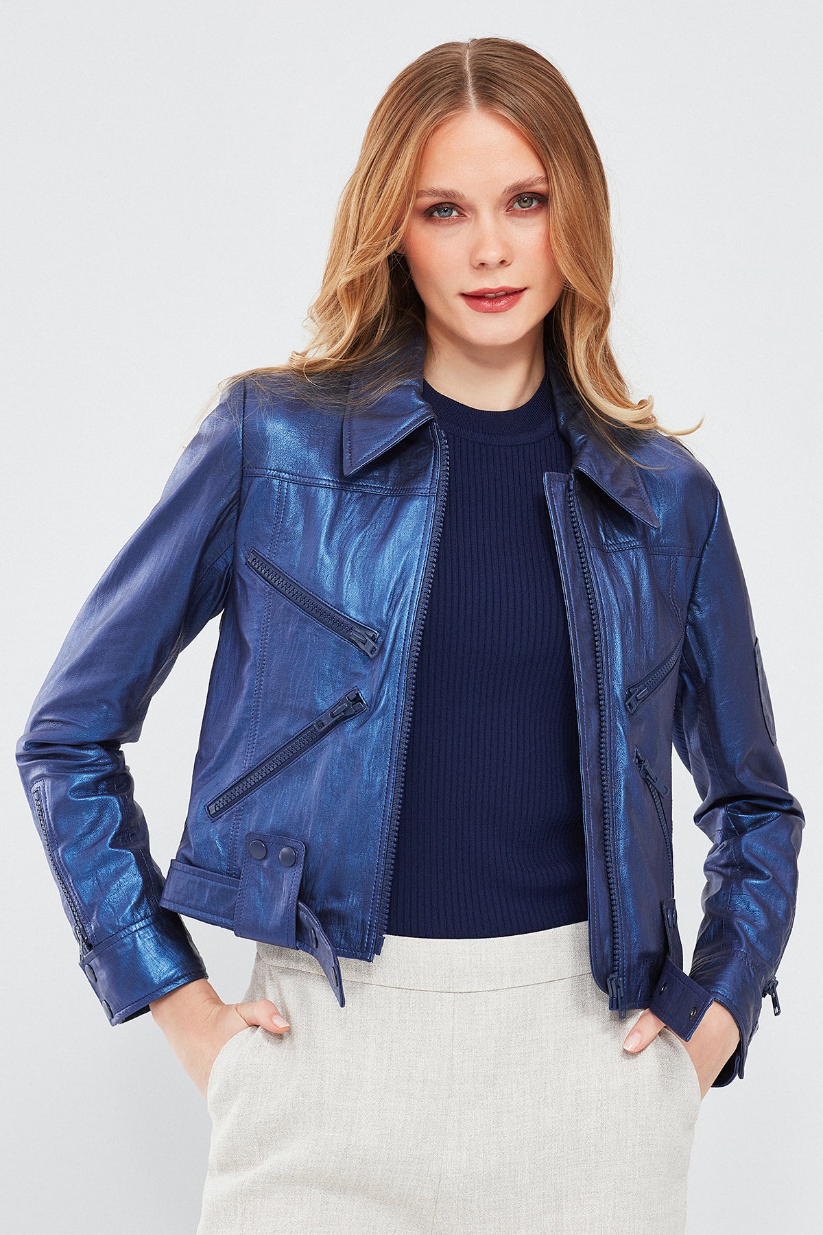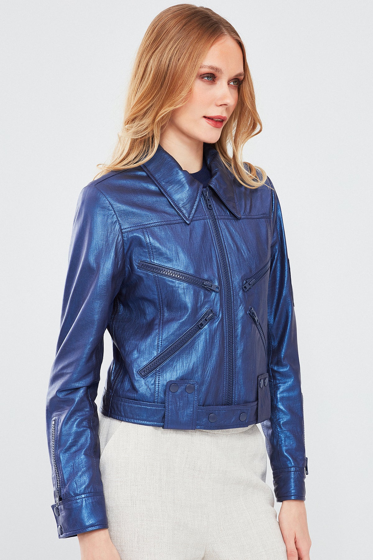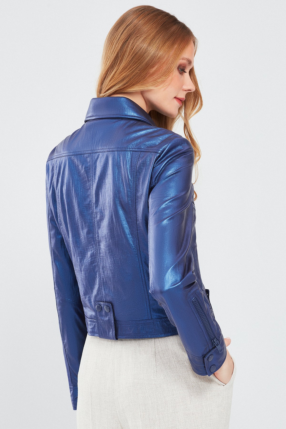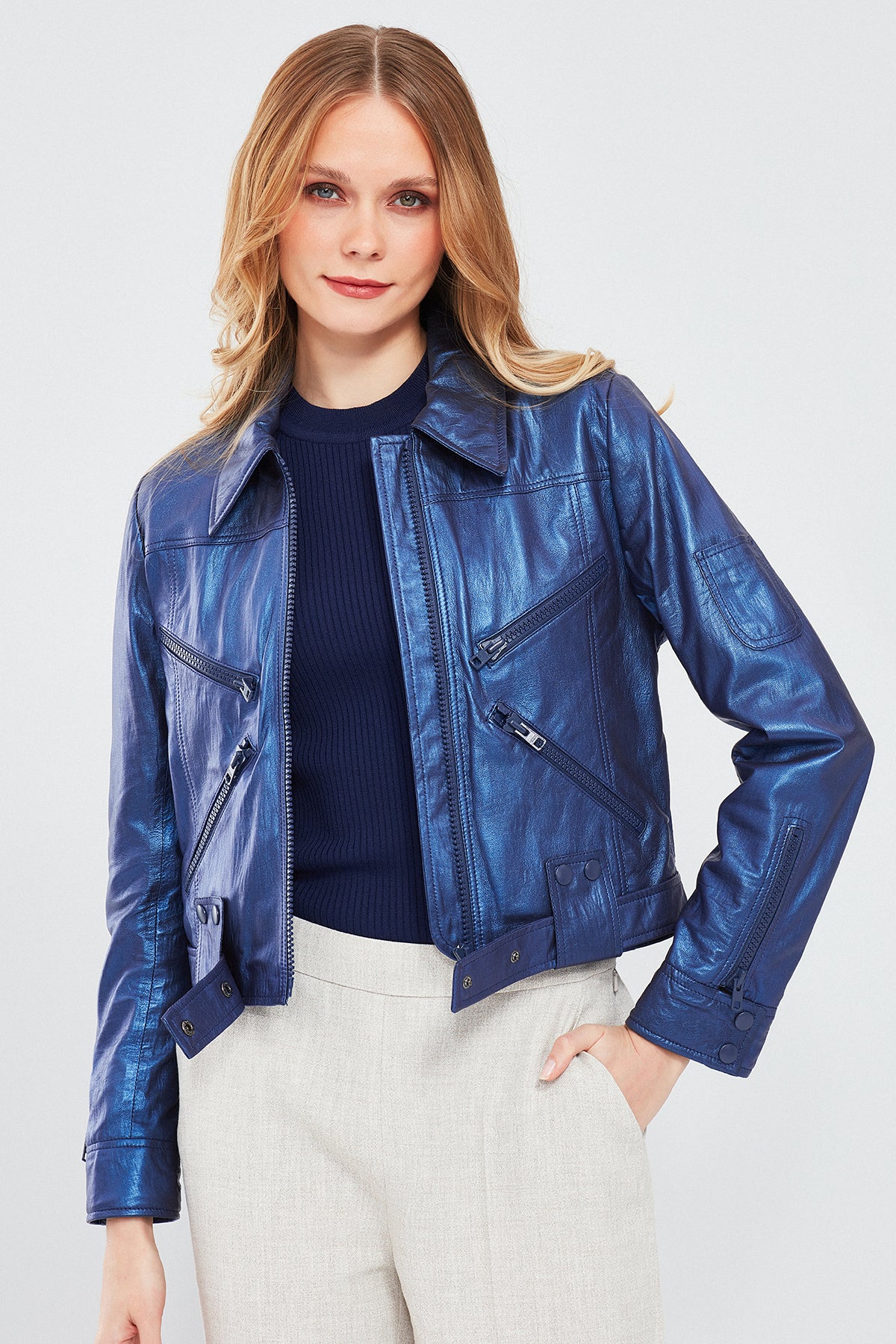 Derimod'un Sirena Kadın Lacivert Deri Ceket'i, göz alıcı metalik lacivert renkte ve parlak bir bitişle dikkat çeker. Çoklu fermuarları ve belde düğmeli klapası ile fonksiyonel detaylar sunar. Hakiki deriden üretilmiş olan bu ceket, İç kısmında yer alan astarı ile şıklığınızı öne taşırken hem dayanıklılık hem de konfor sağlar. Metalik lacivert tonu ile her türlü kombinle uyum sağlayarak sofistike bir stil vadediyor. Mevsim geçişlerinde farklı ve şık bir görünüm arayanlar için ideal bir seçenektir.