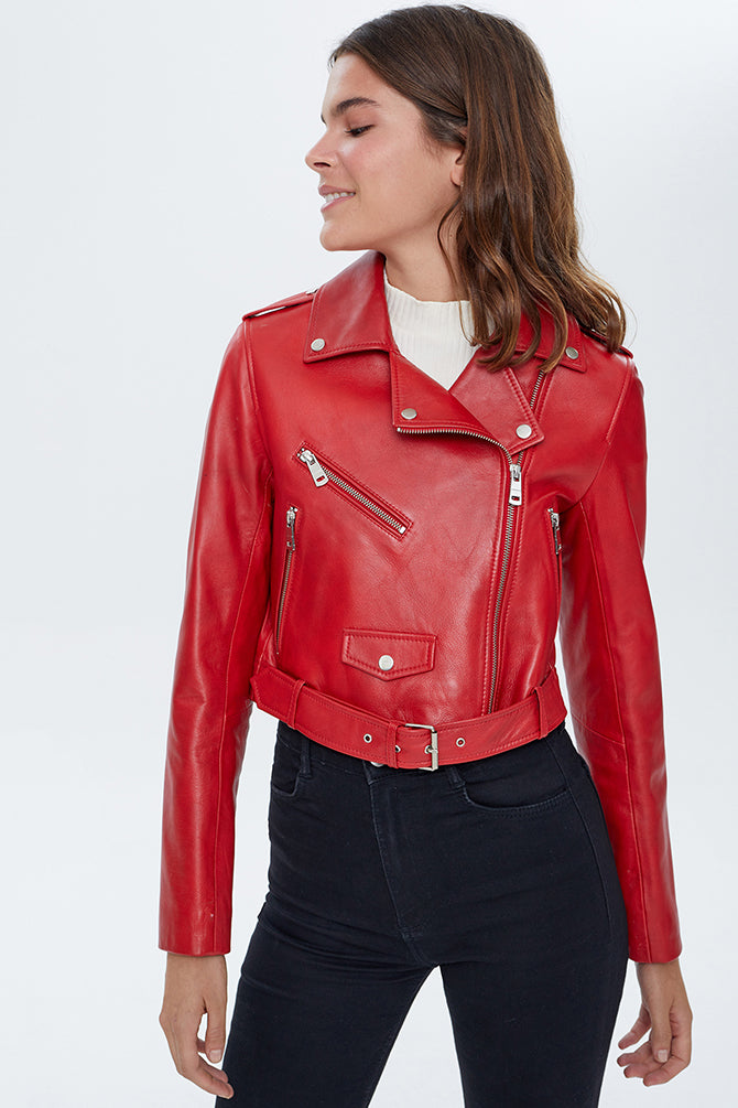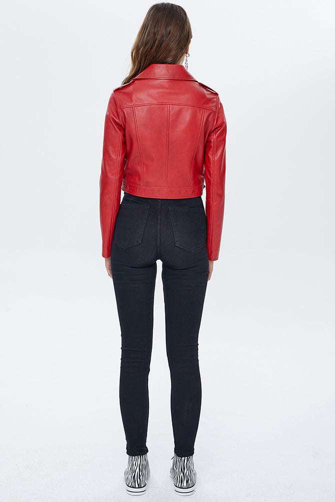 Star Kadın Kırmızı Kısa Deri Biker Ceket
