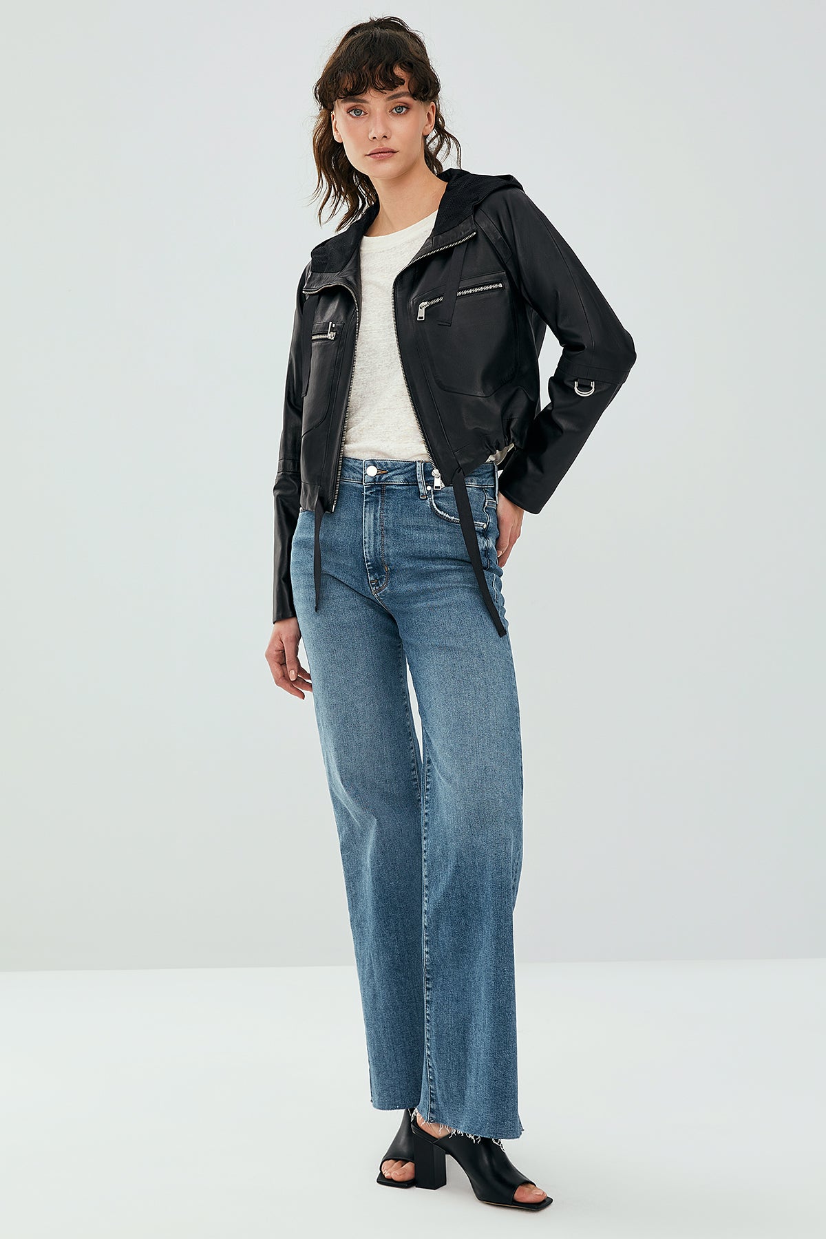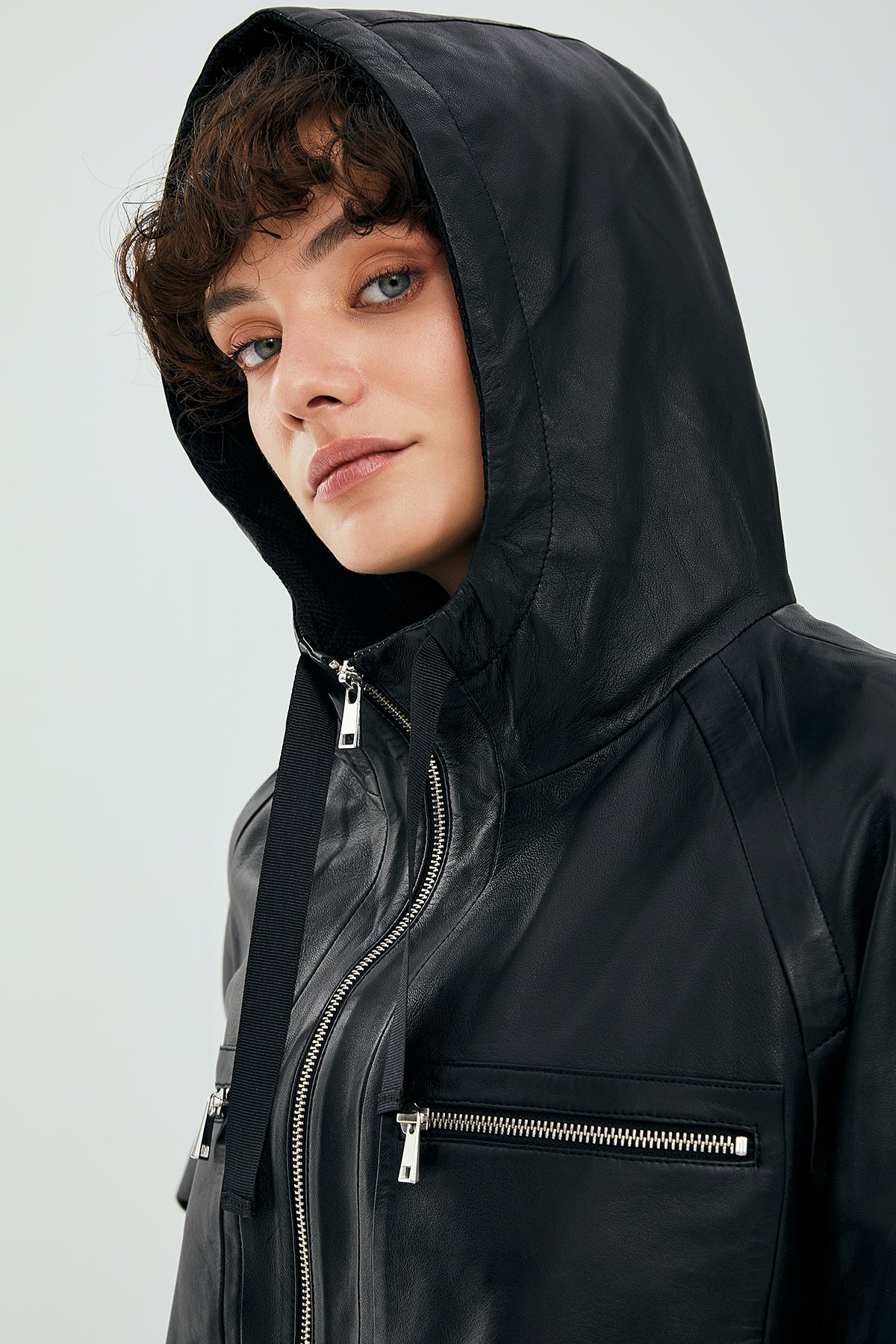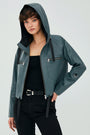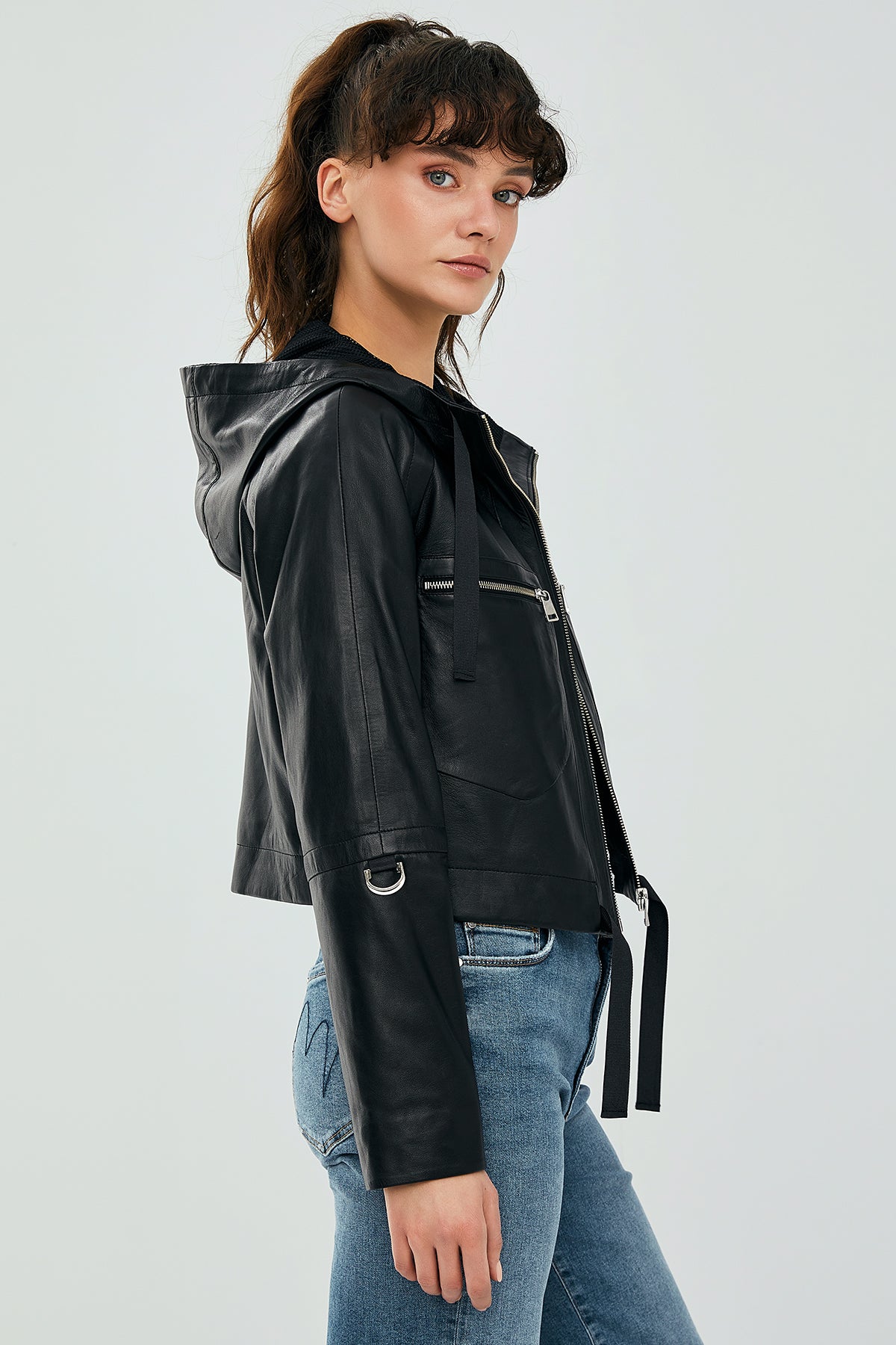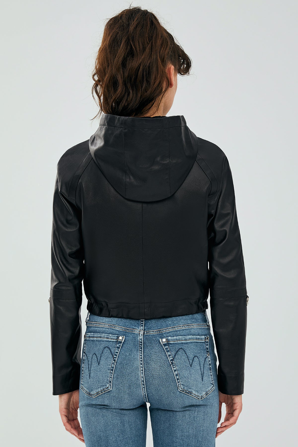 Stella Kadın Siyah Oversize Kapüşonlu Kısa Deri Ceket