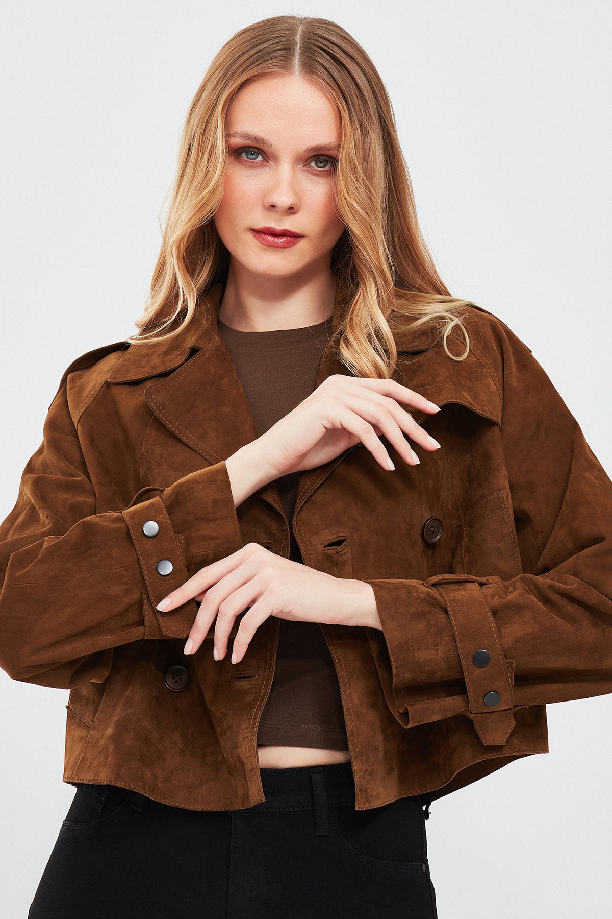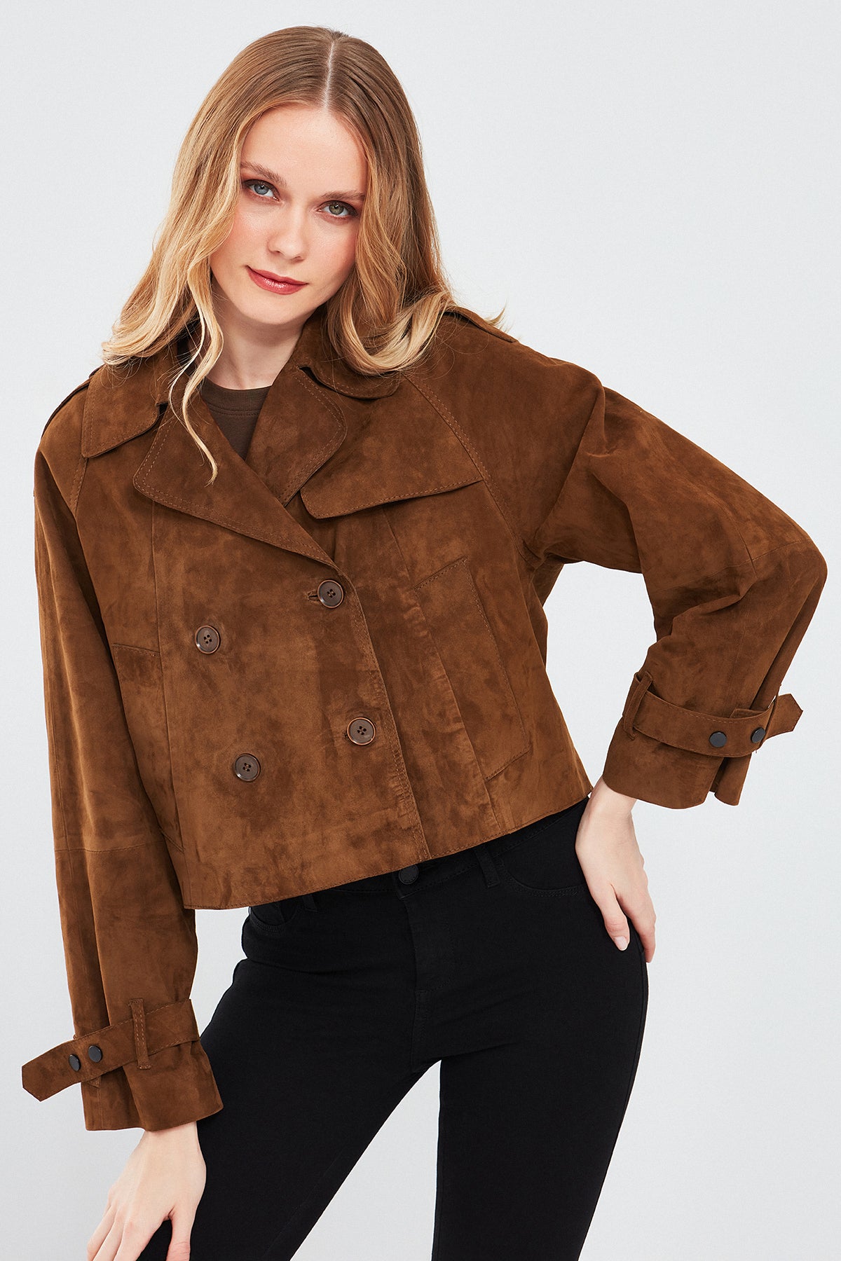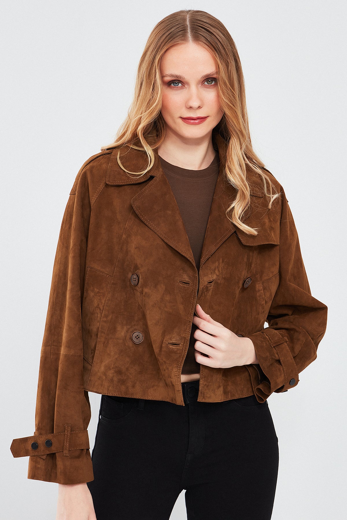 Derimod'un Tracy Kadın Kahverengi Kısa Süet Deri Montu, zarif ve şık bir görünüm sunar. Bu mont, yüksek kaliteli süet deri malzemesiyle üretilmiştir. Düğmeli kapama detayı ve kruvaze yaka ile tamamlanan bu model, modern ve şık bir tarz sunar. Kahverengi rengi, doğal ve sıcak bir ton içerir, kombinlerde kolaylıkla kullanılabilir. Süet deri malzemesi, montu yumuşak ve dokulu kılar, aynı zamanda şıklığı da vurgular. A form kalıbı, her bedene uyum sağlar ve rahat bir kullanım sunar. Tracy Kadın Kahverengi Kısa Süet Deri Montunun bileklerinde yer alan detaylar, monta ekstra bir şıklık katmaktadır. Bu detaylar, montu göz alıcı ve özgün kılar. Günlük kullanımdan özel günlerdeki kombinlerinize kadar geniş bir kullanım alanı sunar.