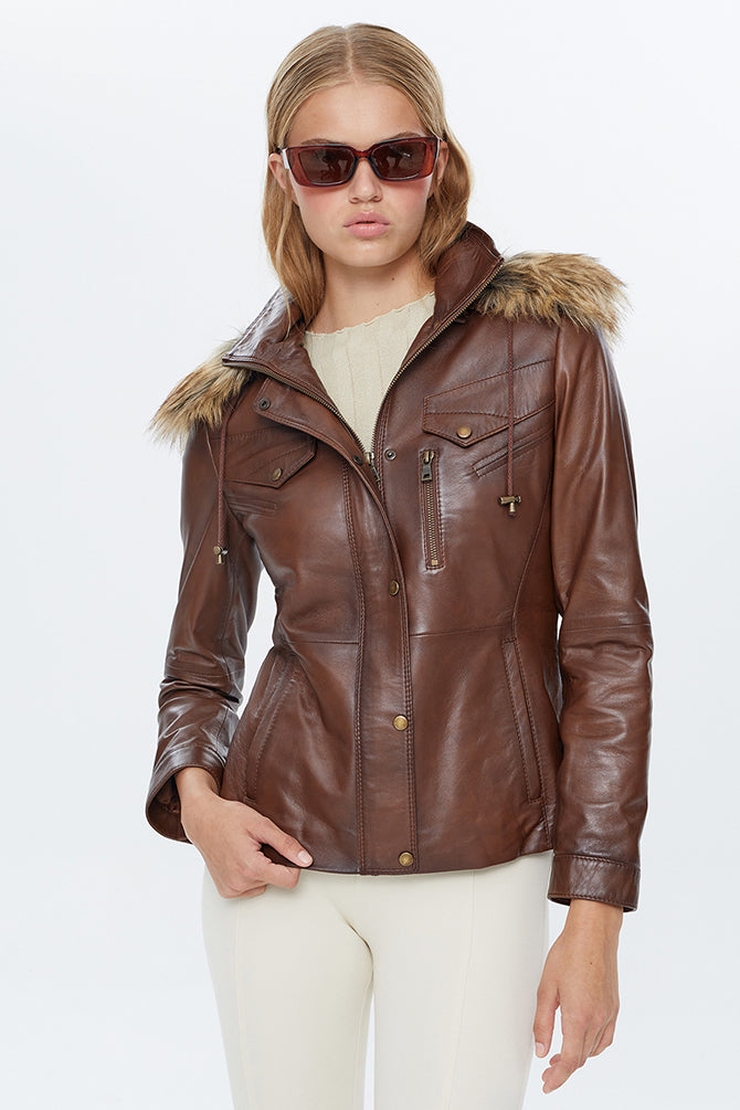 Vera Kadın Kahverengi Kapüşonlu Deri Mont