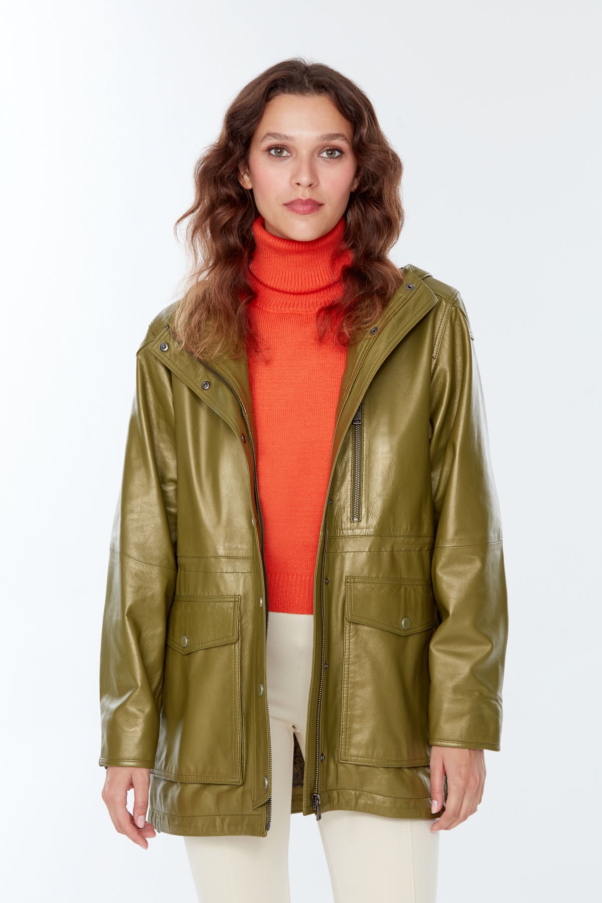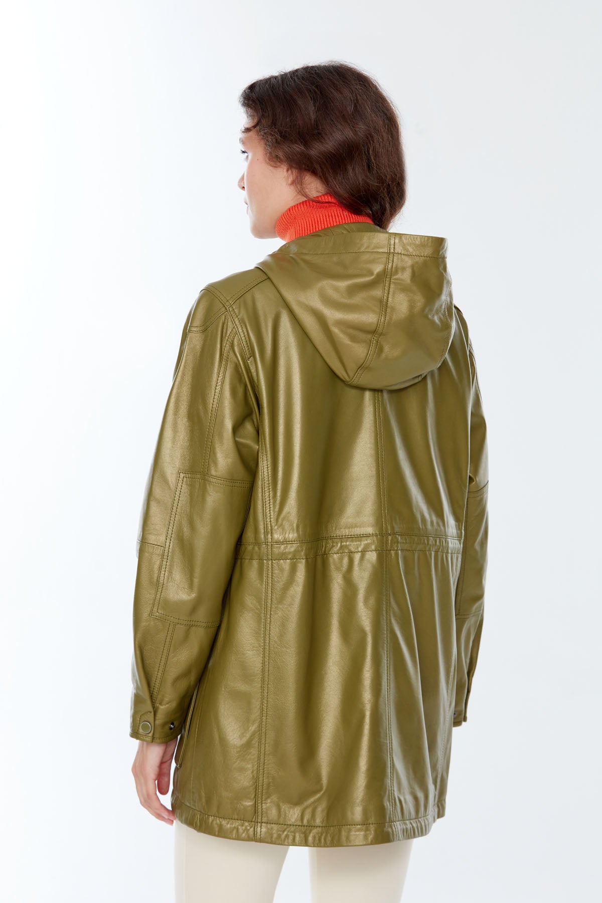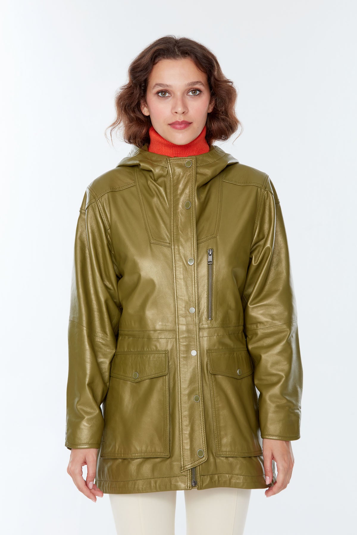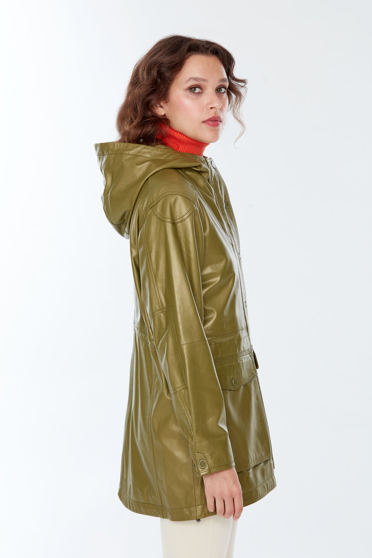 Victoria Kadın Haki Kapüşonlu Deri Kaban